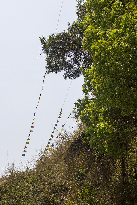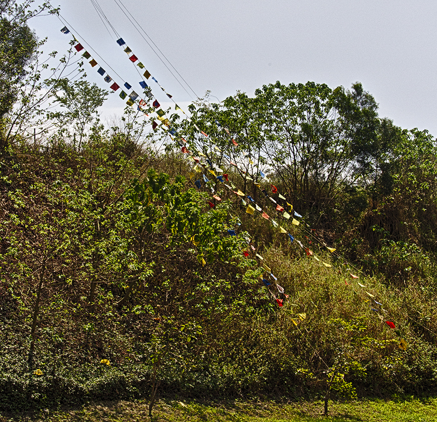 These photos show the finished installation “Healing the Earth – Nan Hua Prayer Flags” created during my two-week artist in residency at Nan Hua University, Chiayi County, Taiwan, March 15 – 28, 2014. The installation contains 250 handmade paper prayer flags, each a unique creation by the students and me during the residency project. The materials are all natural and biodegradable, and the installation will return to nature with no harm to the earth….in several weeks or months depending on the weather. I was pleased to learn that the flags are still looking good after a heavy rain and thunder storm over this past weekend. Handmade paper is amazingly strong and resilient, and these are still flying high with the good wishes of the participants at Nan Hua University. I will go back to Nan Hua University to give a lecture for their BioDiversity Day Celebration on May 24, so I will post again some updated photos of the installation in late May.