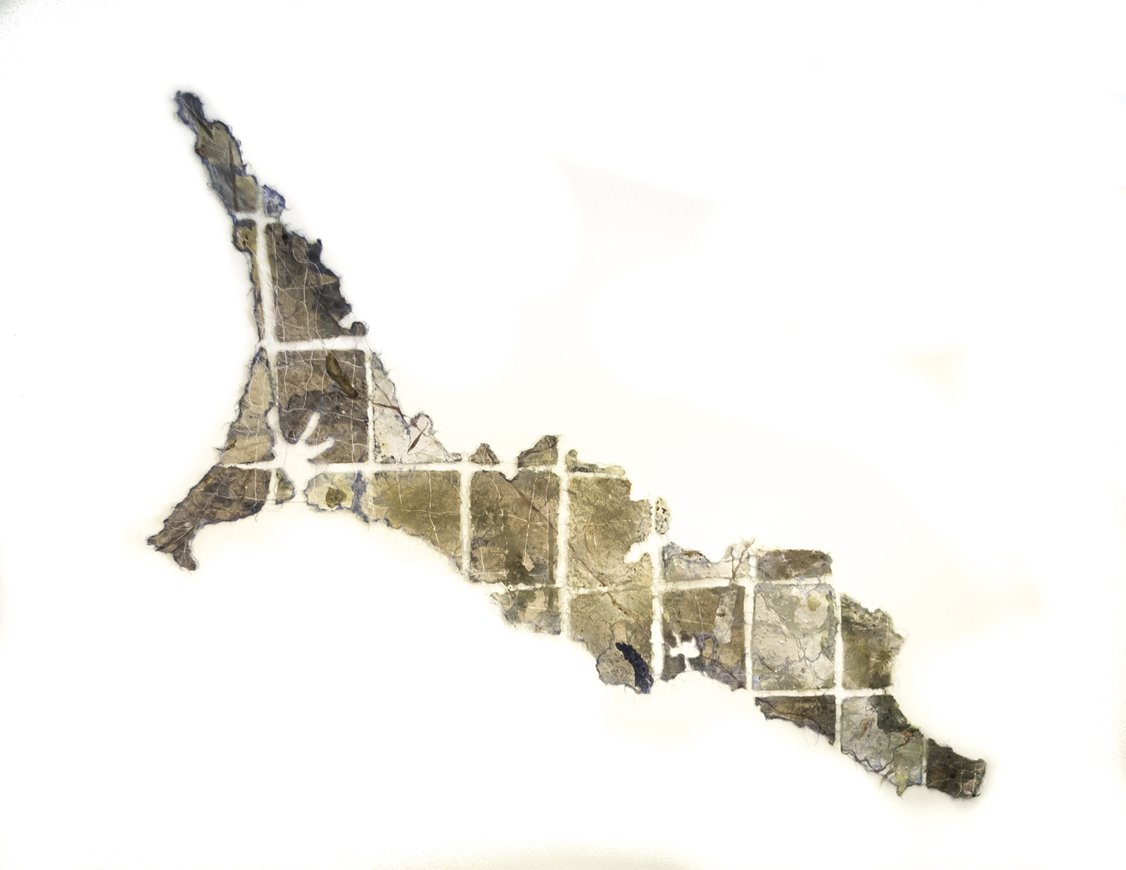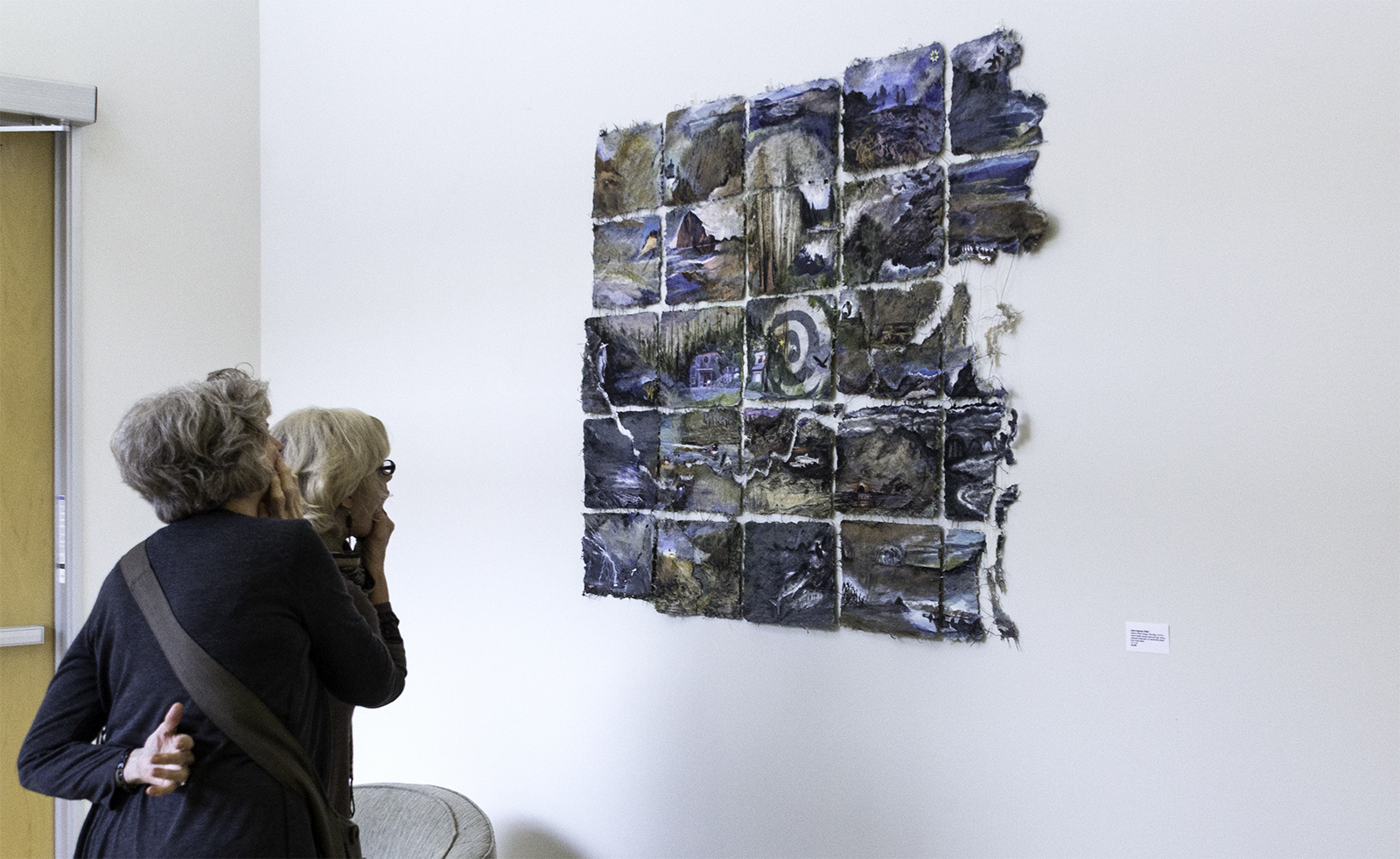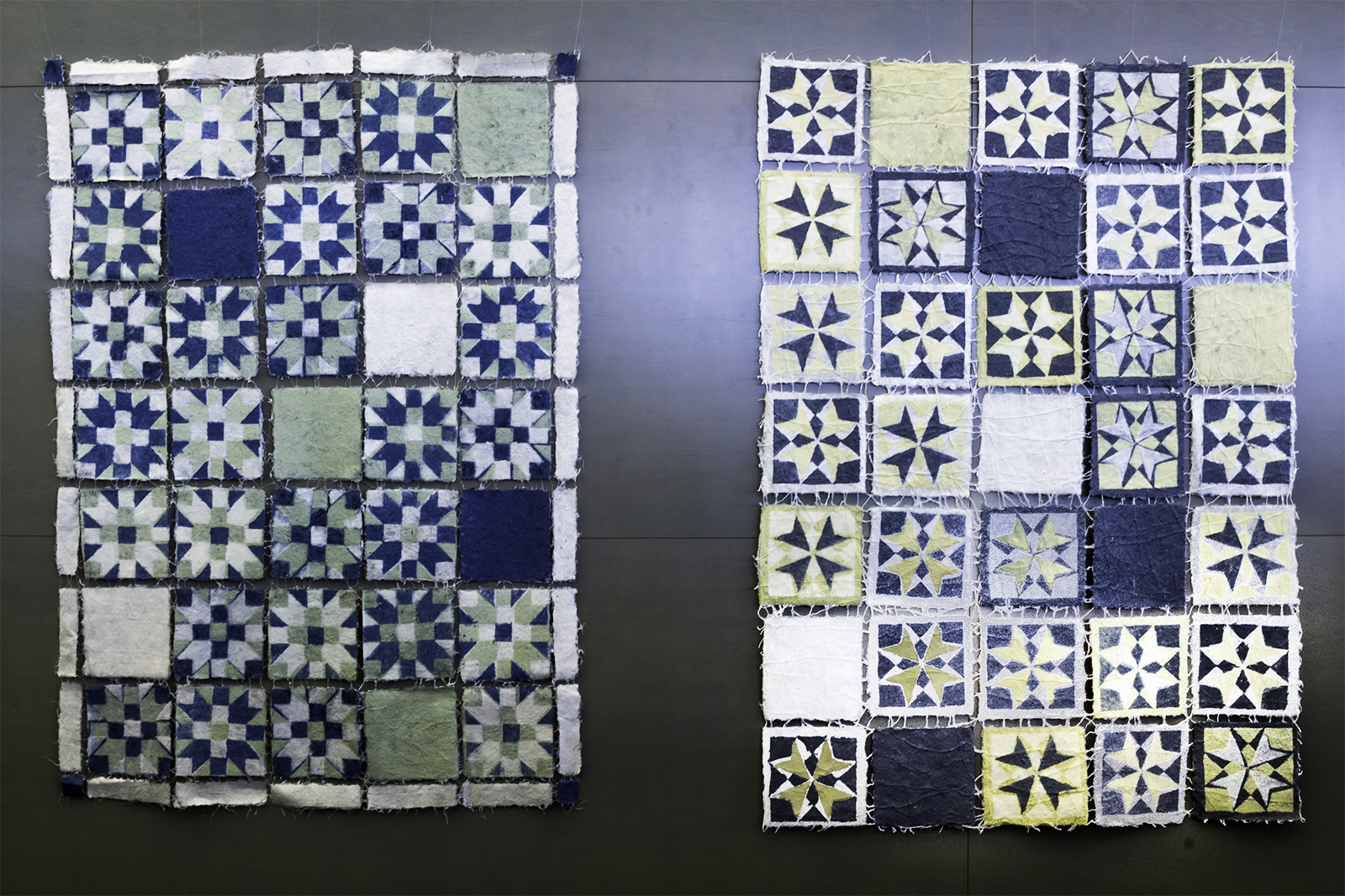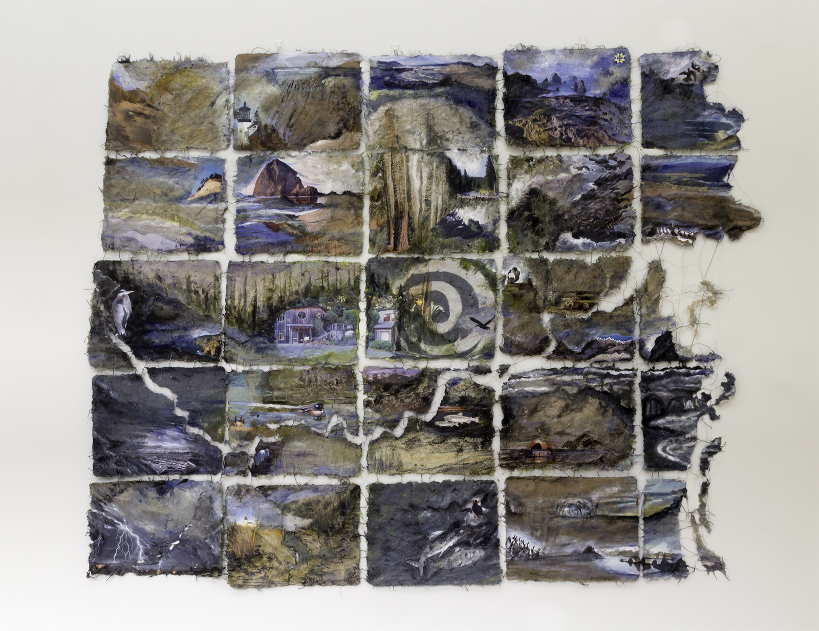 These are photos of my artworks installed at Marin Community Foundation. One work “Salmon River Estuary Site Map” is downstairs just to the right of the entrance to the building. Another work “Pt. Reyes Site Map” is installed on the large wall over the stairway leading to the 2nd floor exhibition space. Two other works in my ongoing series of handmade paper quilts are installed in the second floor exhibition space. Hope you can go and see this exhibition before the show closes on May 15.