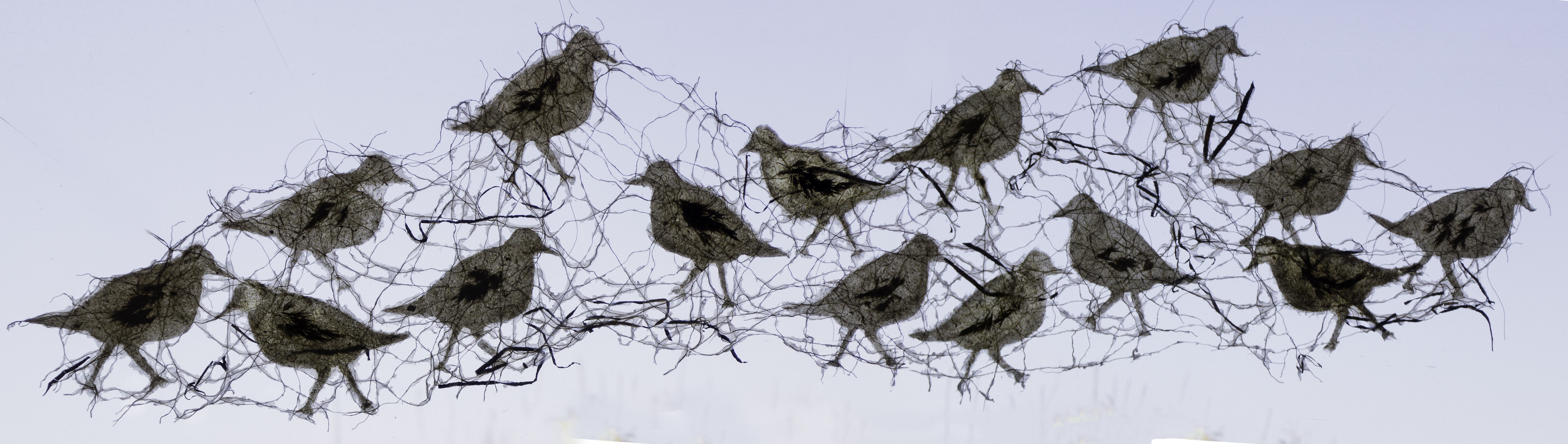 “Piping Plovers” is a suspended installation featuring multiple bird forms joined in a net of natural string and seaweed. The piping plover is an endangered species on Fire Island, and the park service has been protecting nesting sites for this species.