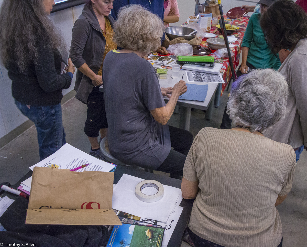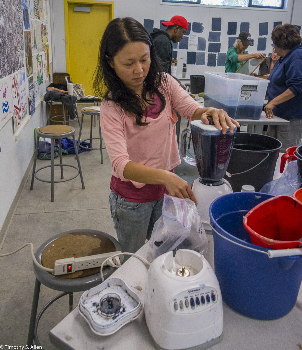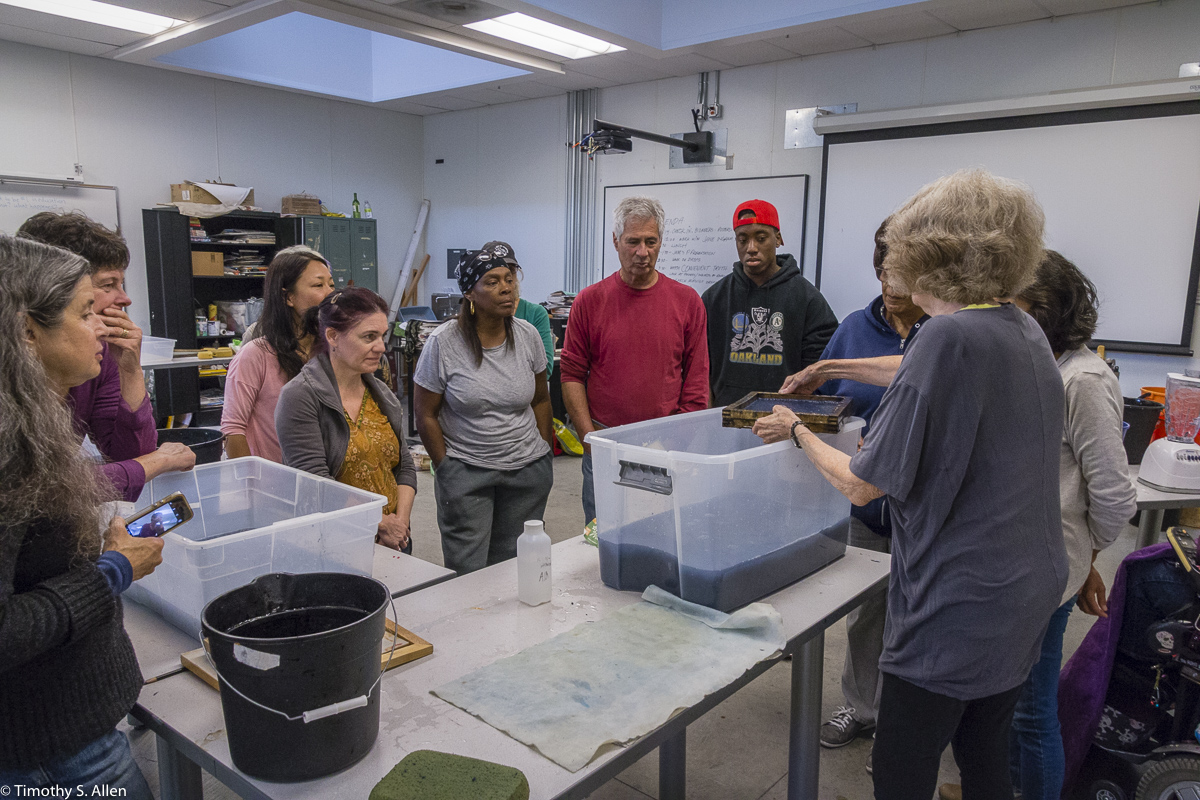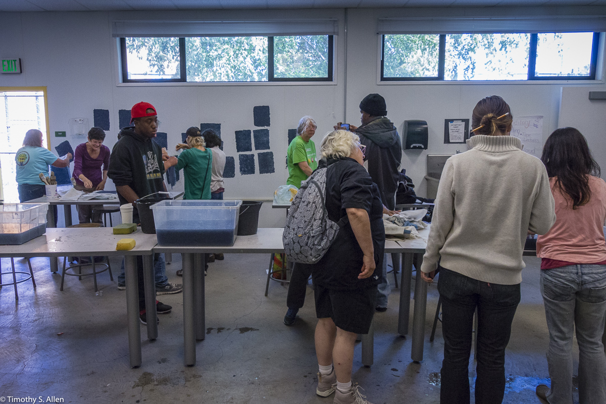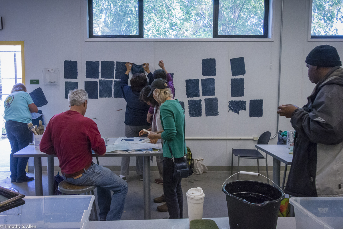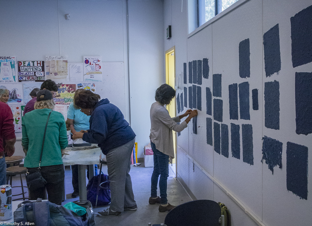 The hundreds of handmade paper water drops for the installation were created in a papermaking workshop I offered at Laney College on Oct. 11 with students in the Eco Art Matters class of Andree Thompson and Sharon Siskin. The blue water drops are made from recycled blue jean pulp, and there are seeds for blue wildflowers in the pulp. Visitors are invited to make a pledge to save water and then take a “drop” from the installation home with them to plant, water and watch it grow over time.