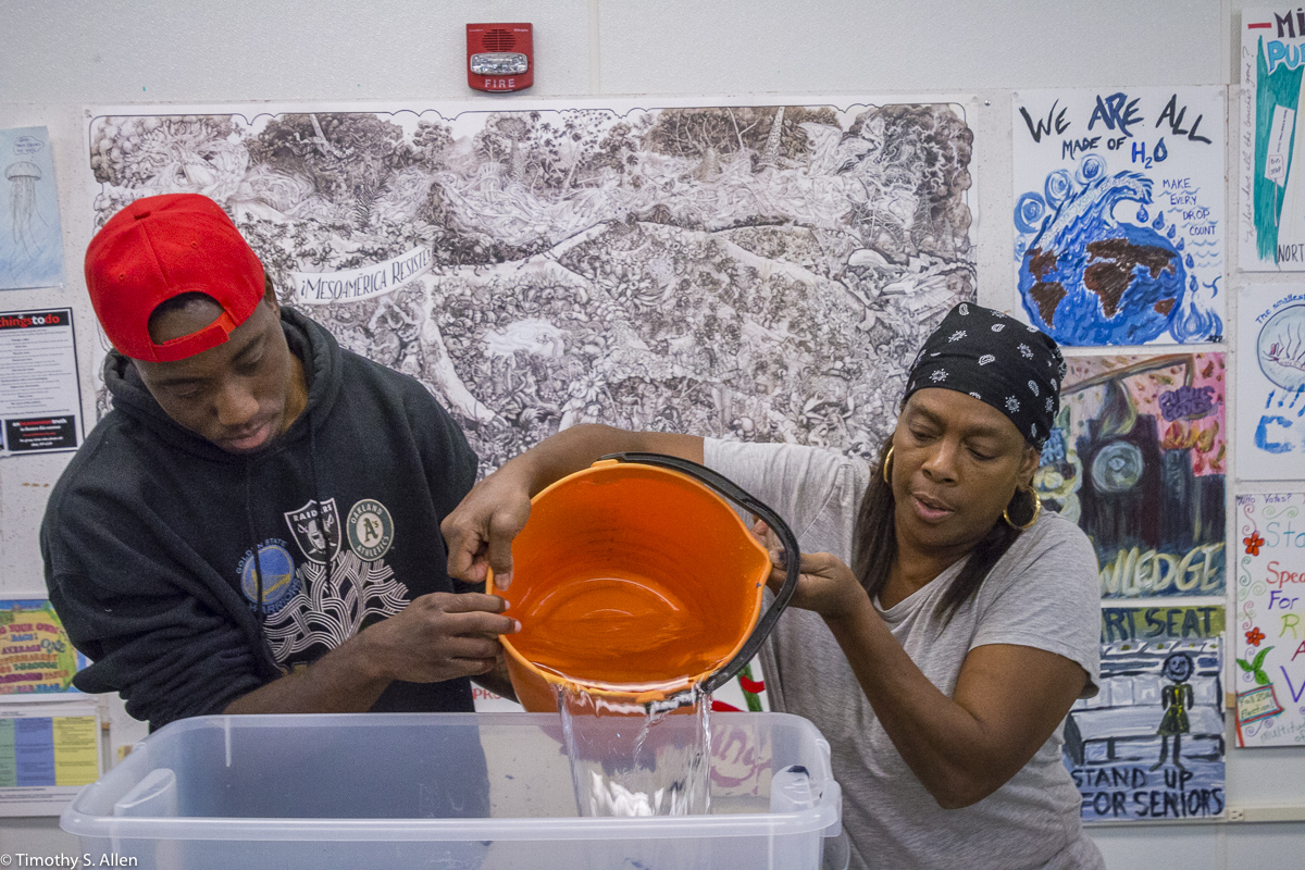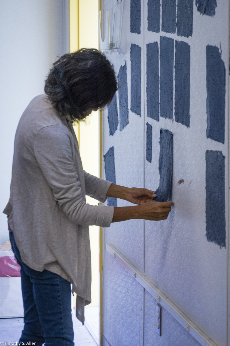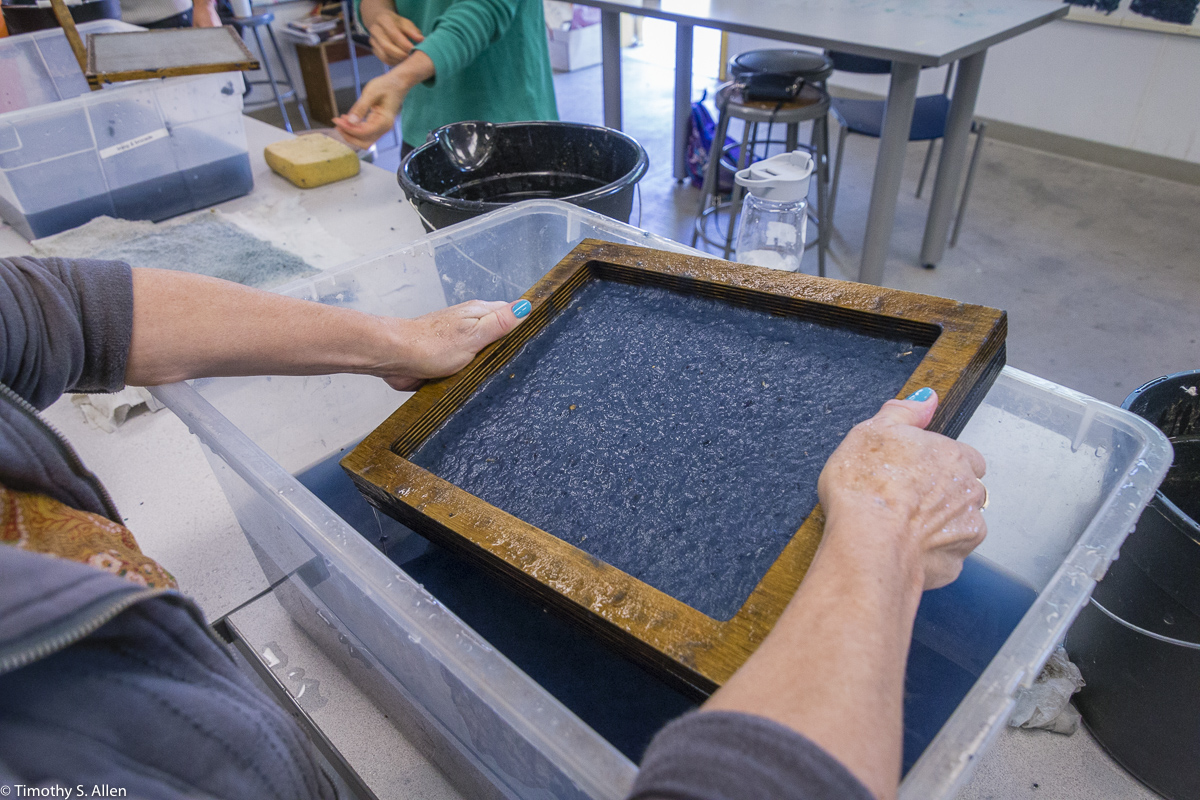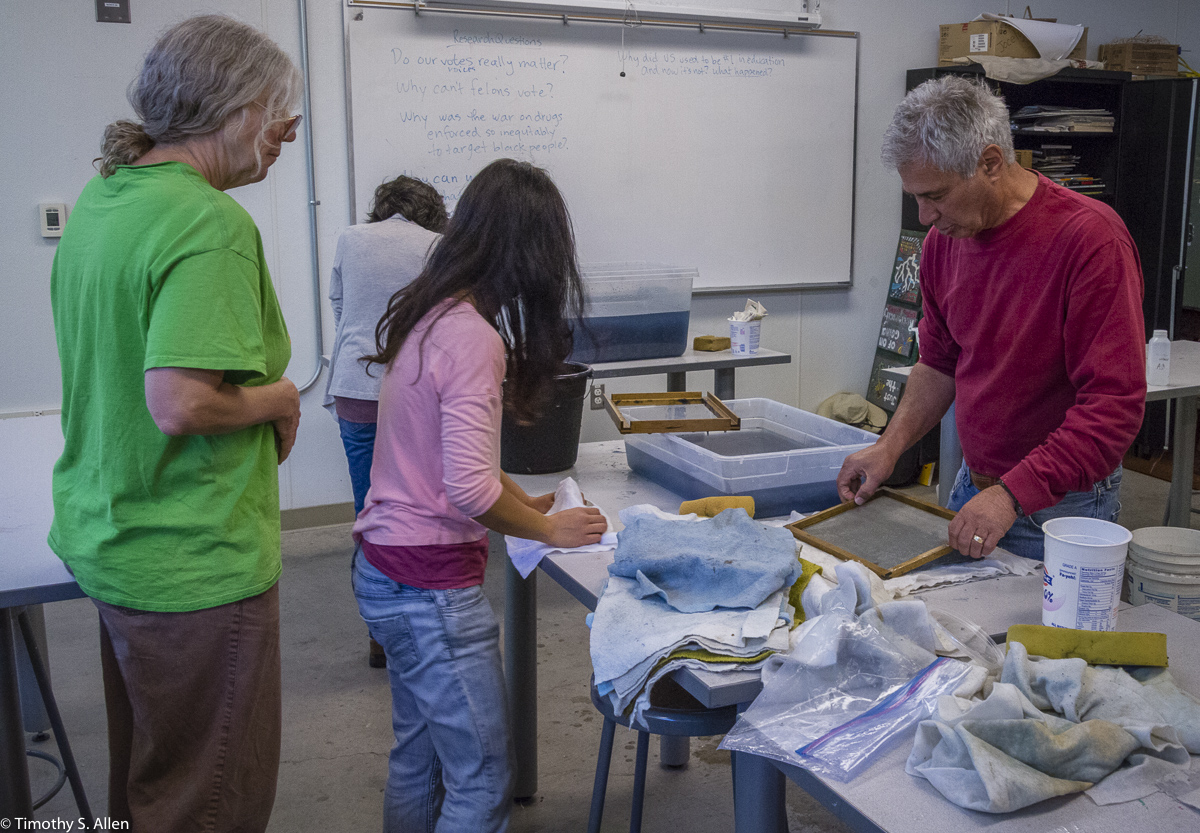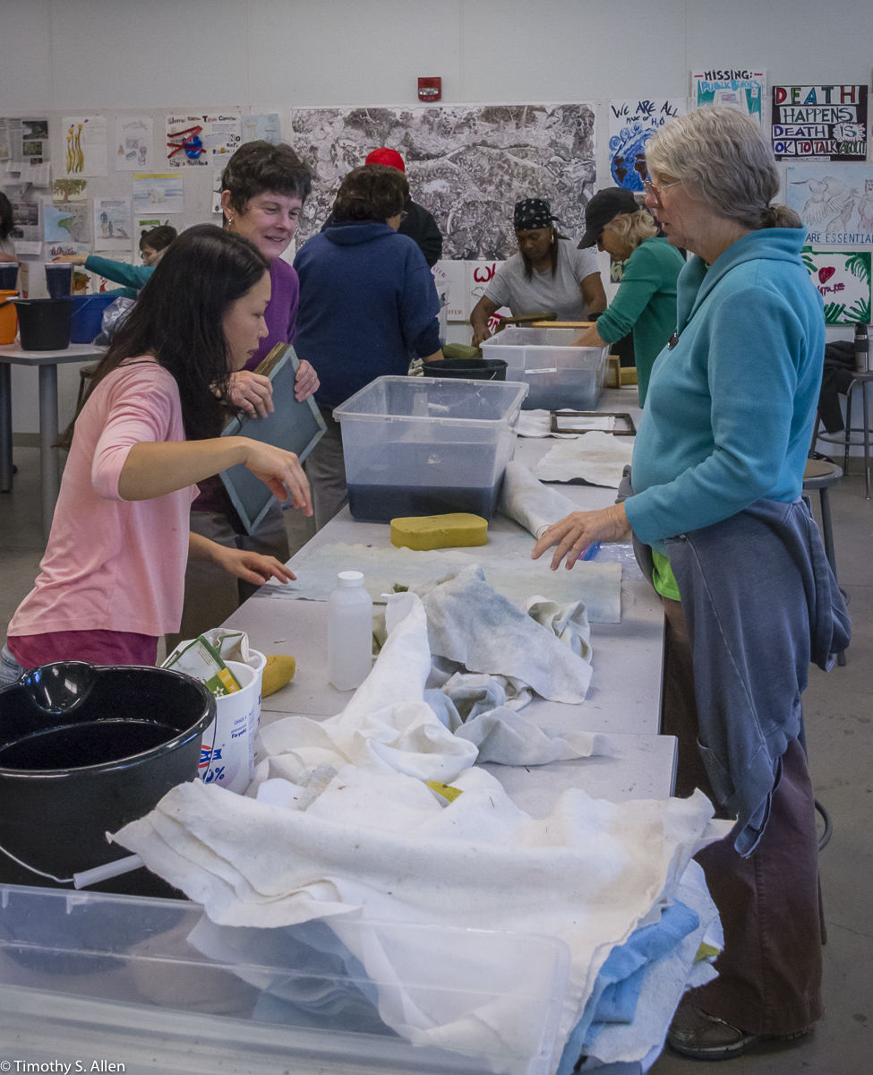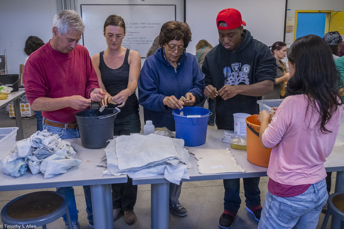 The hundreds of handmade paper water drops for the installation were created in a papermaking workshop I offered at Laney College on Oct. 11 with students in the Eco Art Matters class of Andree Thompson and Sharon Siskin. The blue water drops are made from recycled blue jean pulp, and there are seeds for blue wildflowers in the pulp. Visitors are invited to make a pledge to save water and then take a “drop” from the installation home with them to plant, water and watch it grow over time.