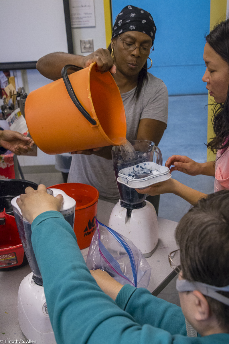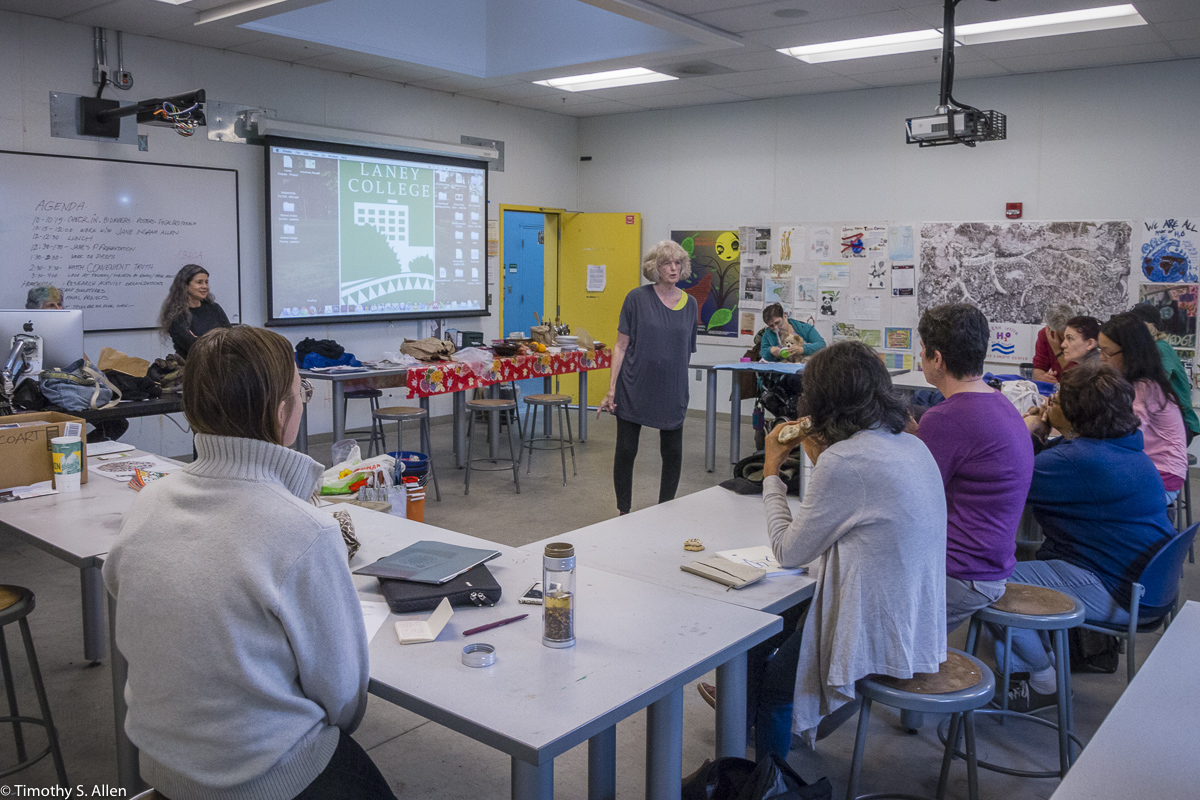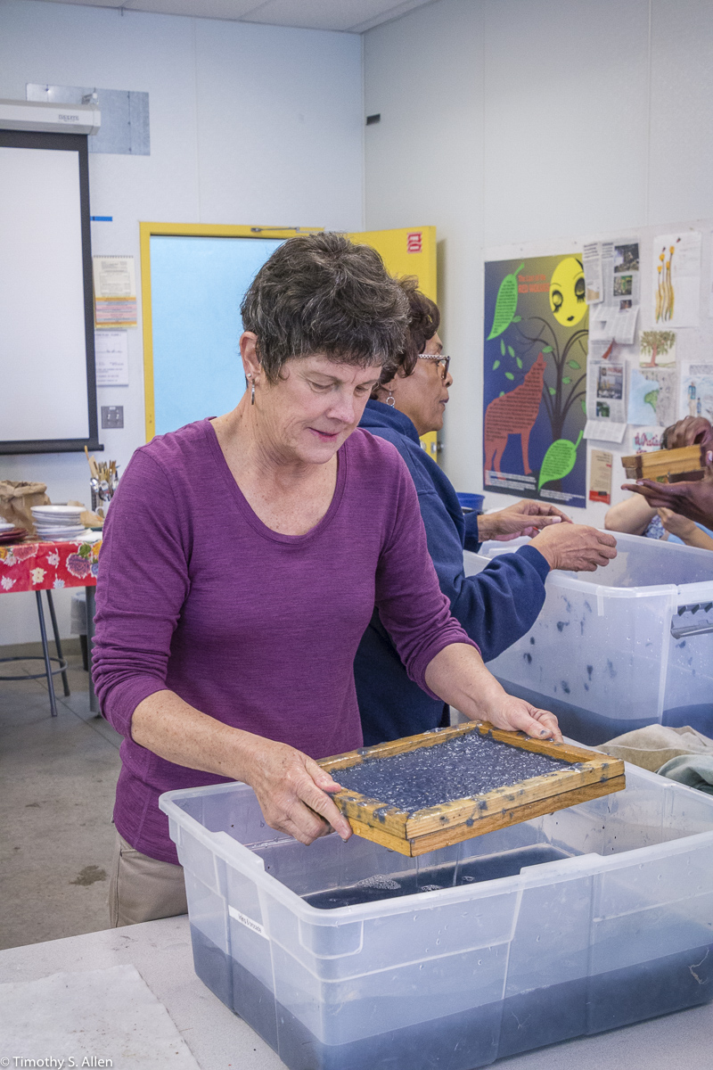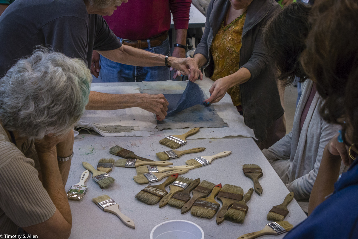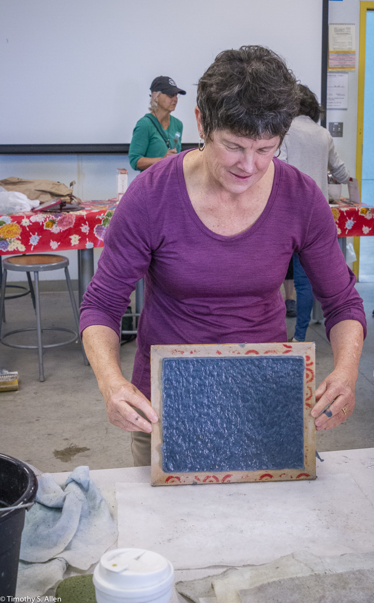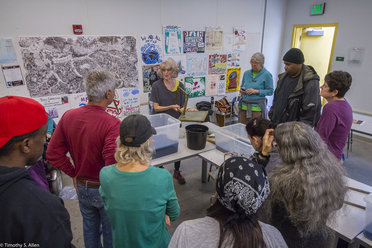 The hundreds of handmade paper water drops for the installation were created in a papermaking workshop I offered at Laney College on Oct. 11 with students in the Eco Art Matters class of Andree Thompson and Sharon Siskin. The blue water drops are made from recycled blue jean pulp, and there are seeds for blue wildflowers in the pulp. Visitors are invited to make a pledge to save water and then take a “drop” from the installation home with them to plant, water and watch it grow over time.