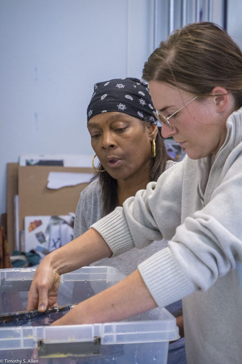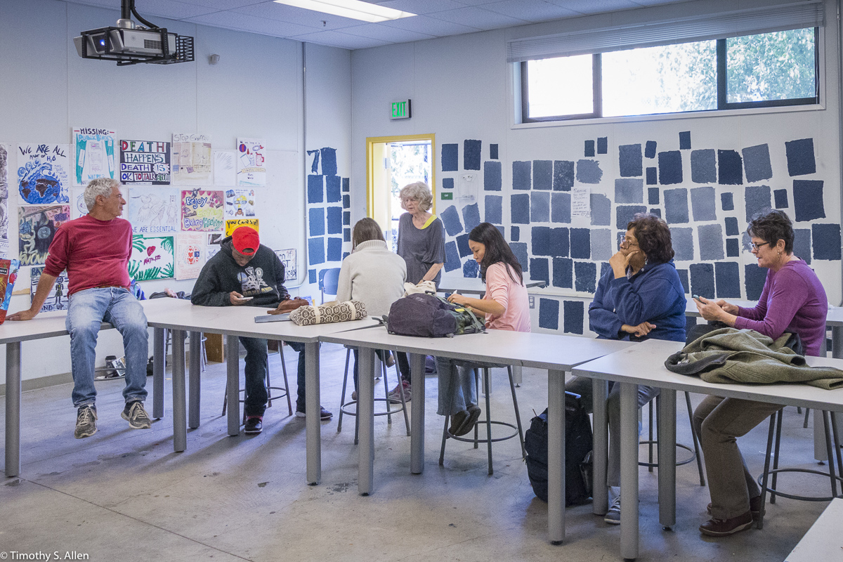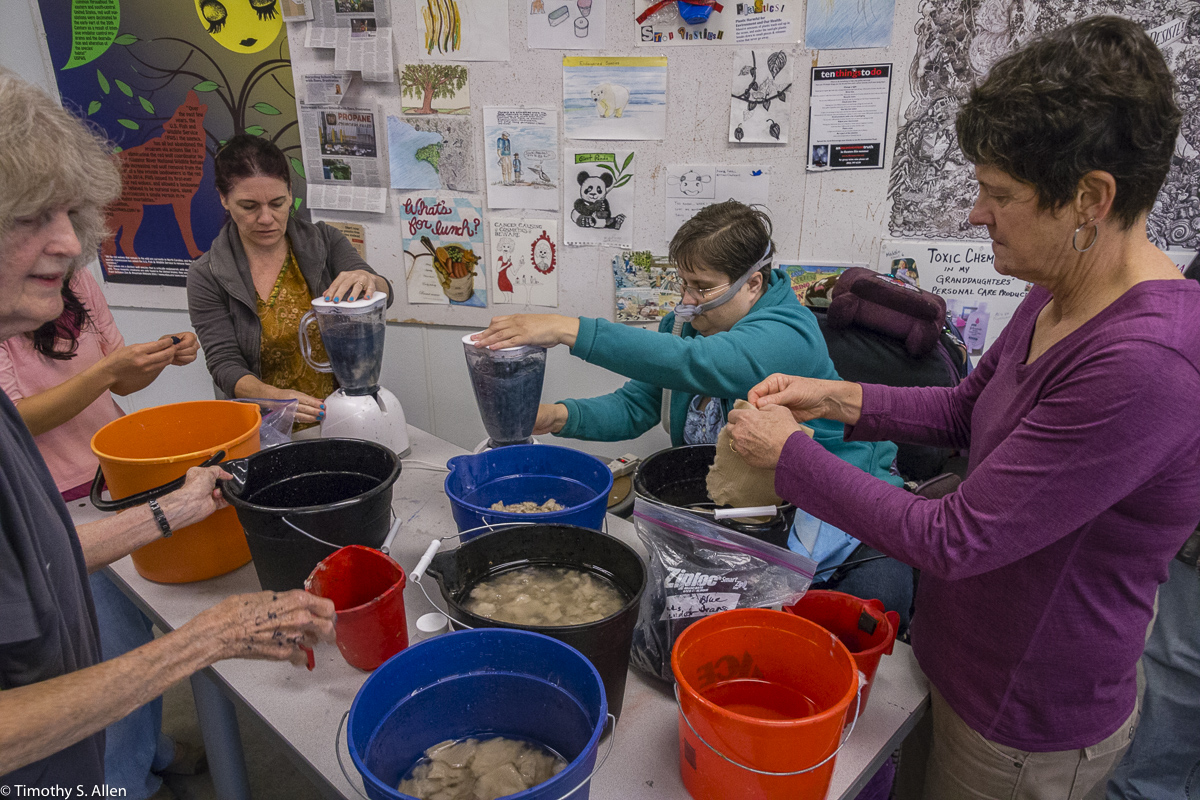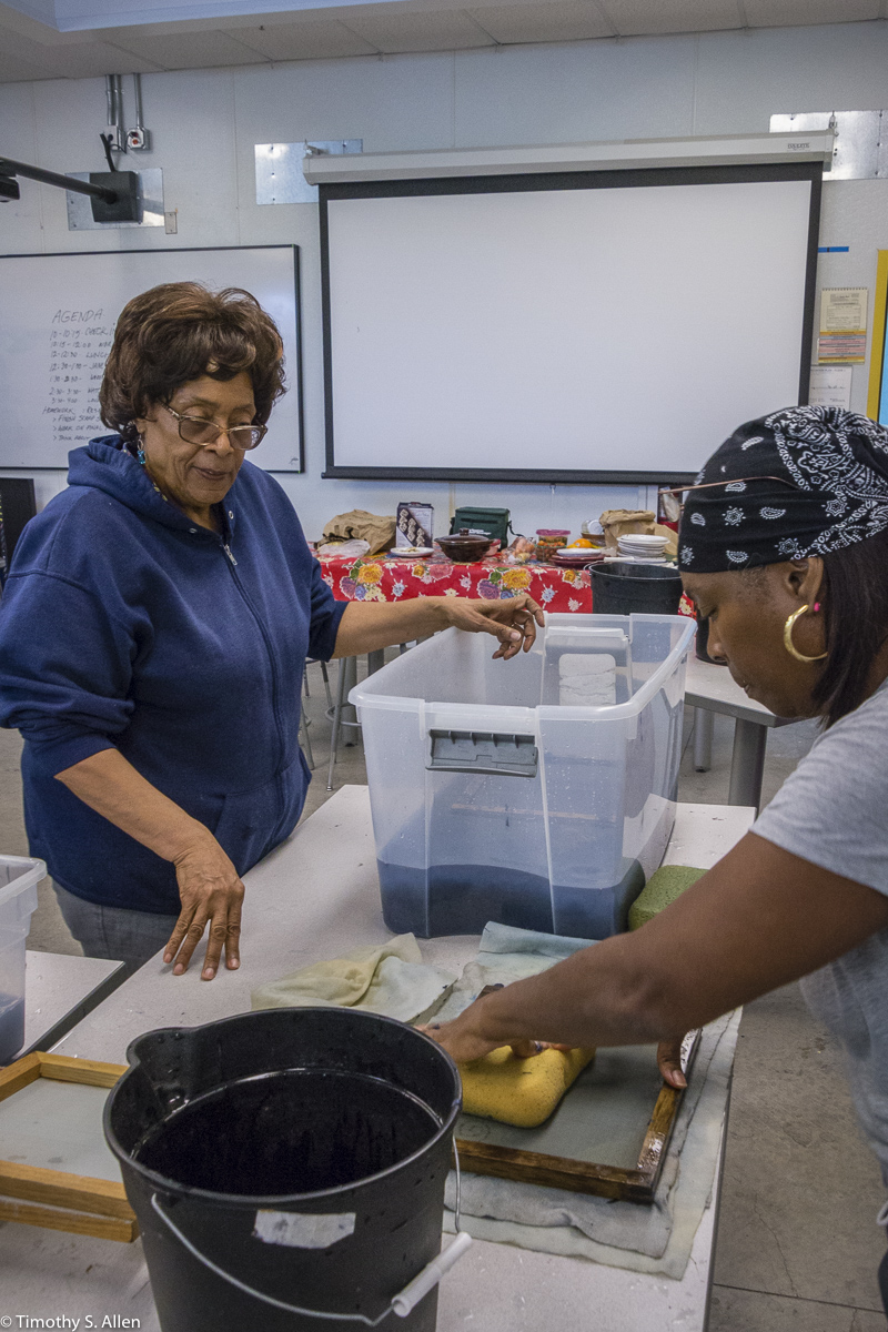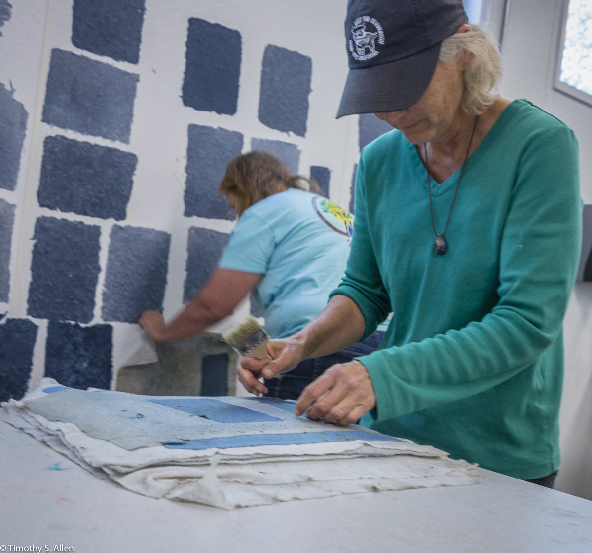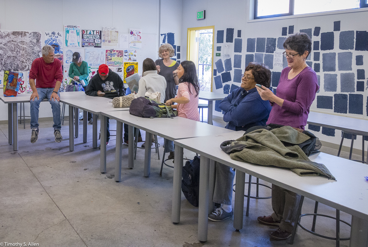 The hundreds of handmade paper water drops for the installation were created in a papermaking workshop I offered at Laney College on Oct. 11 with students in the Eco Art Matters class of Andree Thompson and Sharon Siskin. The blue water drops are made from recycled blue jean pulp, and there are seeds for blue wildflowers in the pulp. Visitors are invited to make a pledge to save water and then take a “drop” from the installation home with them to plant, water and watch it grow over time.