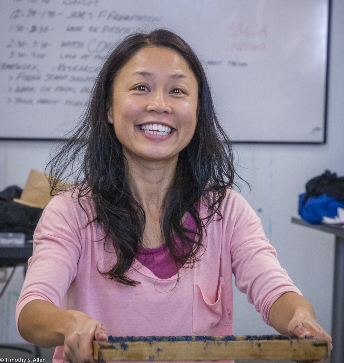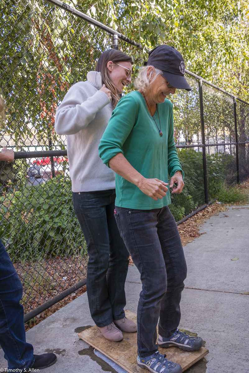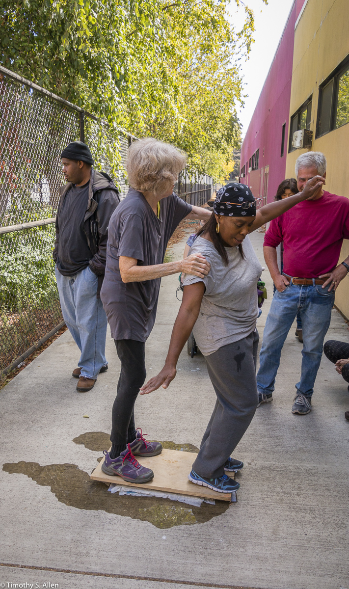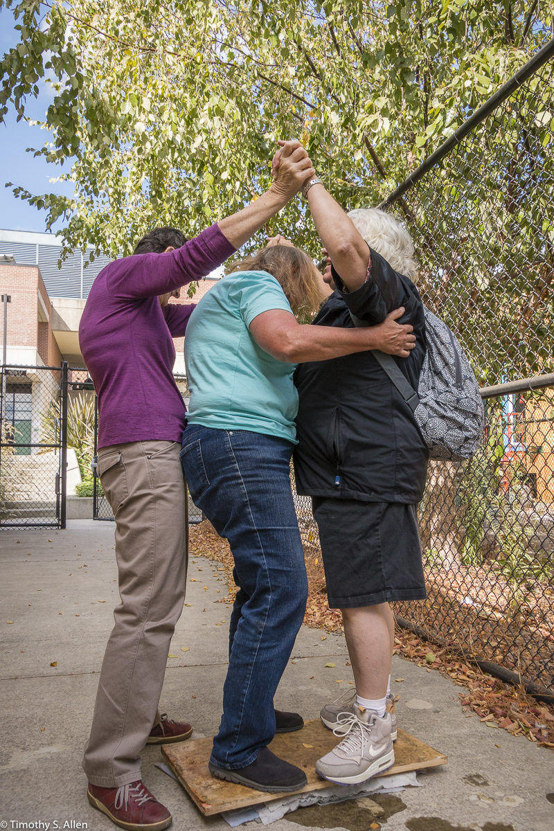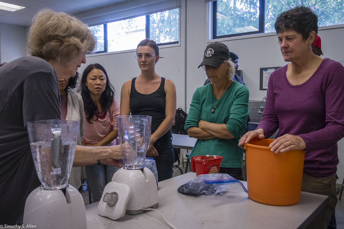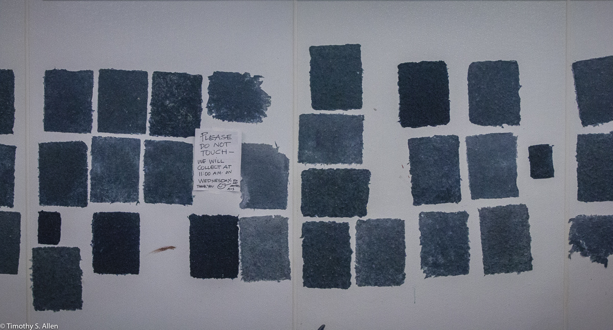 The hundreds of handmade paper water drops for the installation were created in a papermaking workshop I offered at Laney College on Oct. 11 with students in the Eco Art Matters class of Andree Thompson and Sharon Siskin. The blue water drops are made from recycled blue jean pulp, and there are seeds for blue wildflowers in the pulp. Visitors are invited to make a pledge to save water and then take a “drop” from the installation home with them to plant, water and watch it grow over time.