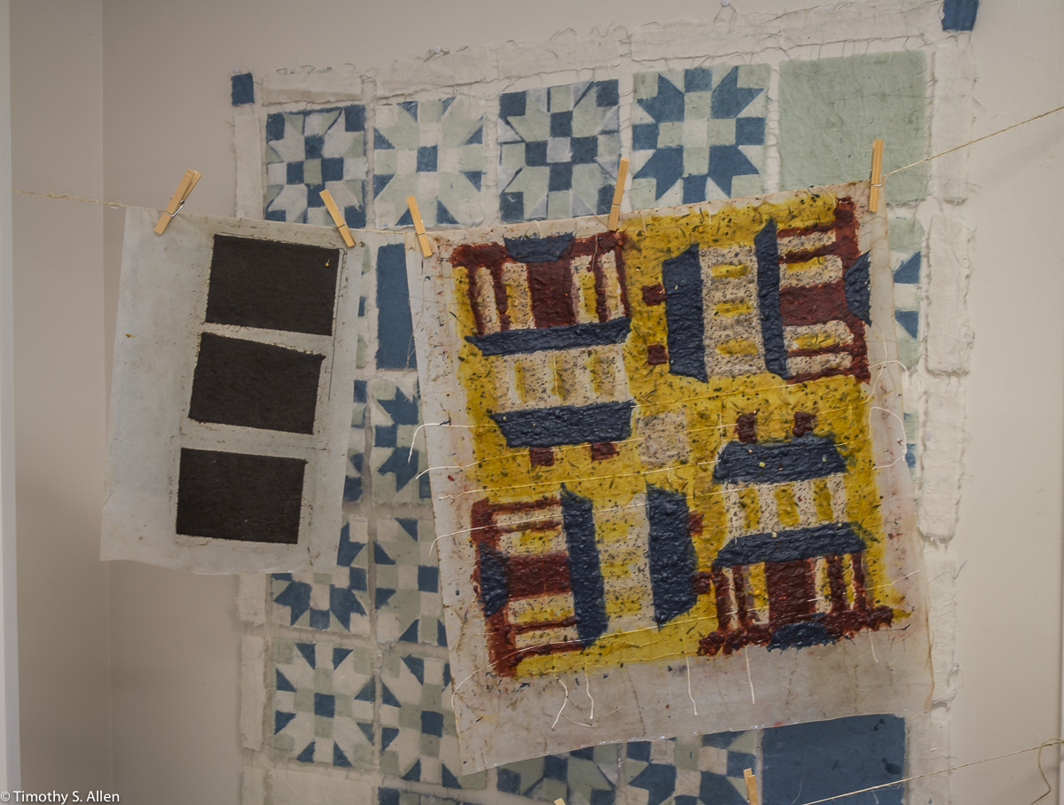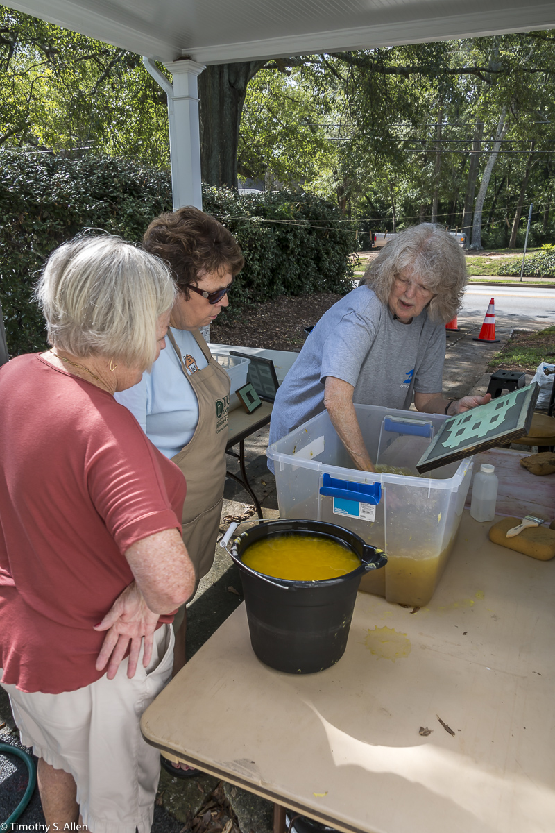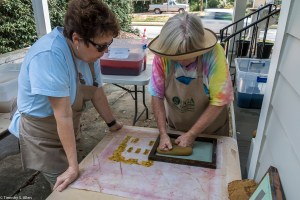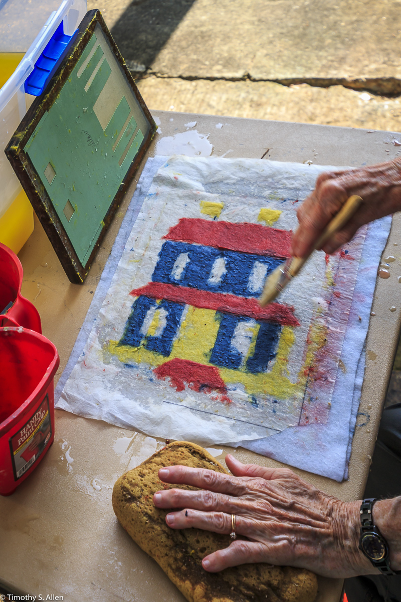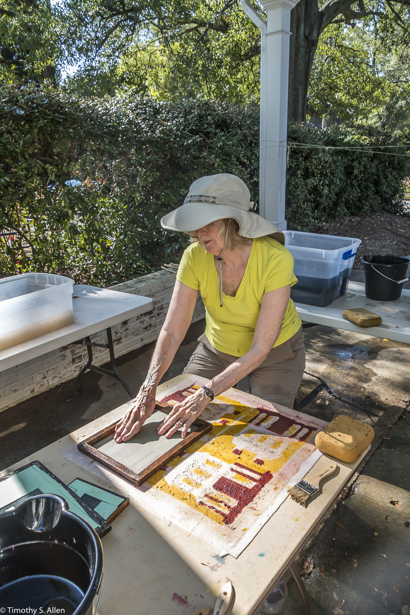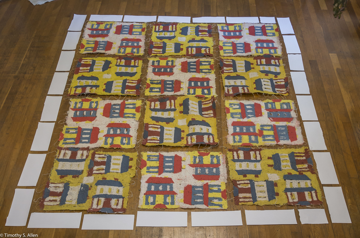 I am continuing my residency with Newnan Art Rez (www.newnanartist.org),and these photos by my husband Timothy S. Allen tell the story of what is happening. We are continuing to make blocks for the handmade paper “eco-quilt” in a house pattern that will be put on the prepared bed of soil on August 31 in Newnan at a site near the corner of College and Temple next to the Veteran’s Park and the children’s museum (site of the old Male Academy in Newnan). The handmade paper quilt contains seeds for wildflowers in the same colors as the pattern. Over time as the all biodegradable handmade paper quilt dissolves into mulch, the seeds will sprout and grow and bloom as wildflowers to make a continually evolving public artwork in Newnan.