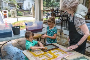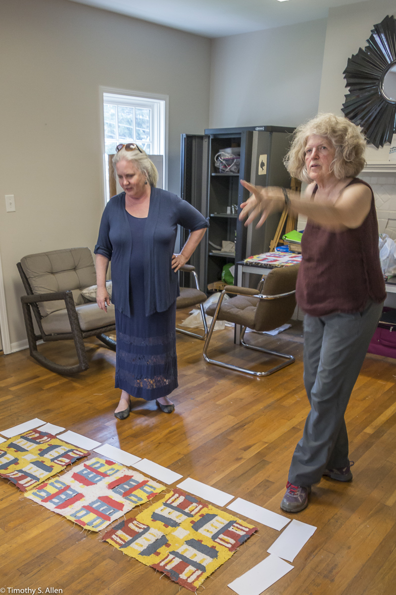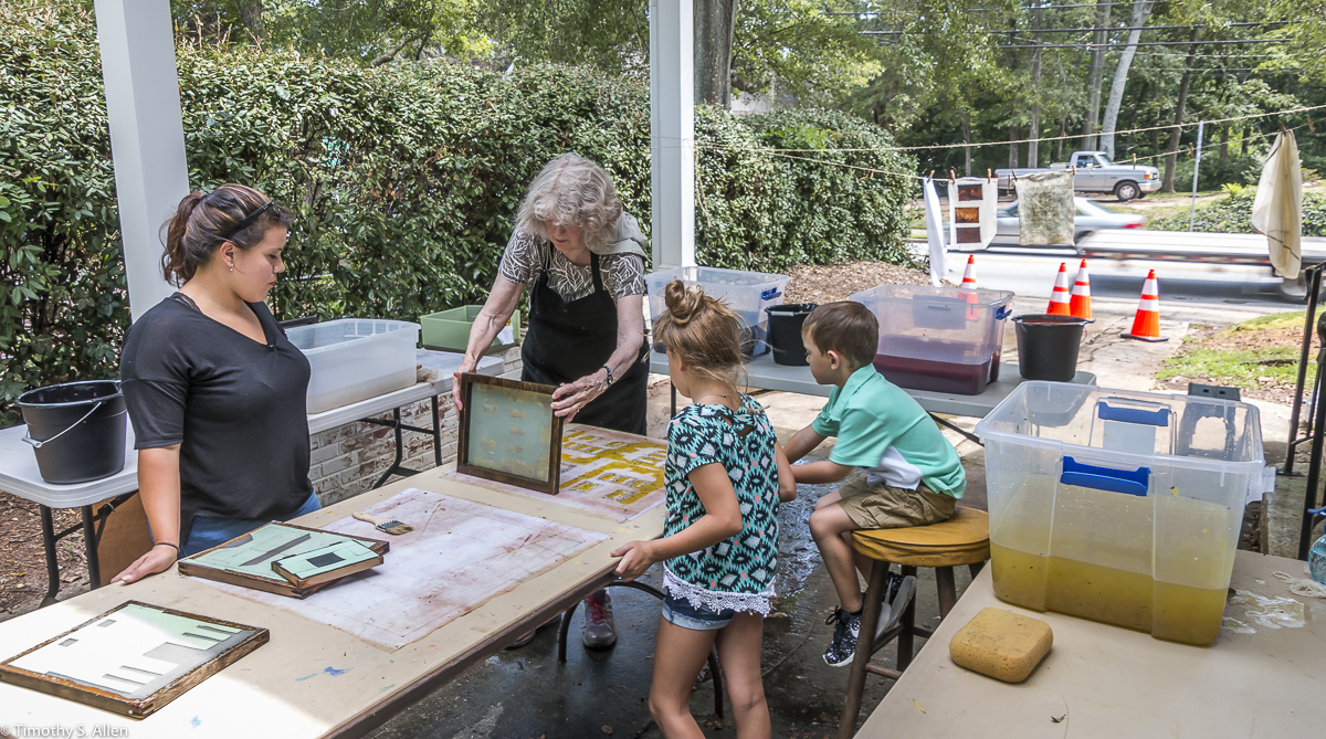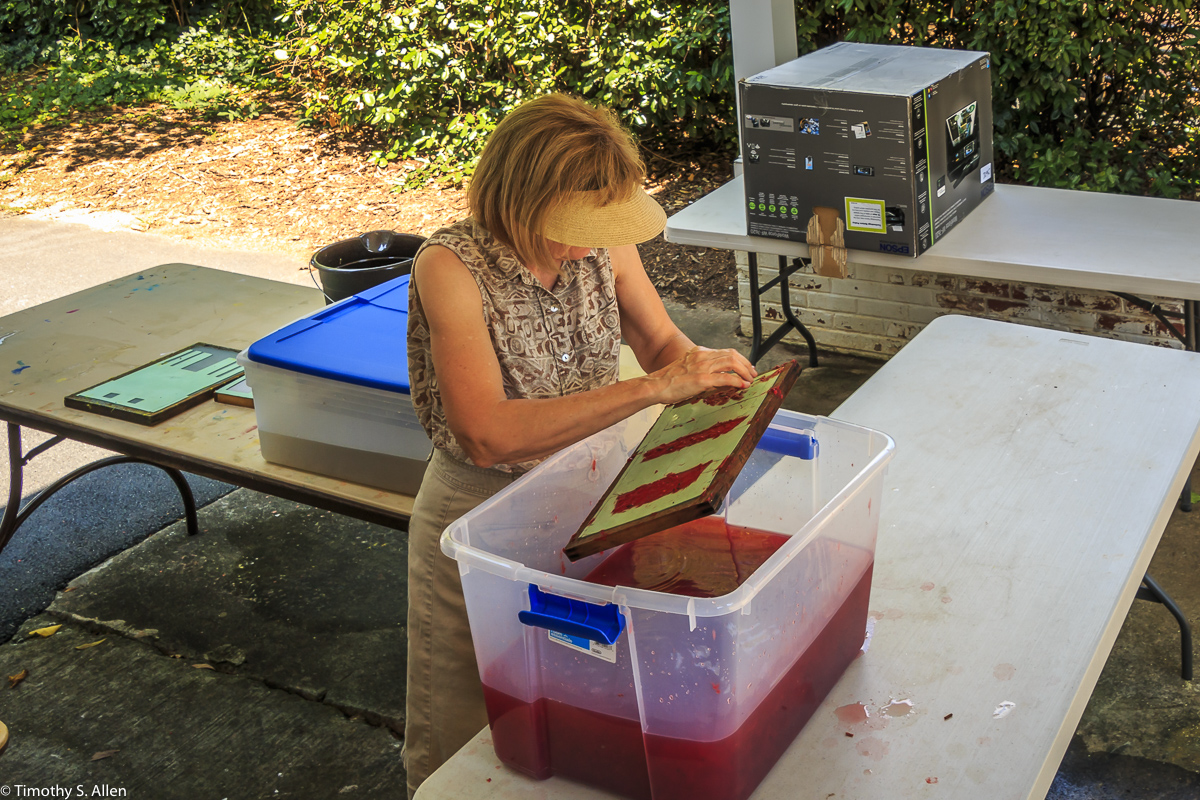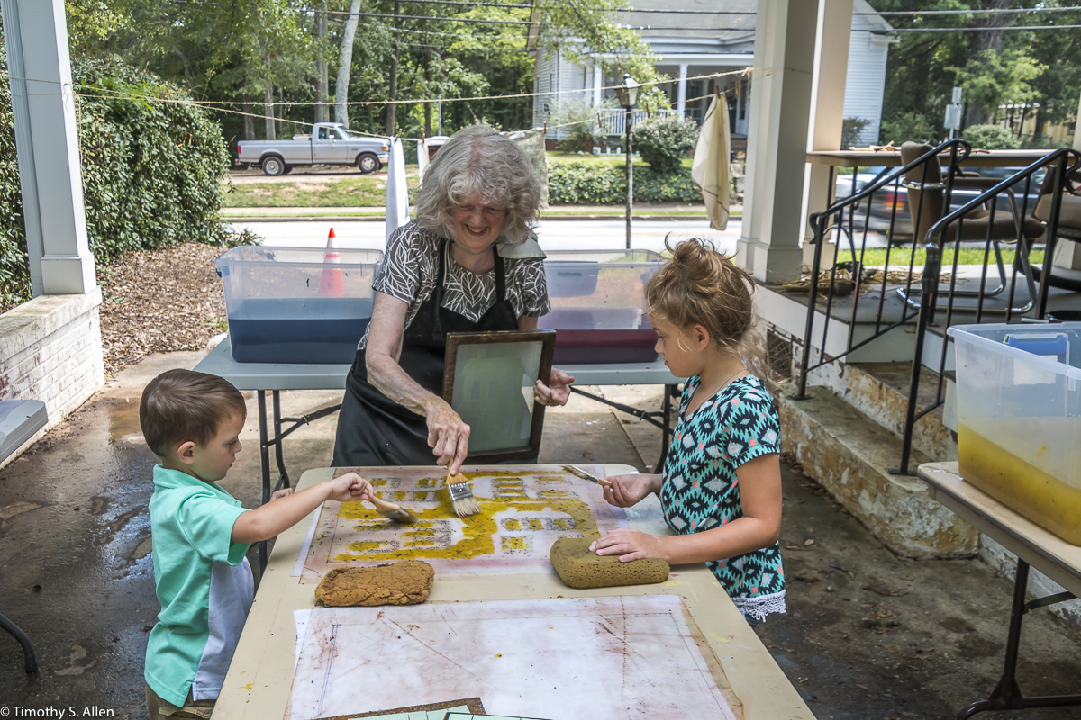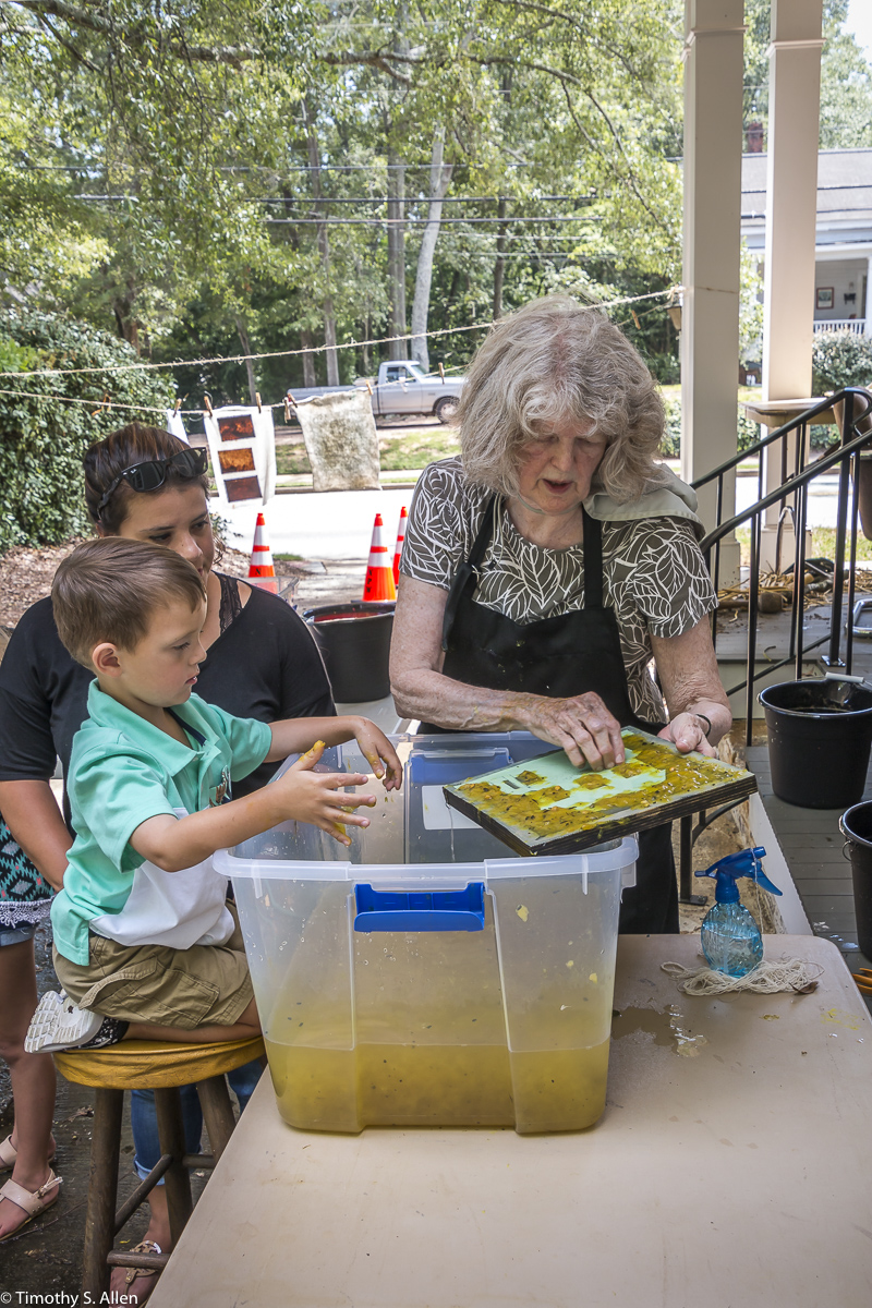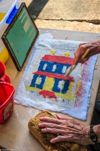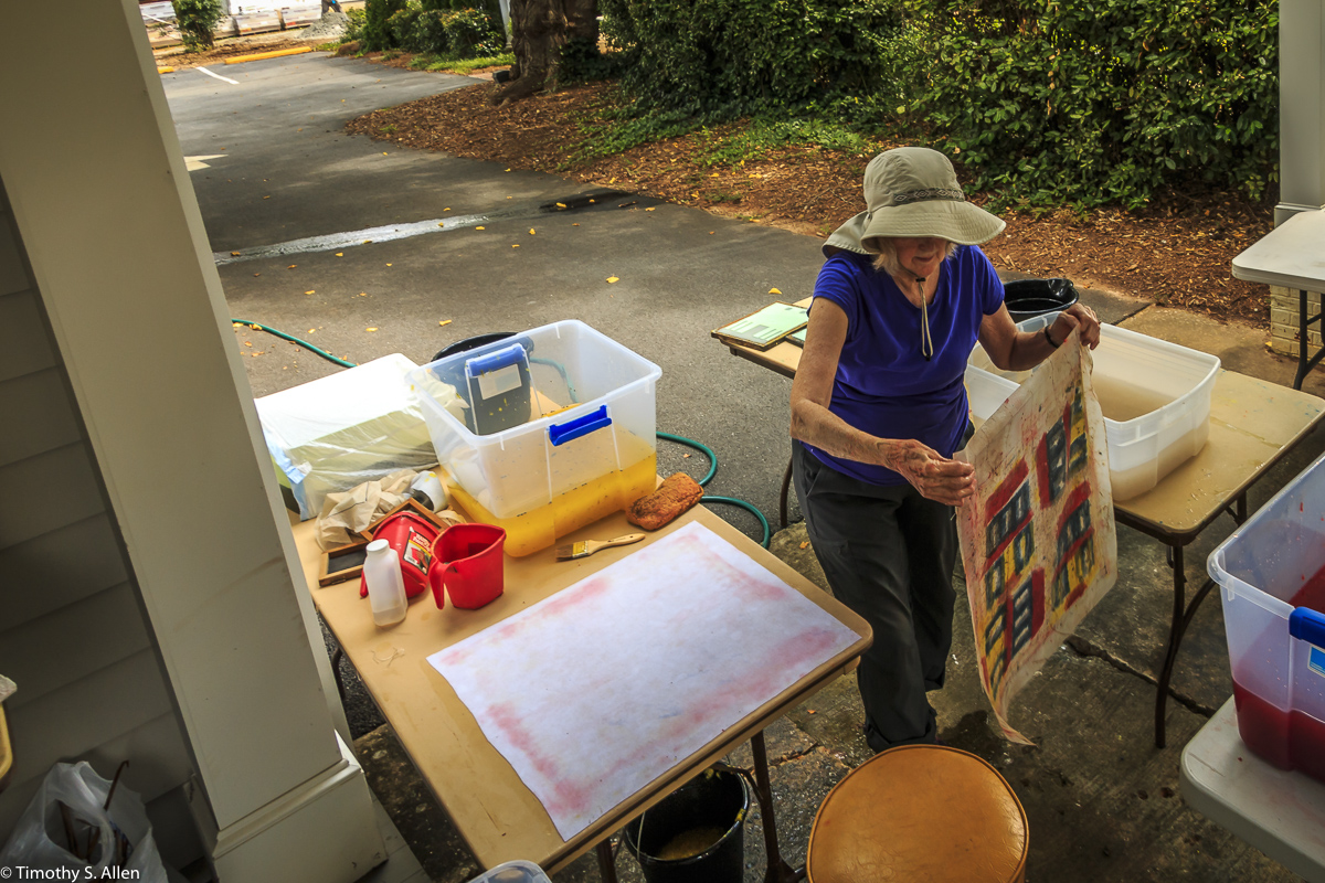 I am continuing my residency with Newnan Art Rez (www.newnanartist.org),and these photos by my husband Timothy S. Allen tell the story of what is happening. We are continuing to make blocks for the handmade paper “eco-quilt” in a house pattern that will be put on the prepared bed of soil on August 31 in Newnan at a site near the corner of College and Temple next to the Veteran’s Park and the children’s museum (site of the old Male Academy in Newnan). The handmade paper quilt contains seeds for wildflowers in the same colors as the pattern. Over time as the all biodegradable handmade paper quilt dissolves into mulch, the seeds will sprout and grow and bloom as wildflowers to make a continually evolving public artwork in Newnan.