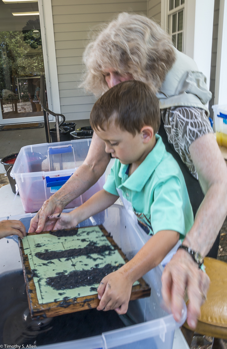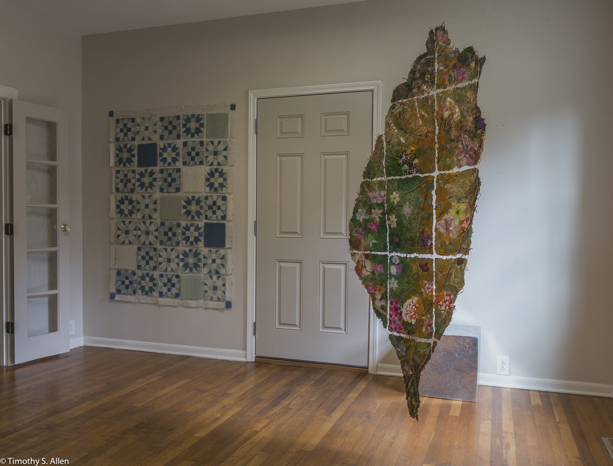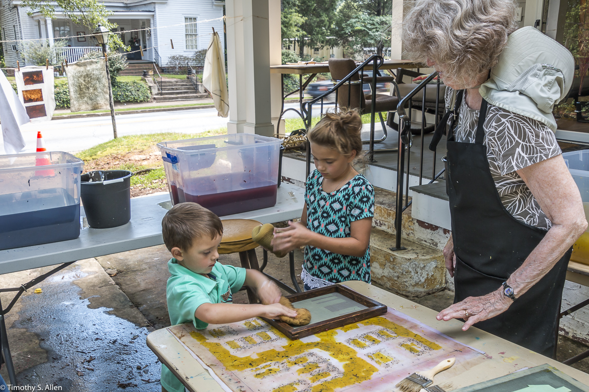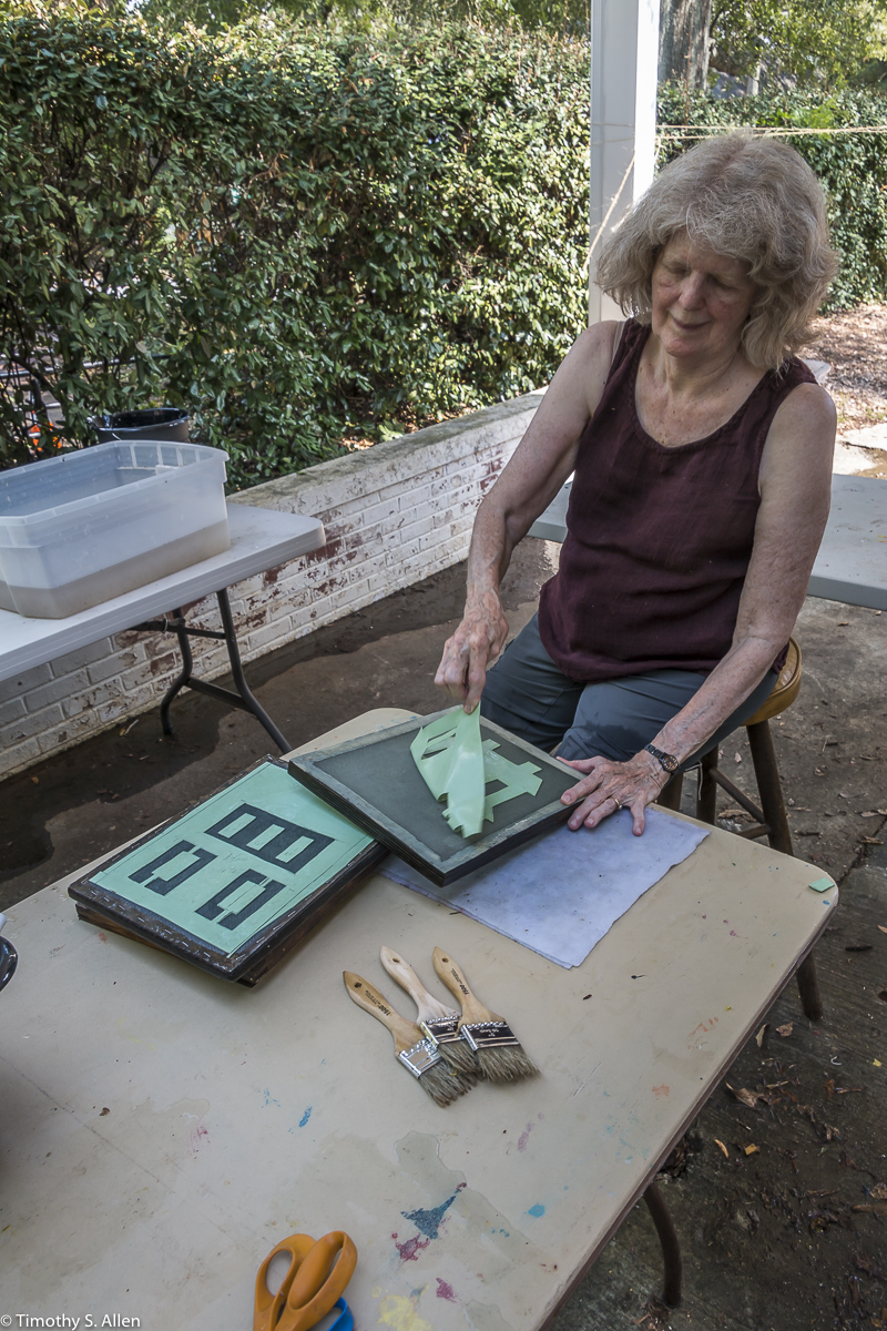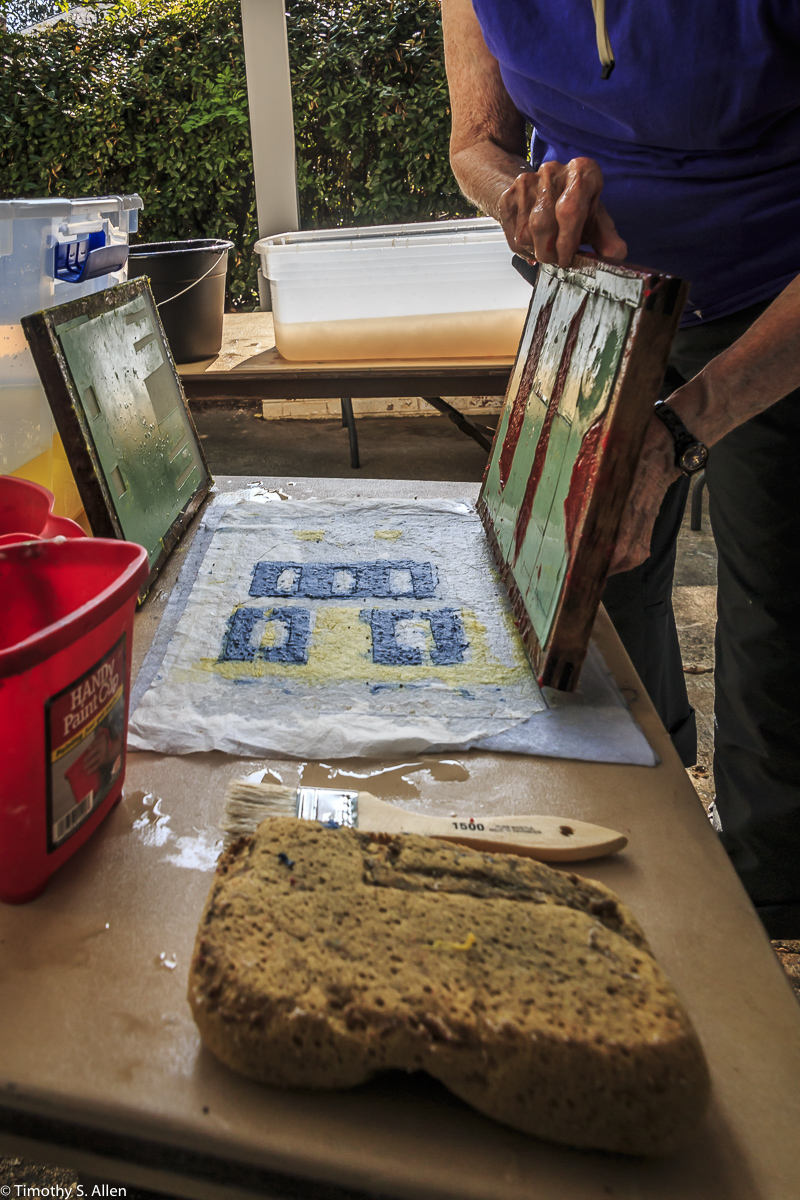 I am continuing my residency with Newnan Art Rez (www.newnanartist.org),and these photos by my husband Timothy S. Allen tell the story of what is happening. We are continuing to make blocks for the handmade paper “eco-quilt” in a house pattern that will be put on the prepared bed of soil on August 31 in Newnan at a site near the corner of College and Temple next to the Veteran’s Park and the children’s museum (site of the old Male Academy in Newnan). The handmade paper quilt contains seeds for wildflowers in the same colors as the pattern. Over time as the all biodegradable handmade paper quilt dissolves into mulch, the seeds will sprout and grow and bloom as wildflowers to make a continually evolving public artwork in Newnan.