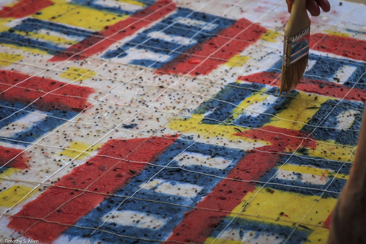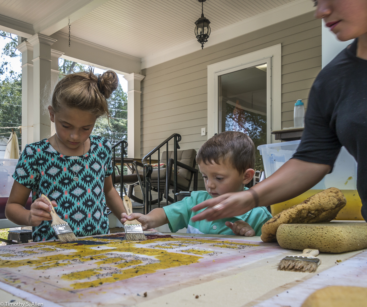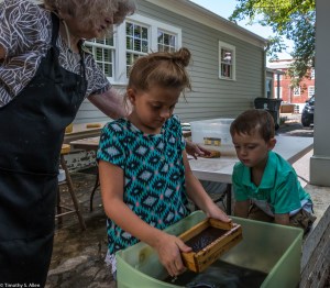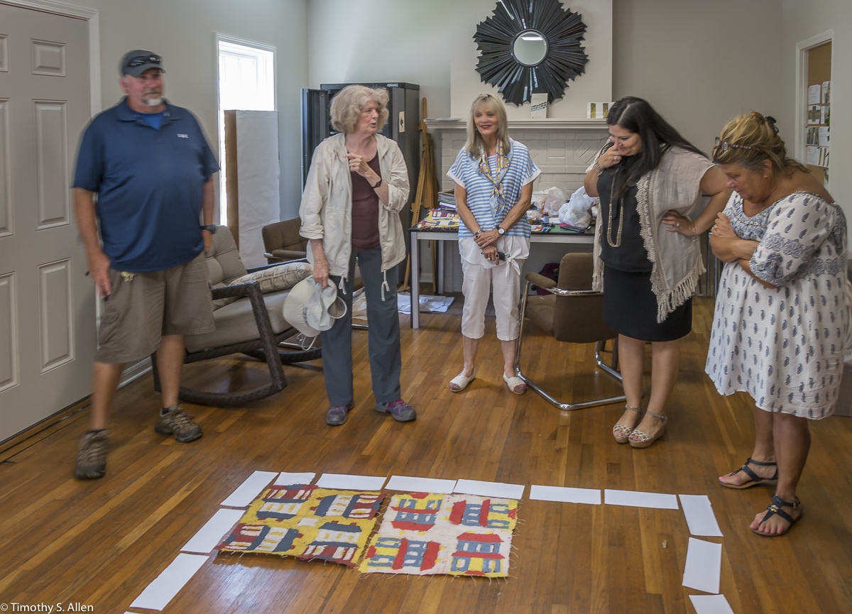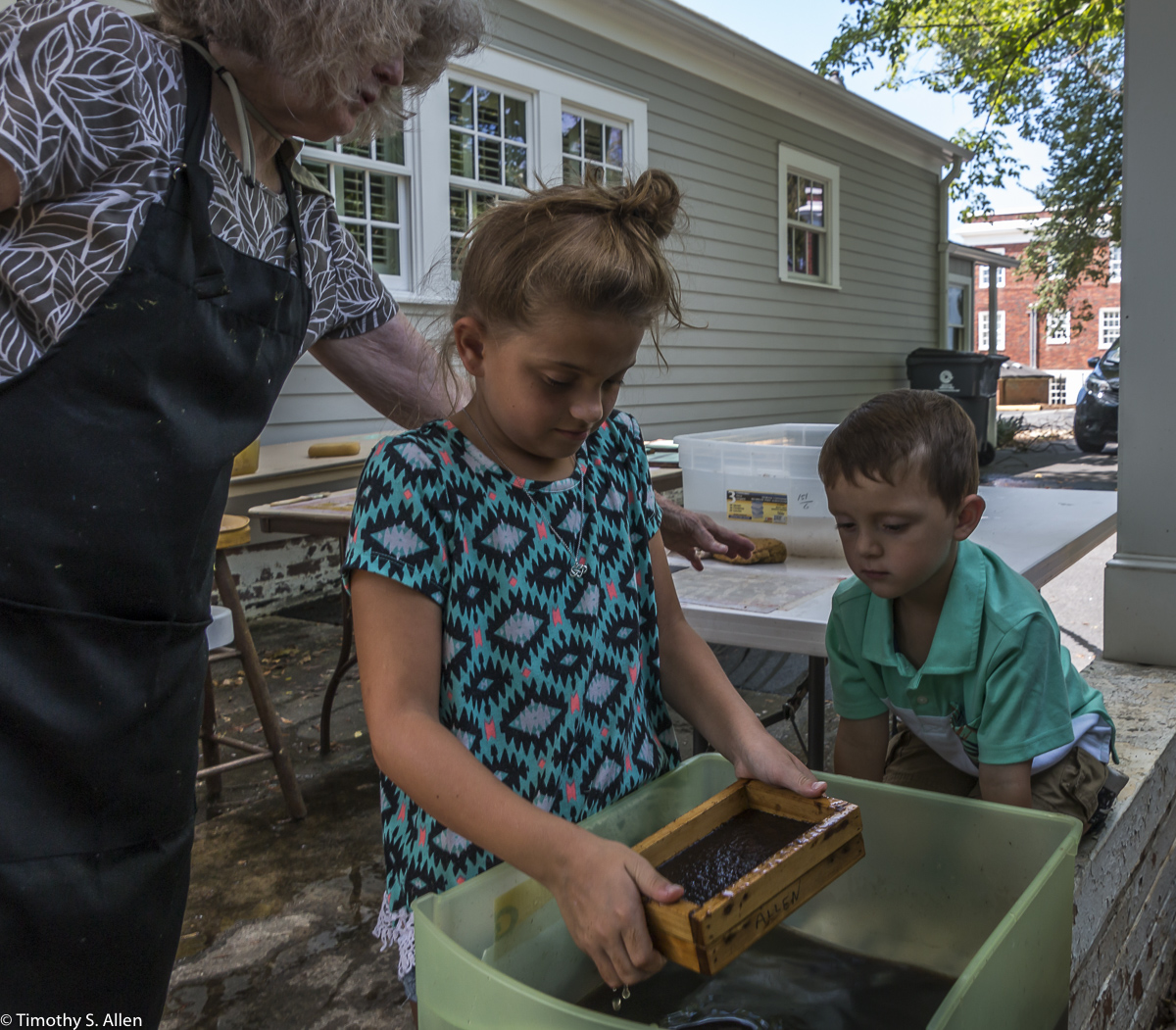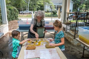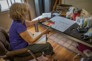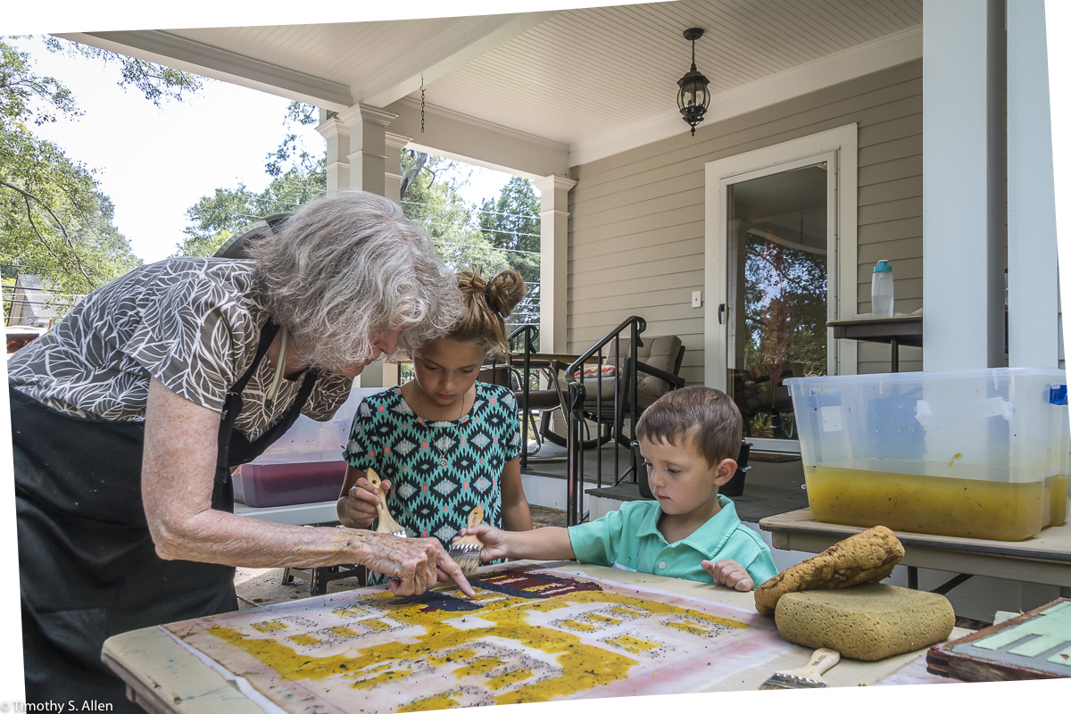 I am continuing my residency with Newnan Art Rez (www.newnanartist.org),and these photos by my husband Timothy S. Allen tell the story of what is happening. We are continuing to make blocks for the handmade paper “eco-quilt” in a house pattern that will be put on the prepared bed of soil on August 31 in Newnan at a site near the corner of College and Temple next to the Veteran’s Park and the children’s museum (site of the old Male Academy in Newnan). The handmade paper quilt contains seeds for wildflowers in the same colors as the pattern. Over time as the all biodegradable handmade paper quilt dissolves into mulch, the seeds will sprout and grow and bloom as wildflowers to make a continually evolving public artwork in Newnan.