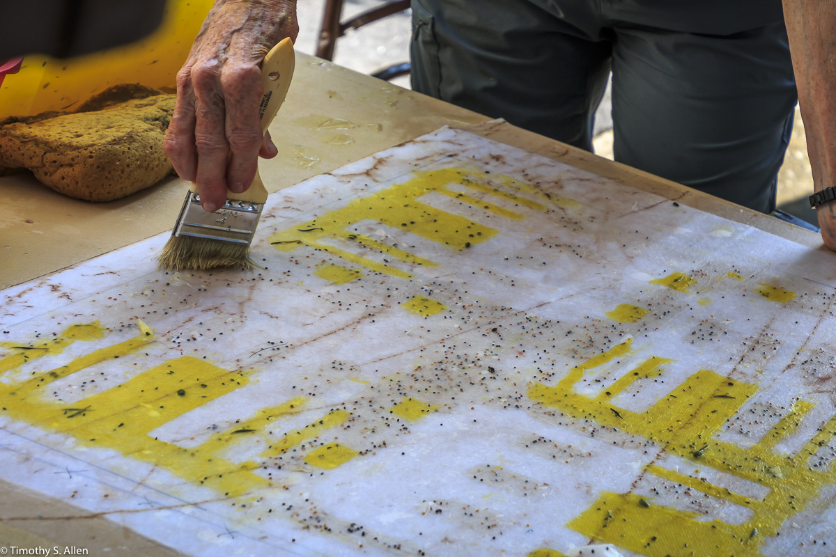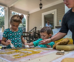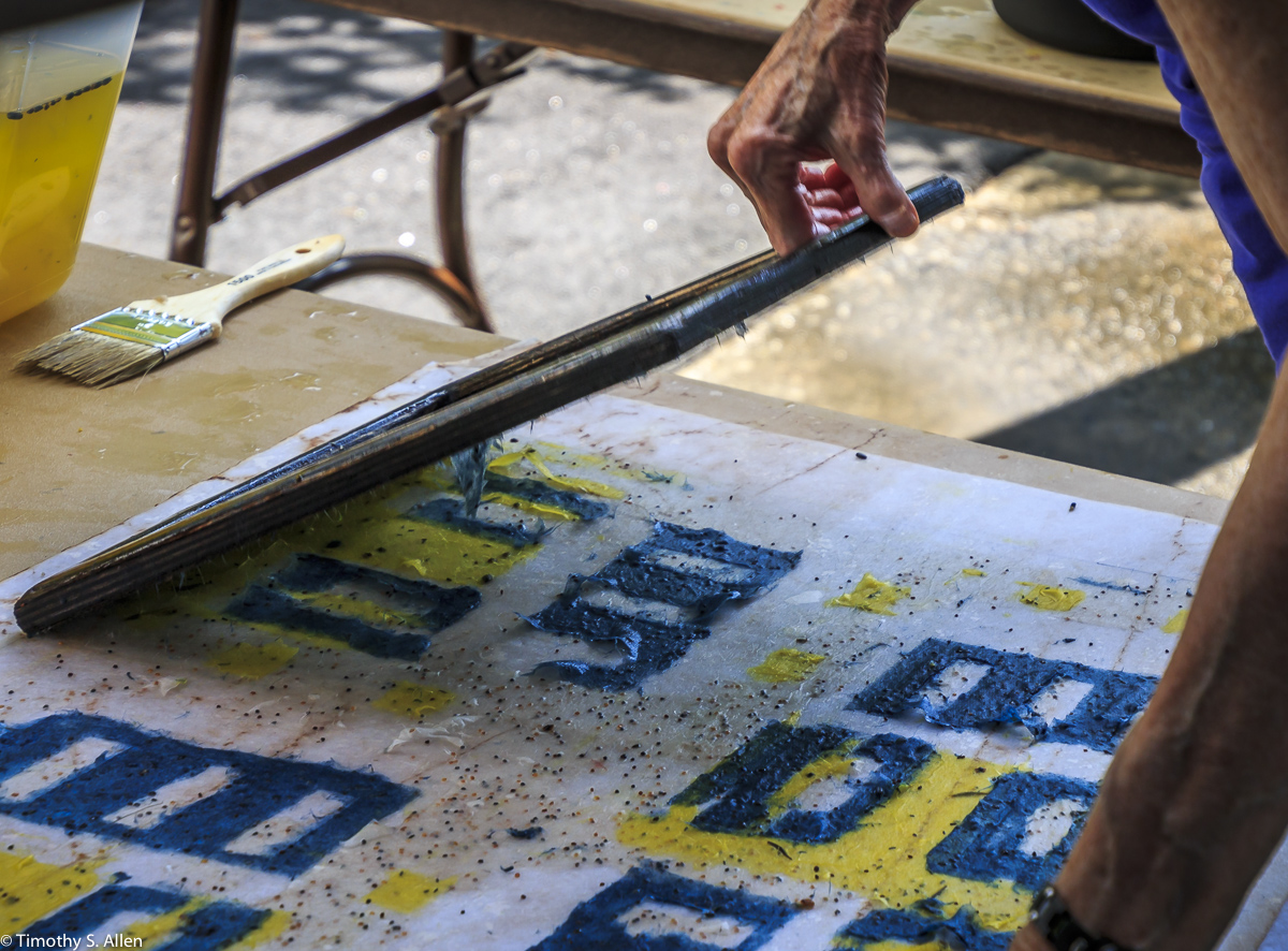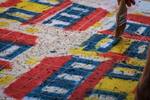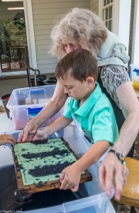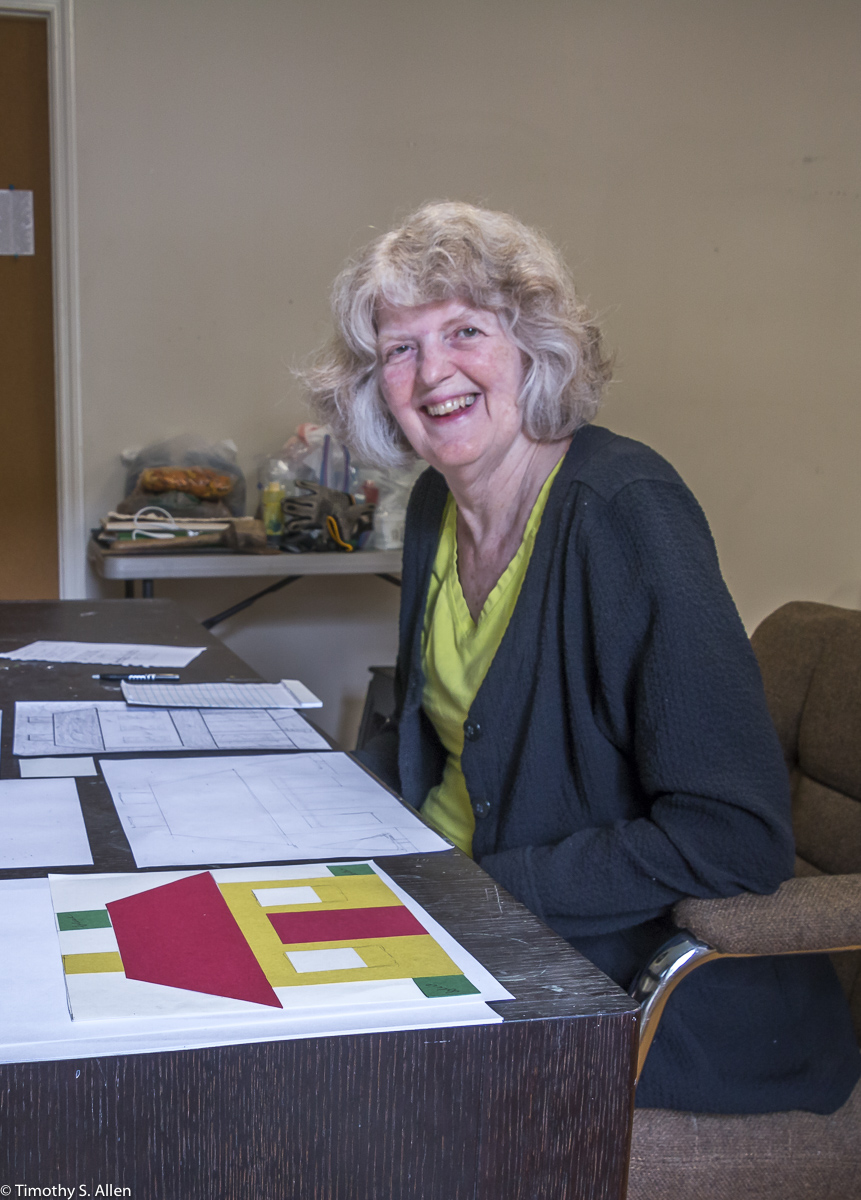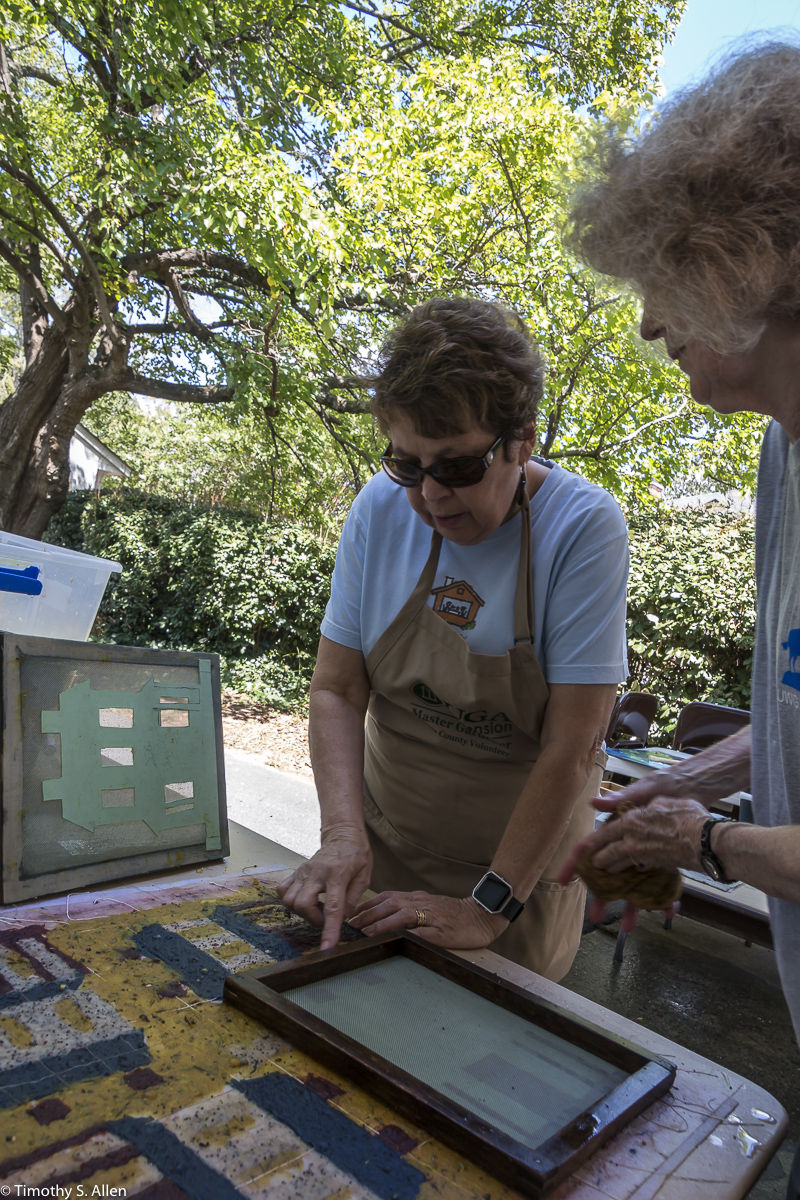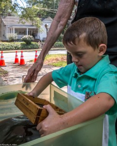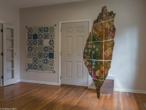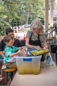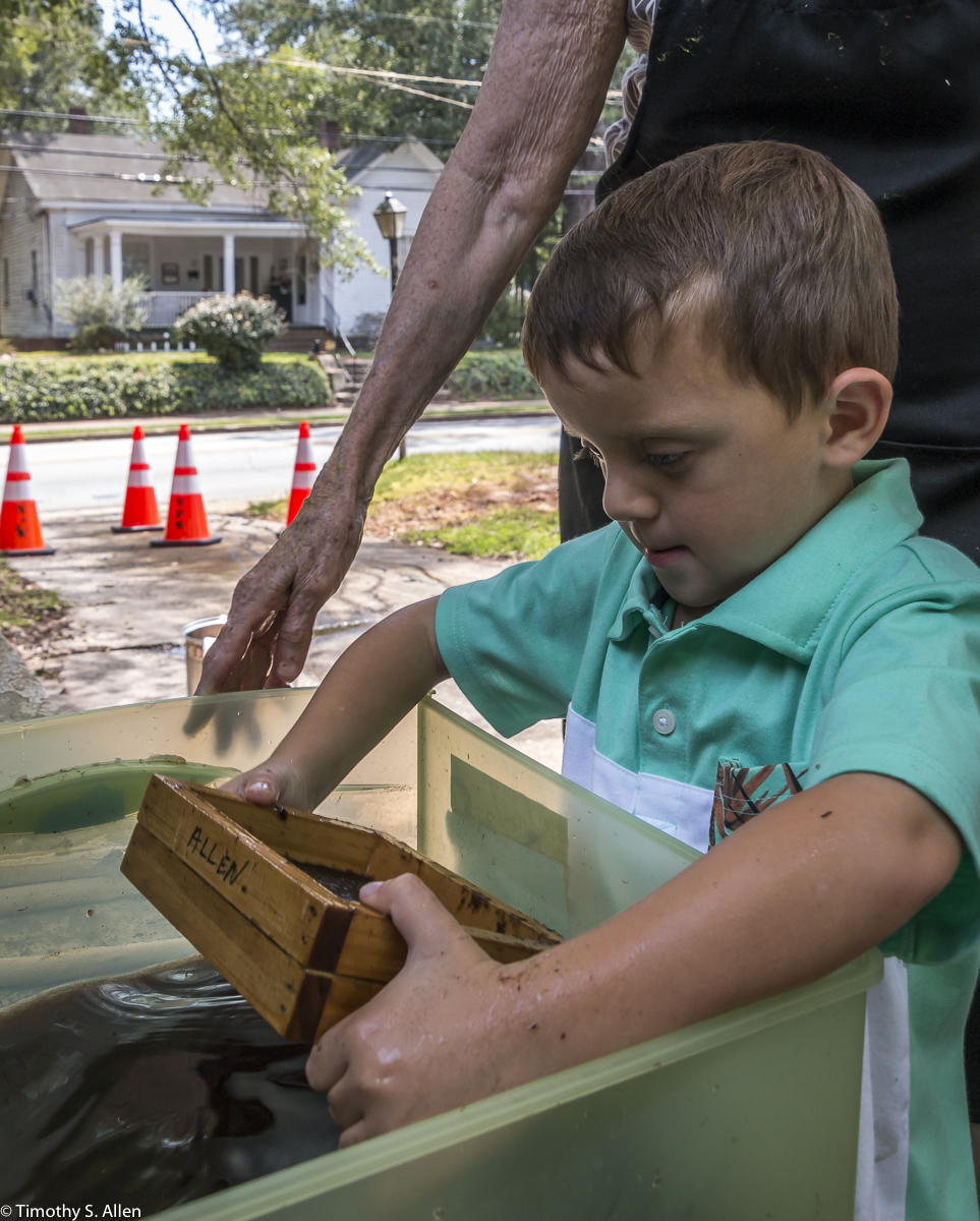 I am continuing my residency with Newnan Art Rez (www.newnanartist.org),and these photos by my husband Timothy S. Allen tell the story of what is happening. We are continuing to make blocks for the handmade paper “eco-quilt” in a house pattern that will be put on the prepared bed of soil on August 31 in Newnan at a site near the corner of College and Temple next to the Veteran’s Park and the children’s museum (site of the old Male Academy in Newnan). The handmade paper quilt contains seeds for wildflowers in the same colors as the pattern. Over time as the all biodegradable handmade paper quilt dissolves into mulch, the seeds will sprout and grow and bloom as wildflowers to make a continually evolving public artwork in Newnan.