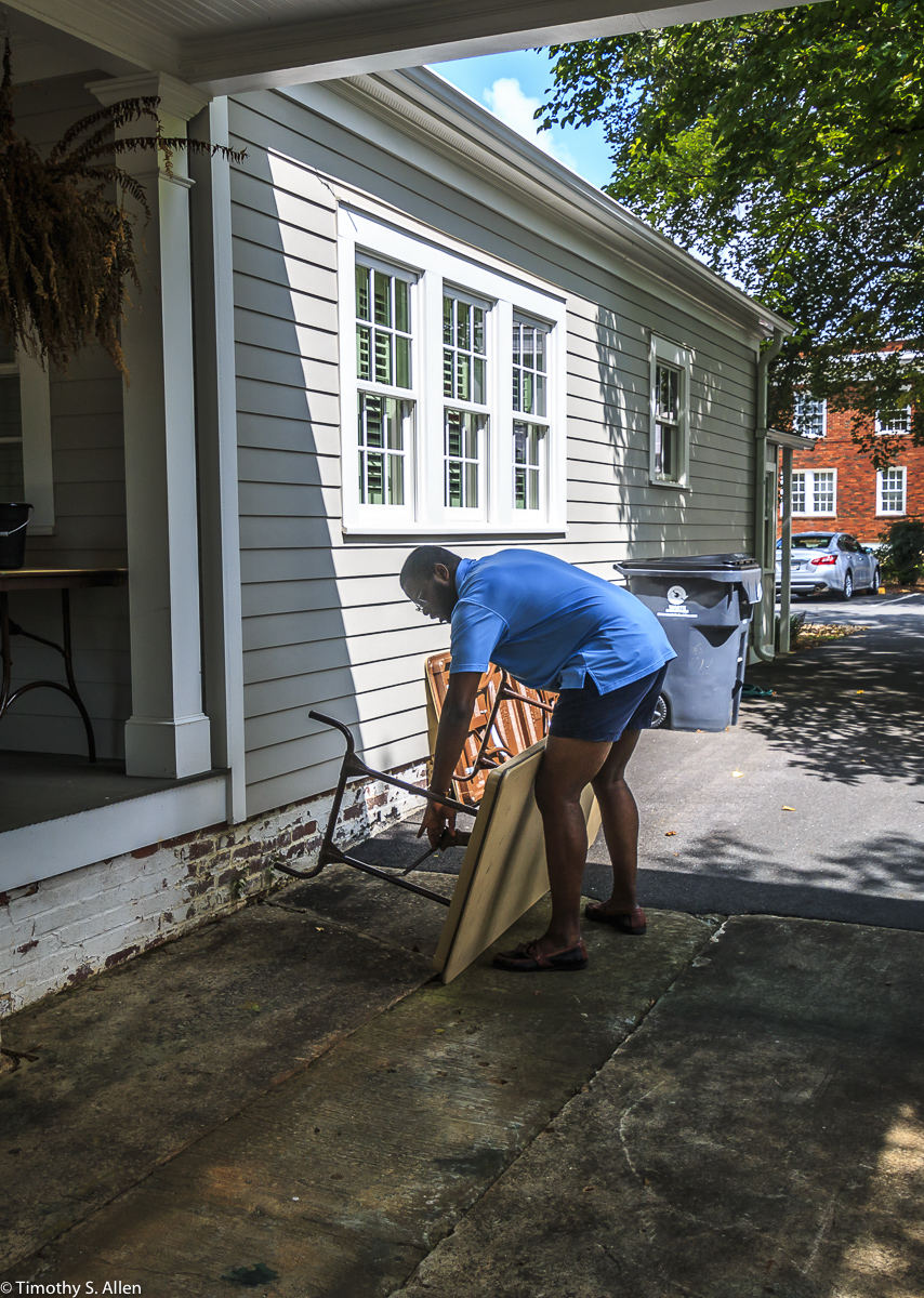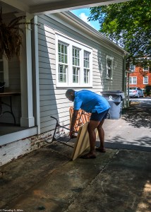 Andrew McCabe, Newnan Art Rez board member, helping set up the tables for the outdoor studio at Gray Cottage.