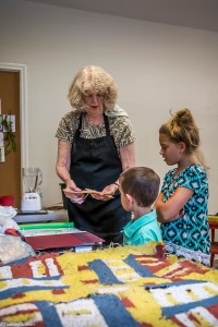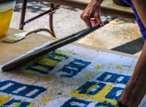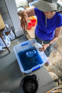 Bringing the quilt block inside to dry. It is a little windy outside sometimes in the afternoon so we bring them inside to dry on a clothesline overnight.