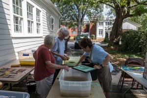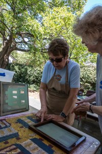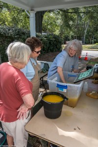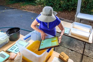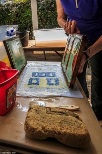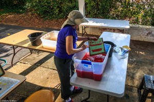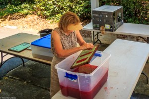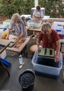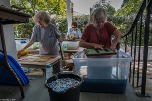 Volunteers from the Master Gardener’s group in Newnan came to help yesterday and learn the process. Other community volunteers also came by in the afternoon to participate and observe the process of making the Newnan eco-quilt. We plan to make a 60 inch by 80 inch queen size bed quilt and need 12 of the 20 inch squares that are made from 4 sheets of paper that are in 4 layers each. So that means lots of papermaking! We are working outdoors in the carport and front porch area at Gray Cottage, 23 Clark Street in Newnan.