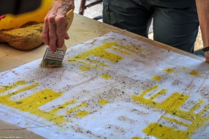 The 20 inch quilt block close up. Here I am using a paint brush to pat down the layers and make sure it is all adhered to the sheet of non-woven interfacing before hanging it to dry