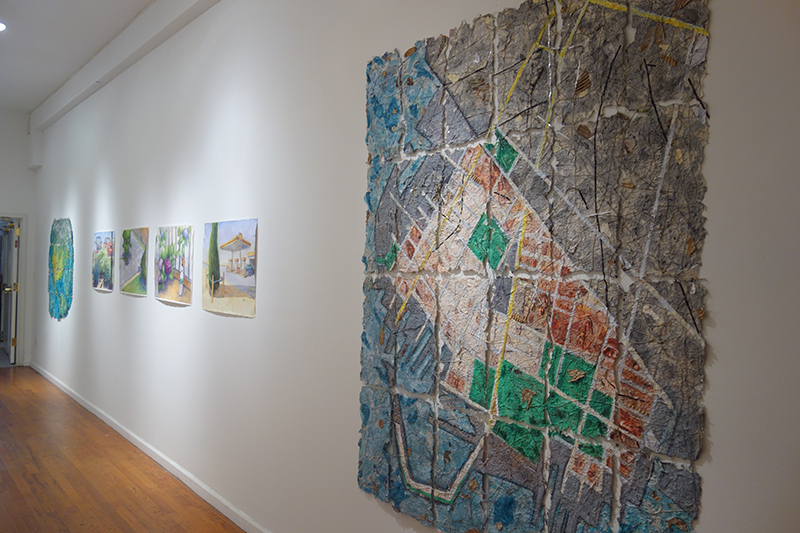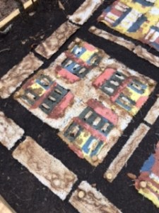 The quilt is made with hand papermaking using stencils and dyed pulp from purchased and local plant materials and has seeds in the paper pulp for Southeastern wildflowers in the same colors as the quilt pattern. I used bark from cedar, crepe myrtle, magnolia, mulberry, paper bush and wisteria to make paper in Newnan and created a recipe and sample book for Newnan papermaking plants. The Newnan Living Quilt has a house motif and features a 2-story antebellum home in red, yellow, blue and white colors. The homes are around a square in the middle of each 20-inch quilt square, and each home is composed of 8 layers of handmade paper with natural string in between layers helping to hold it all together.