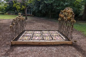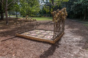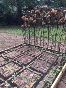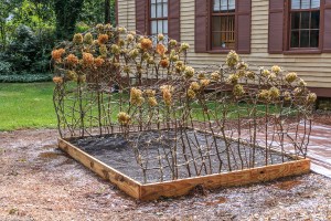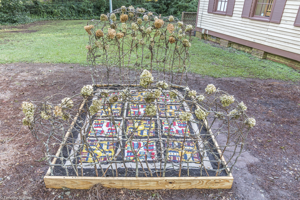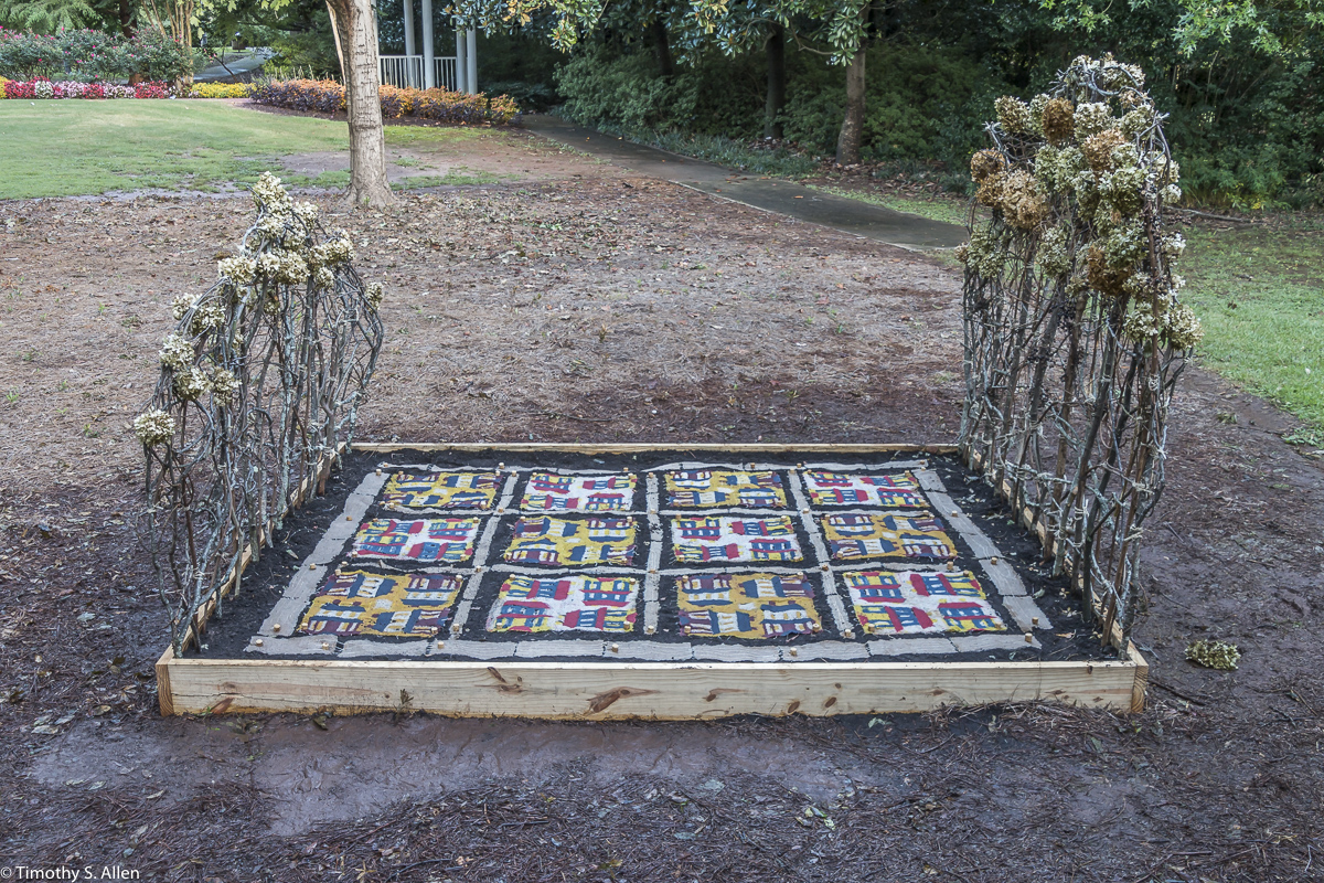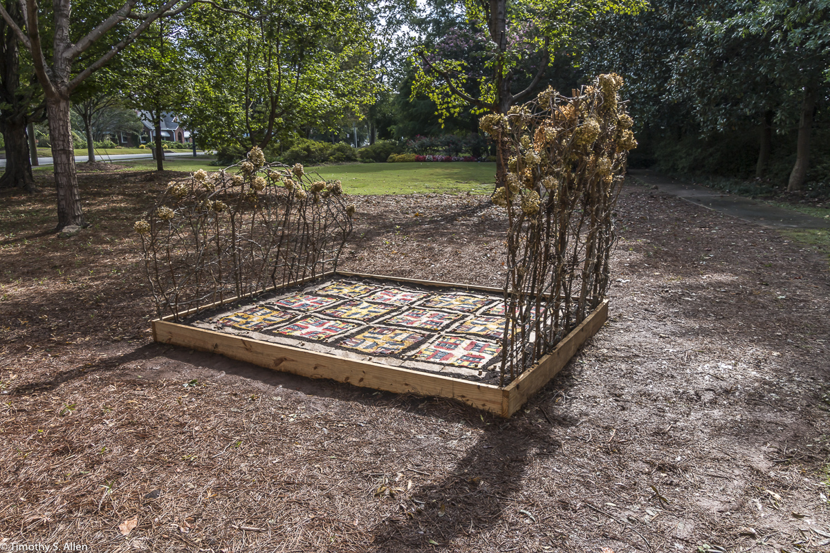 At the August 31 ceremony, local children laid out the squares and put in the stakes, and then a local minister/poet offered a prayer/blessing for the quilt. I am very grateful to all the volunteers who helped make the handmade paper quilt and construct the “bed. The headboard and footboard are made with local branches collected along the streets of Newnan after people had done some tree trimming. The headboard and footboard also contain wisteria and other vines and lots of hydrangea blossoms that someone had recently clipped off and left to be picked up.
