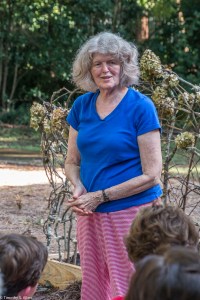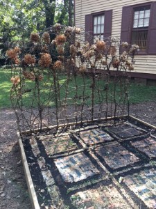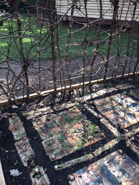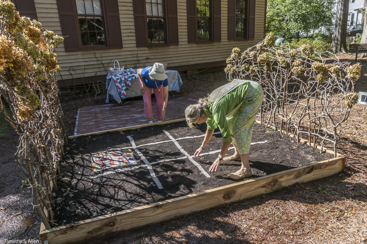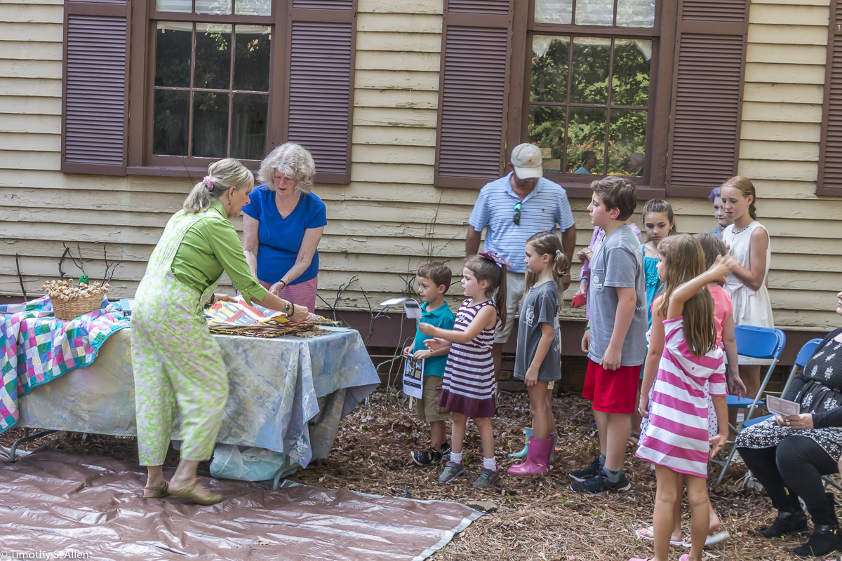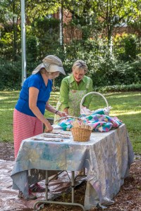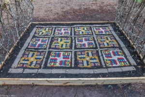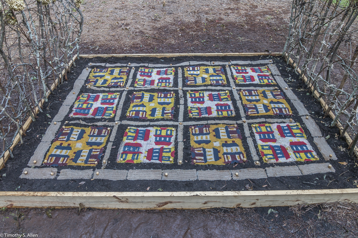 At the August 31 ceremony, local children laid out the squares and put in the stakes, and then a local minister/poet offered a prayer/blessing for the quilt. I am very grateful to all the volunteers who helped make the handmade paper quilt and construct the “bed. The headboard and footboard are made with local branches collected along the streets of Newnan after people had done some tree trimming. The headboard and footboard also contain wisteria and other vines and lots of hydrangea blossoms that someone had recently clipped off and left to be picked up.