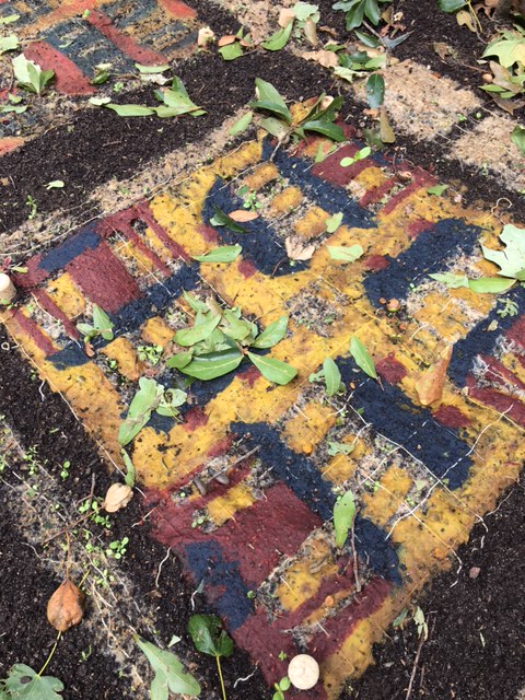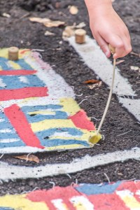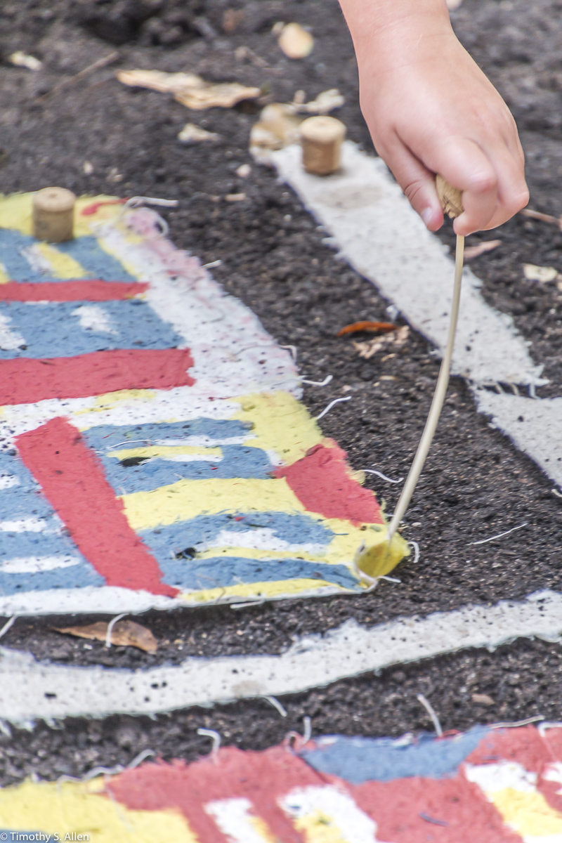 close up of putting in a stake to hold the handmade paper quilt on the ground