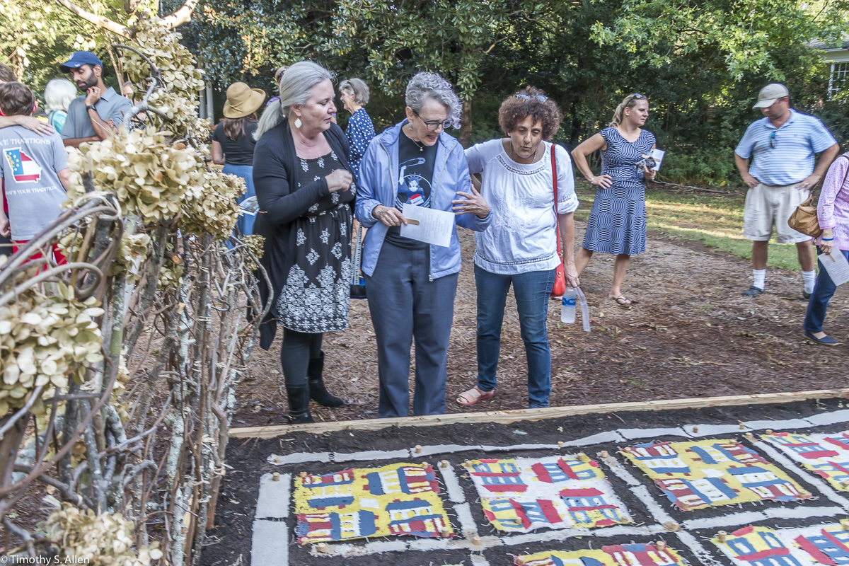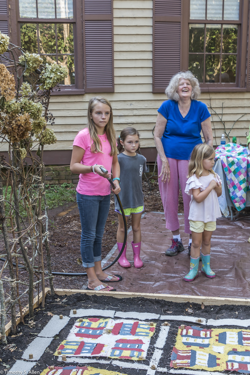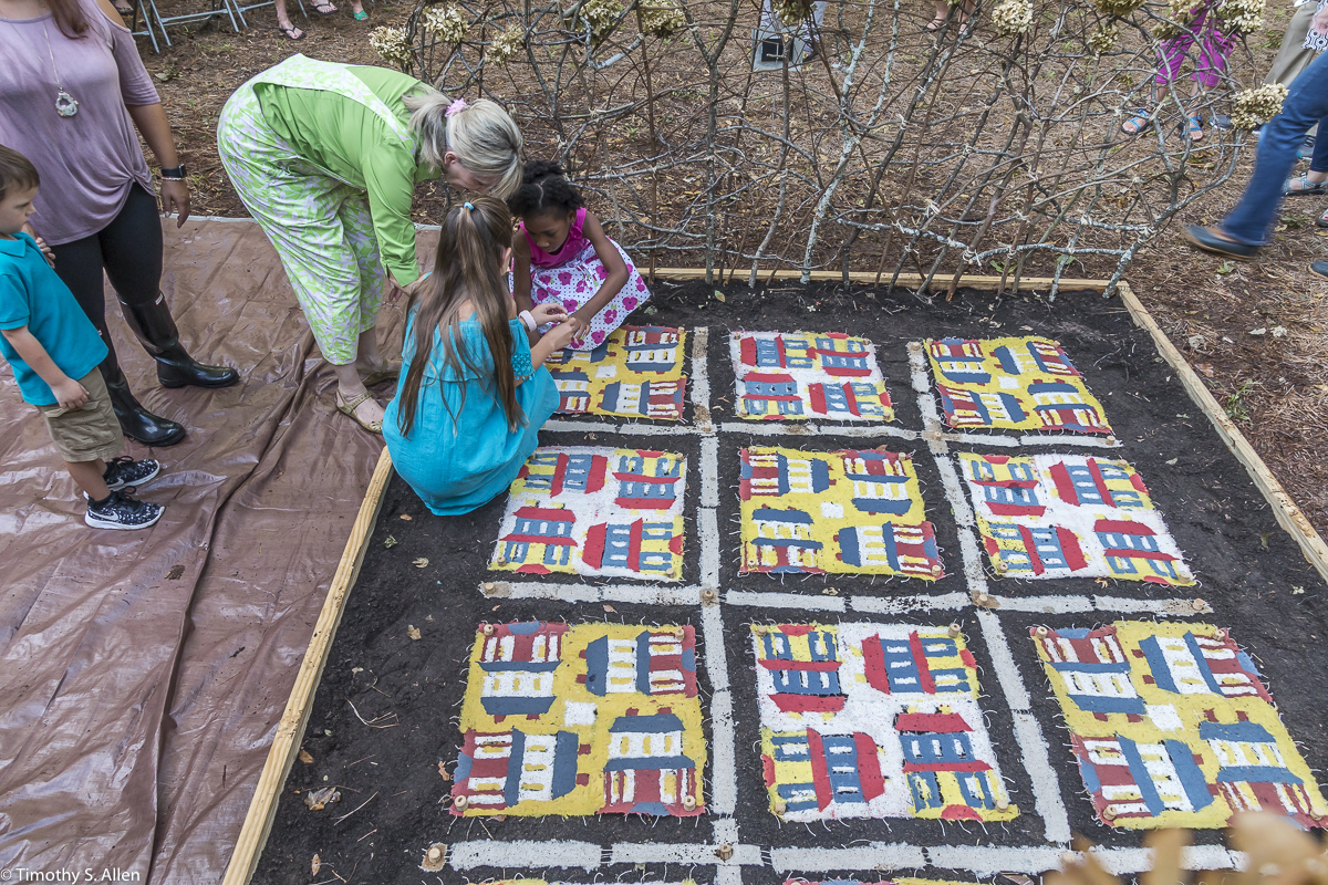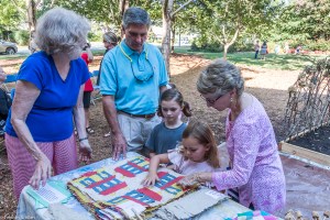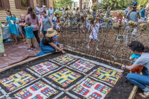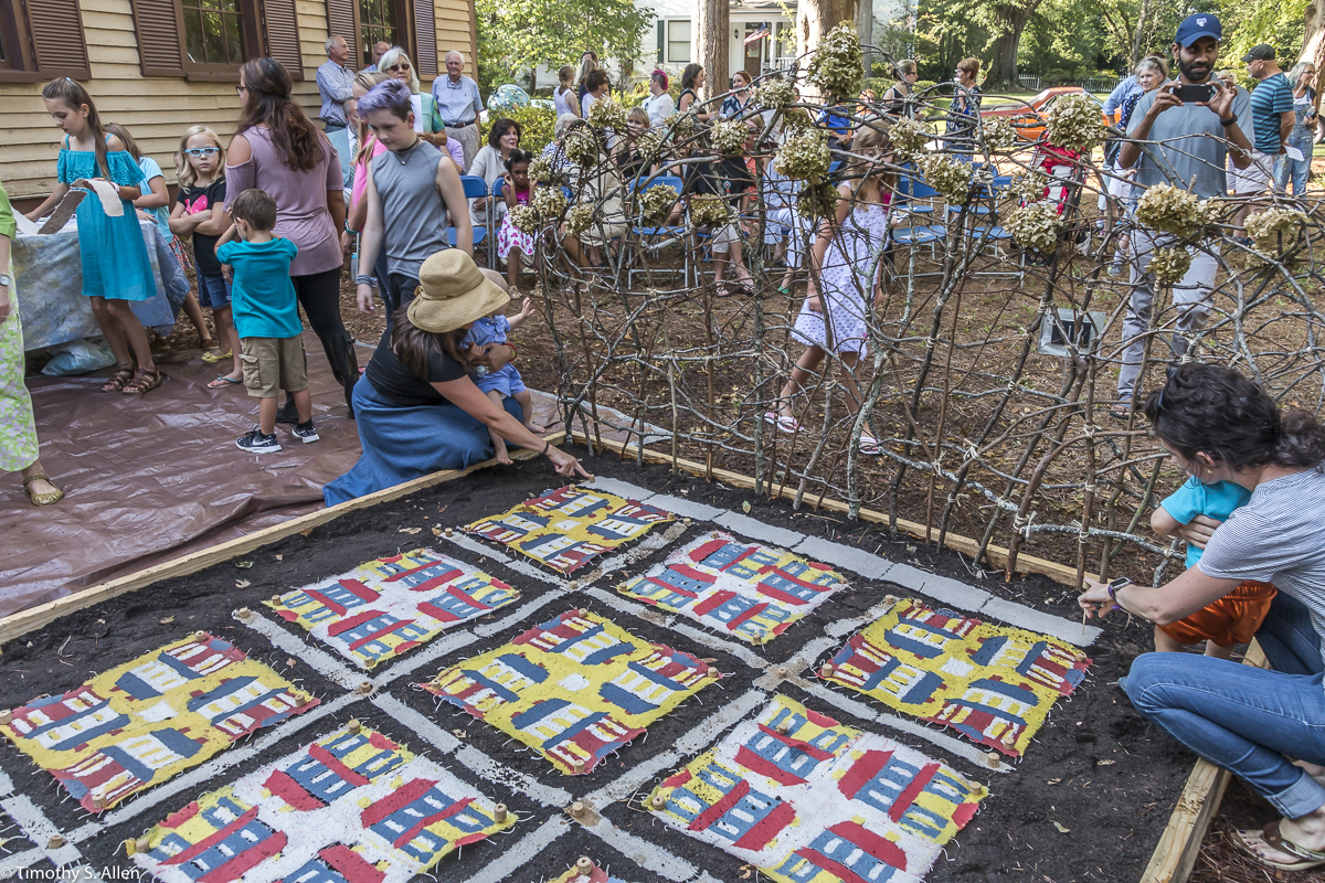 My “Living Quilt for Newnan – City of Homes” was installed at 6 PM on Thursday, August 31, 2017. The weather turned out perfect with even some sunshine after a morning and evening before of heavy rains. Many people came out to enjoy the installation and dedication ceremony including the mayor of Newnan and Art Rez Board Members and many local children who helped to install the handmade paper quilt squares. We staked down the quilt with bamboo skewers with a cork on top, all being biodegradable materials.