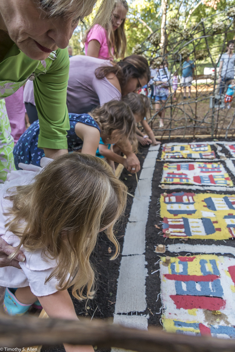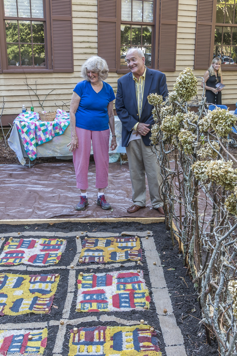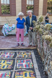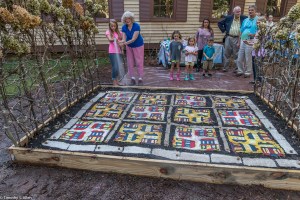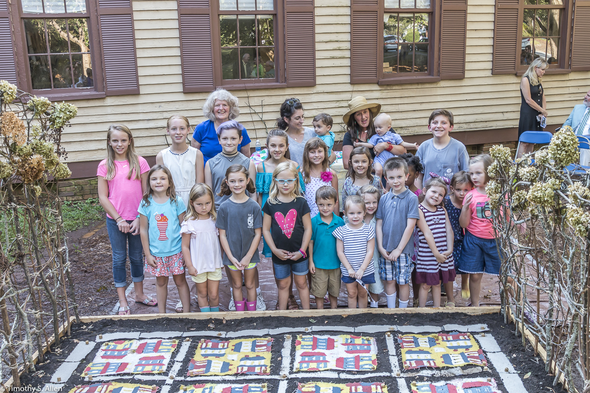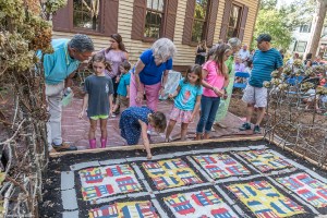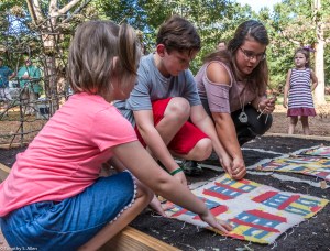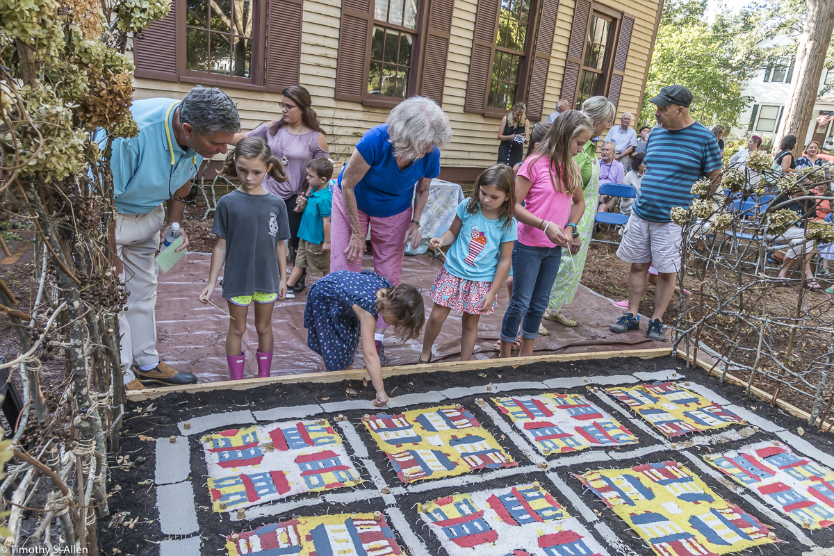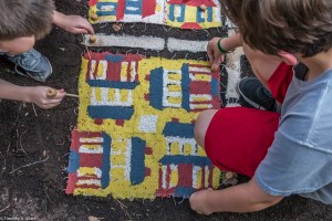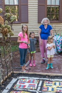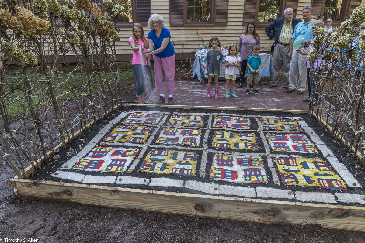 My “Living Quilt for Newnan – City of Homes” was installed at 6 PM on Thursday, August 31, 2017. The weather turned out perfect with even some sunshine after a morning and evening before of heavy rains. Many people came out to enjoy the installation and dedication ceremony including the mayor of Newnan and Art Rez Board Members and many local children who helped to install the handmade paper quilt squares. We staked down the quilt with bamboo skewers with a cork on top, all being biodegradable materials.