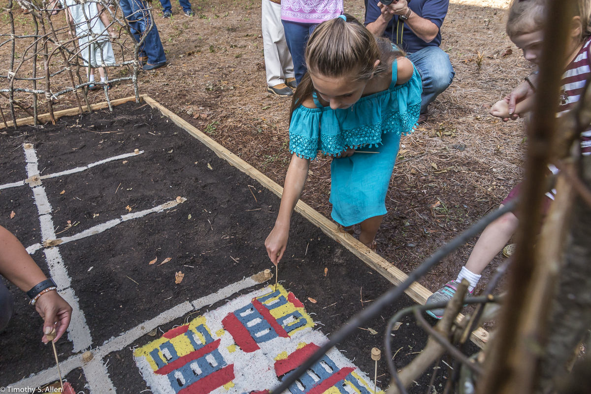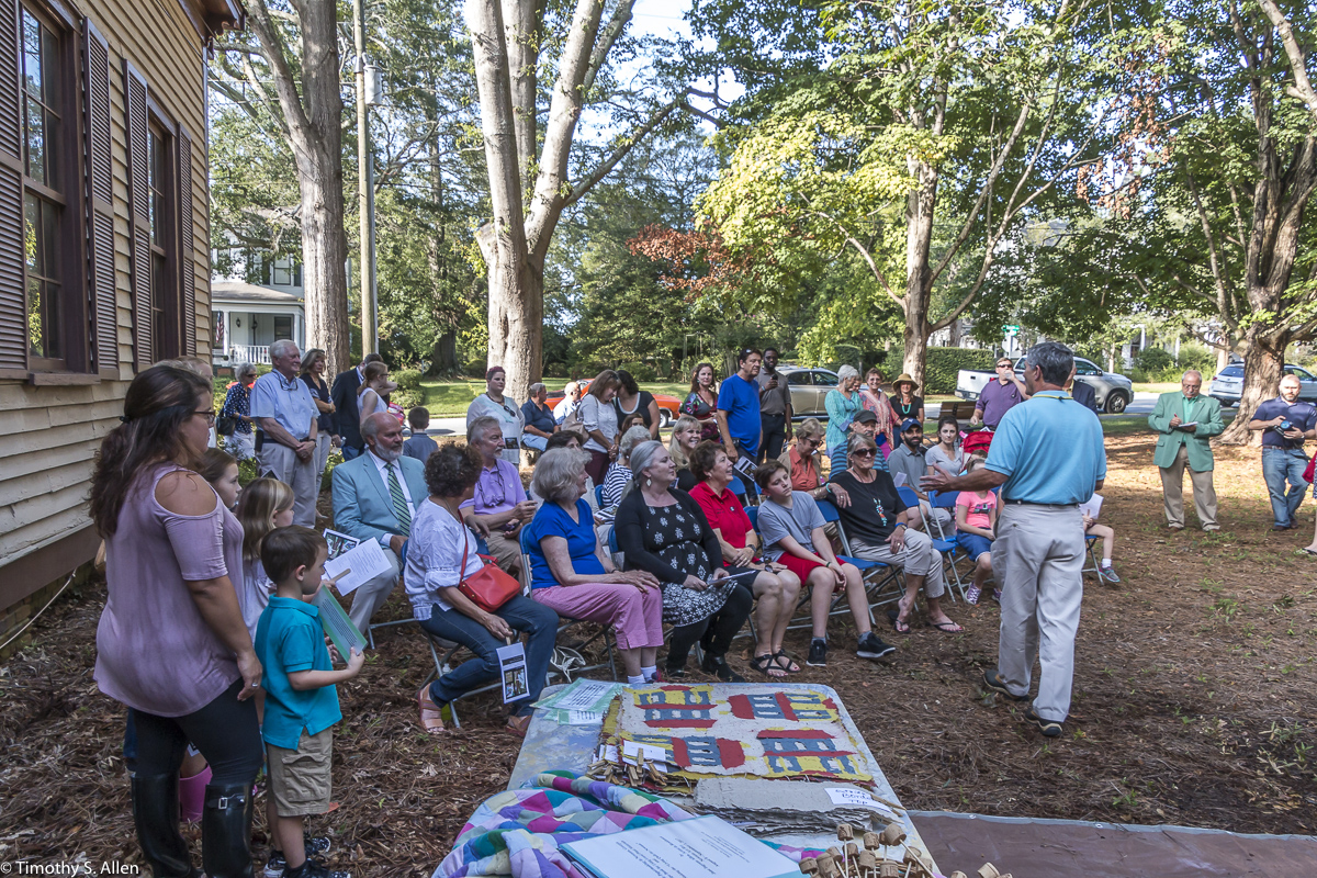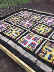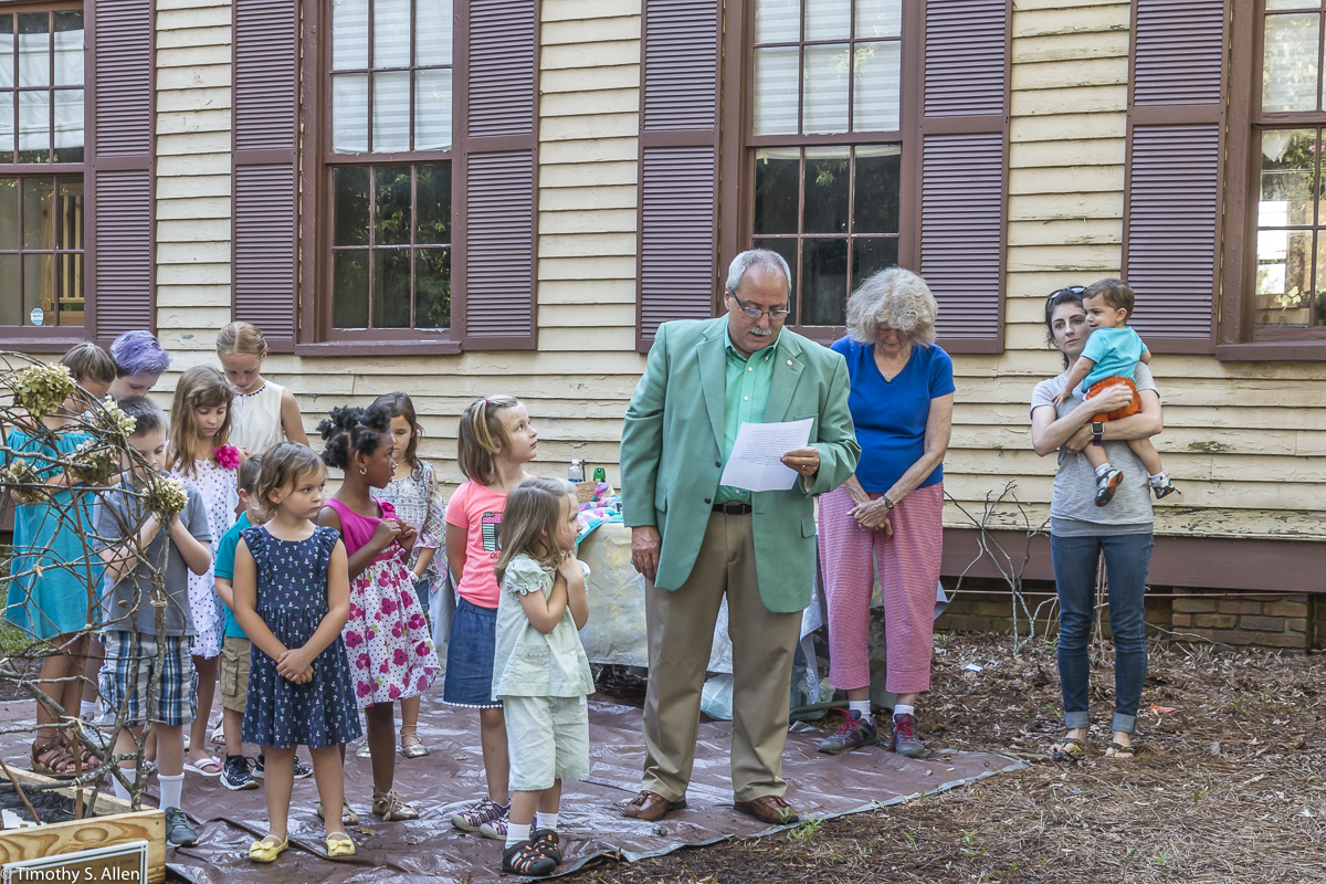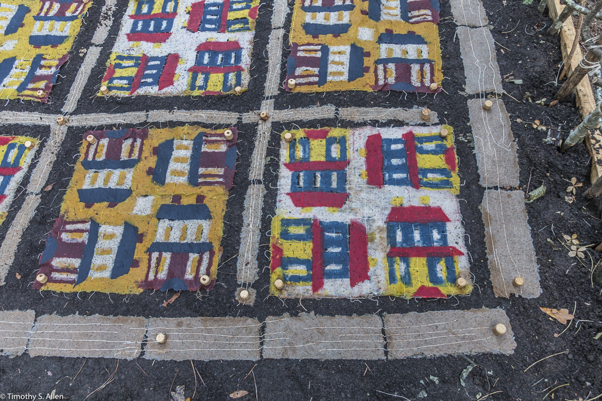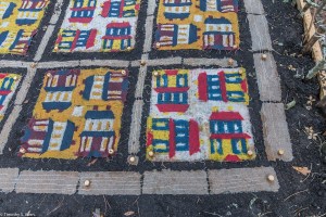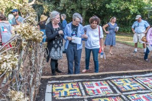 My “Living Quilt for Newnan – City of Homes” was installed at 6 PM on Thursday, August 31, 2017. The weather turned out perfect with even some sunshine after a morning and evening before of heavy rains. Many people came out to enjoy the installation and dedication ceremony including the mayor of Newnan and Art Rez Board Members and many local children who helped to install the handmade paper quilt squares. We staked down the quilt with bamboo skewers with a cork on top, all being biodegradable materials.
