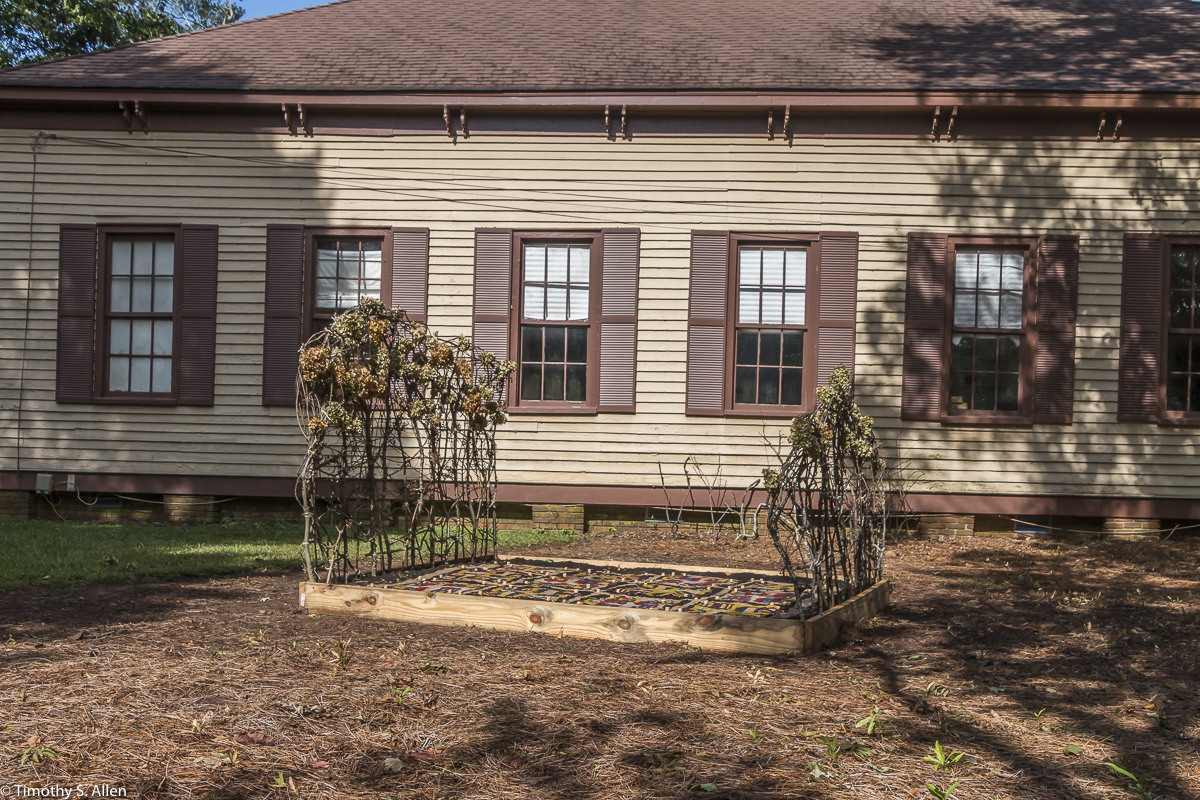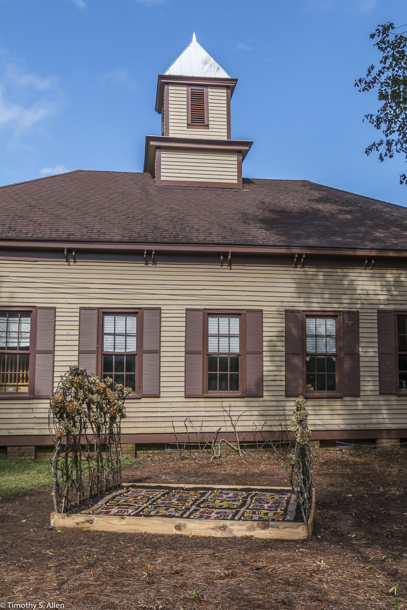 view of the installed “Newnan Living Quilt” and the Male Academy Museum building