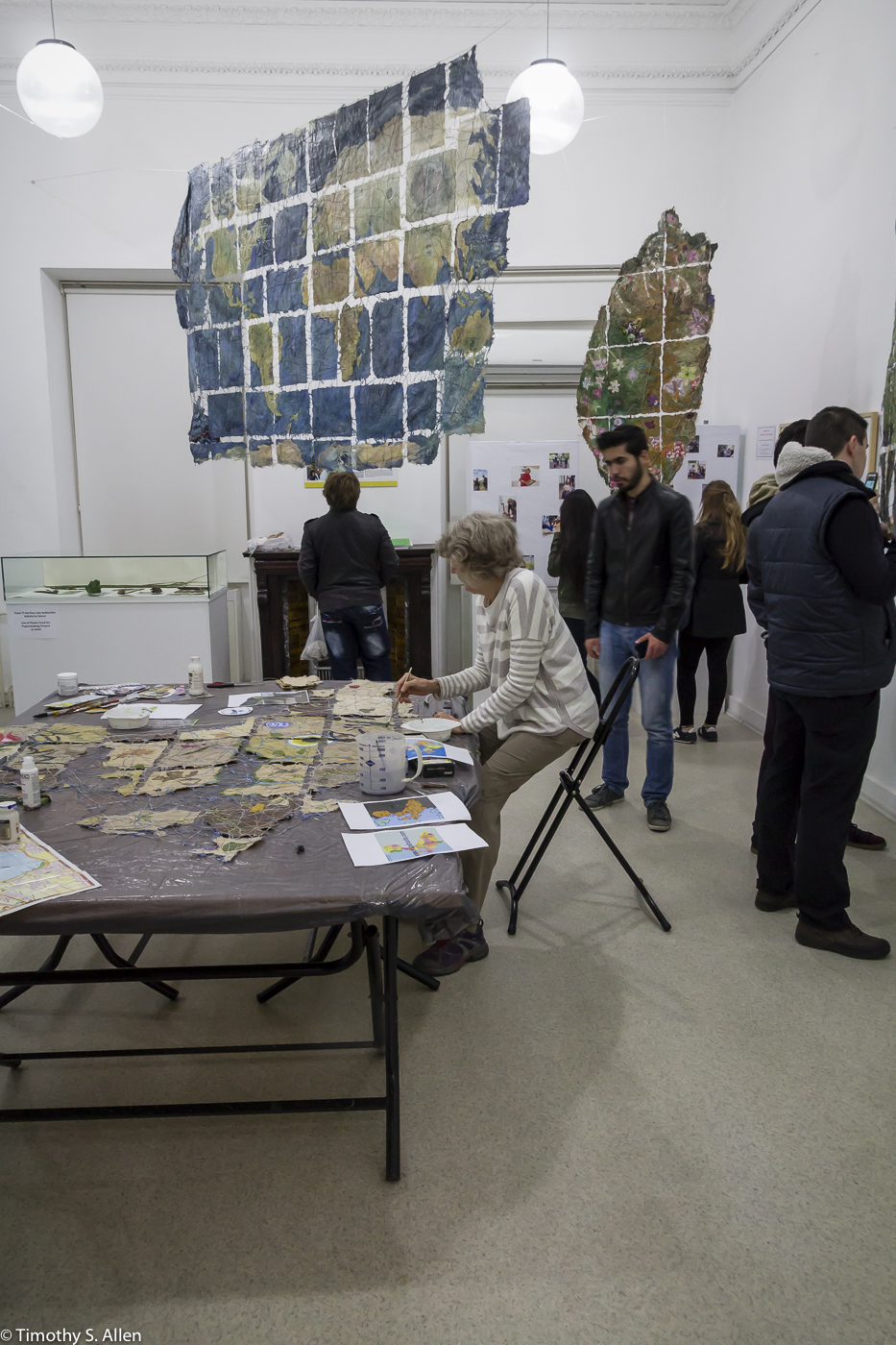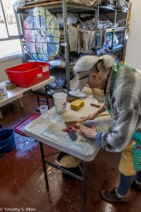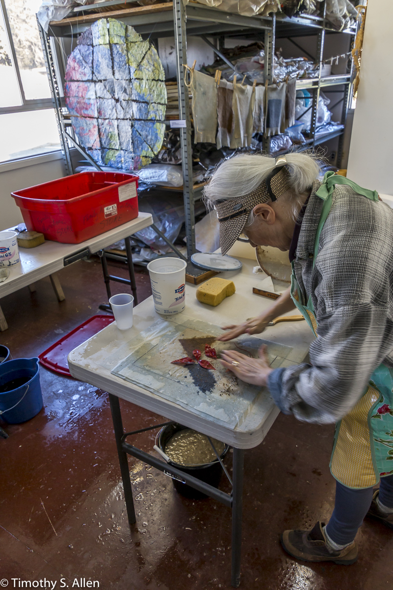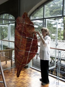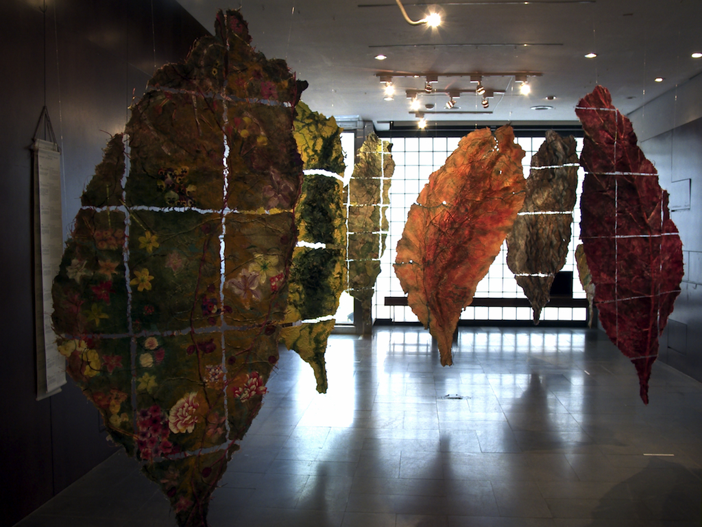Jane creating mixed media Izmir Site Map with handmade paper from plants of Izmir, Turkey, during her 2015 Fulbright Specialist artist in residency at Ege University, Izmir, Turkey. More of Jane’s mixed-media site map works hang in the gallery.