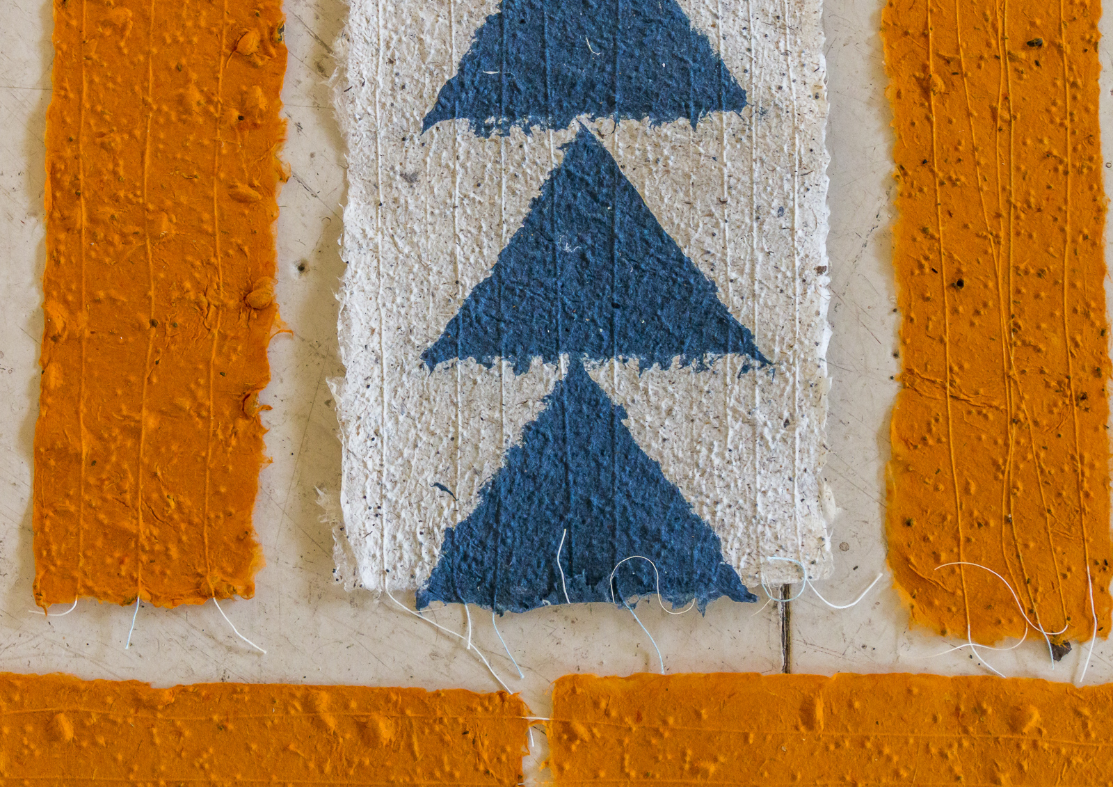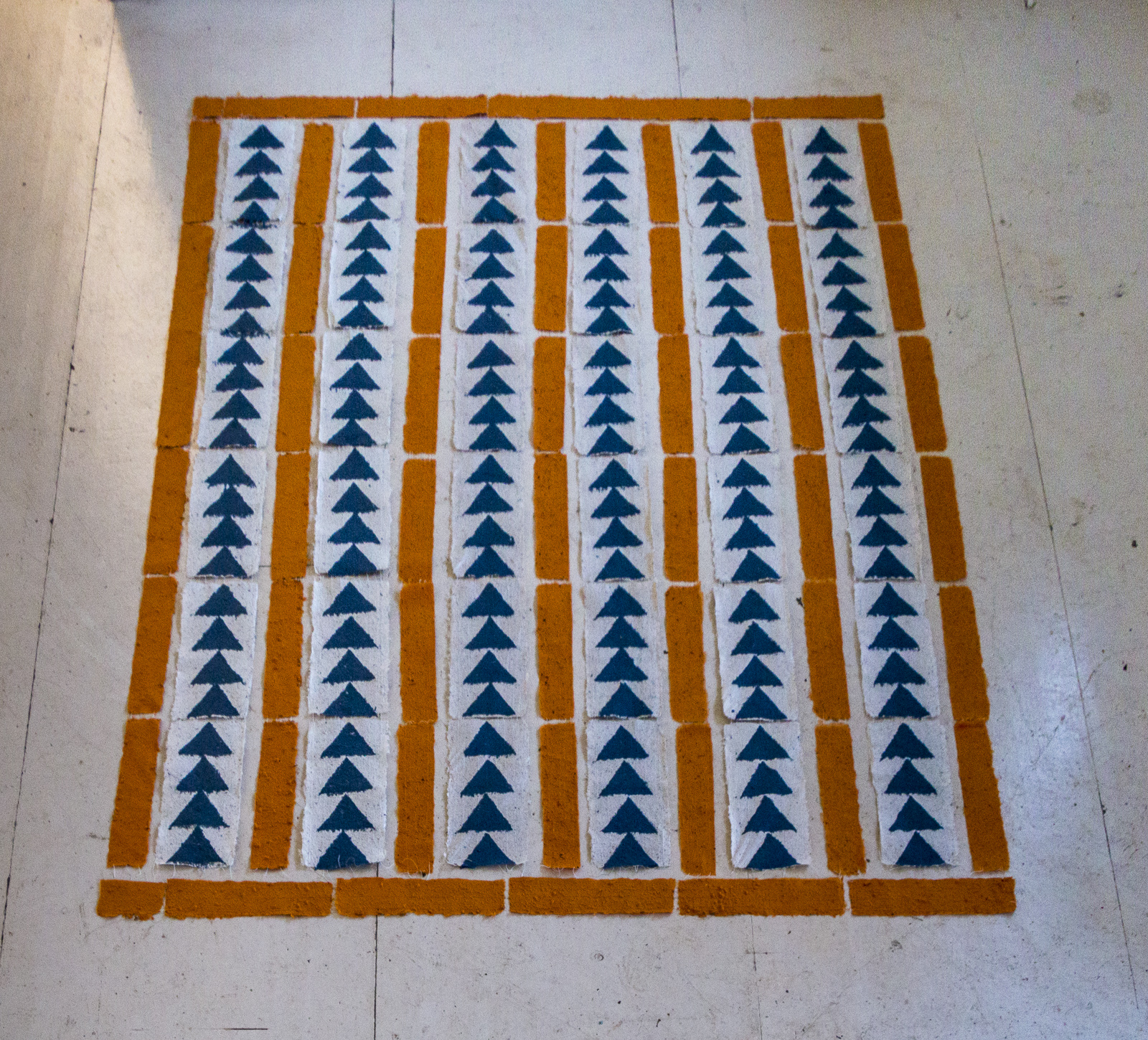 Jane Ingram Allen has been awarded a grant by the City of Santa Rosa for a public art project to commemorate the October 2017 wildfires in Santa Rosa, California, that destroyed so many homes, businesses and forests. Jane’s artwork “Living Quilt for Santa Rosa” consists of a handmade paper quilt with seeds for wildflowers added to the pulp in the same colors as the quilt pattern. The quilt uses the traditional “Wild Geese” quilt pattern. The blue color in the quilt is paper pulp made from recycled blue jeans. The yellow-orange pulp is abaca (a type of banana leaf fiber) dyed with a non-toxic fiber reactive dye, and the white pulp is the natural color of the abaca. The wildflower seeds in the yellow-orange strips are for California poppies. The seeds in the blue pulp are for California bluebells and mixed blue wildflowers, and the seeds in the white pulp are for Baby’s Breath and white poppies. Community people will join the artist in helping to make the handmade paper quilt and weave a headboard and footboard of local trimmed branches for the “flower bed”. All of the materials in this eco-quilt are natural and bio-degradable and will change over time to become a living, blooming bed of wildflowers. “Living Quilt for Santa Rosa” will be installed in a public ceremony at Rincon Ridge Park, off Fountaingrove Parkway, in Santa Rosa, CA, at 2PM on Saturday, Dec. 1.