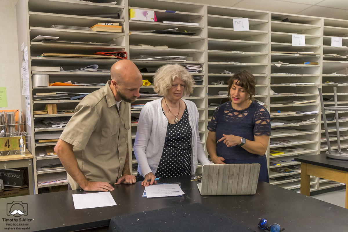 Jim Vetter, Chelsea Greninger and Jane Ingram Allen at South Natomas Community Center, Sacramento, choosing site for “Guns into Flowers” installation.