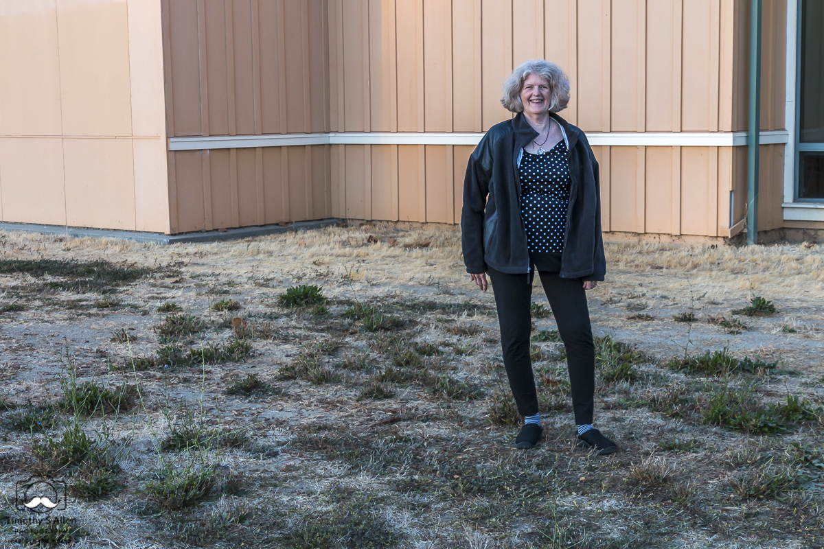 Jane standing at site for “Guns into Flowers” installation at South Natomas Community Center, Sacramento, CA.