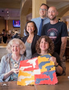 Jane and Chelsea Greninger, Natomas Charter School Visual Arts teacher hold a prototype for a quilt square for the Guns into Flowers art project. Natomas Charter School Principal Dr. Ting Sun and visual arts teacher Jim Vetter and Donald Gensler with Sacramento Metropolitan Arts Commission look on.