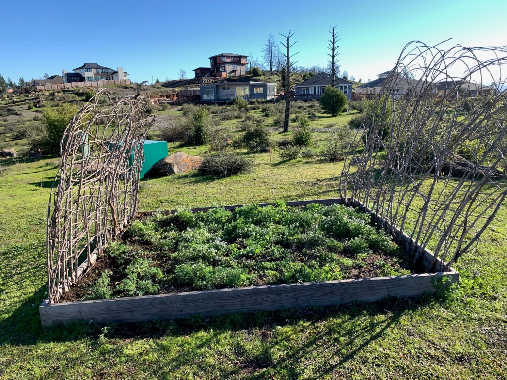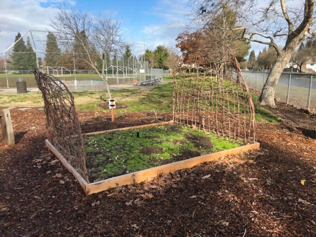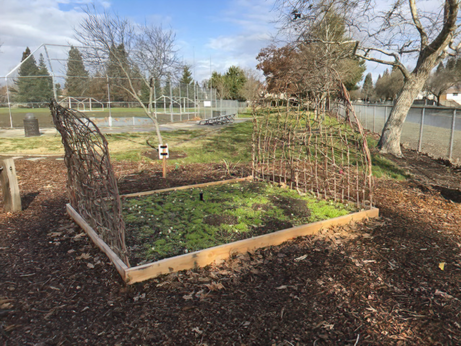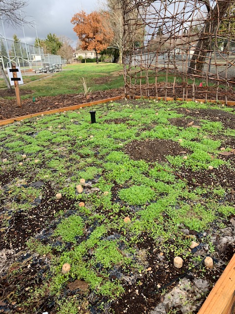 I am happy to report that my art installation “Living Quilt for Sojourner Truth” at Sojourner Truth Community Garden in Sacramento has survived the recent storm last week that caused power outages, lots of rain, high winds and even mudslides and highway damages in northern California. Friends in Sacramento sent me photos to show the “bed” still in place and the sprouting wildflowers continuing to grow. More snow in higher elevations and more rain is expected this week. We will be waiting to see some blooming wildflowers here when the weather gets warmer and Spring arrives. Here is a photo taken on January 27 after the high winds and heavy rains in Sacramento by Bill Maynard of the Sacramento Parks Department.
