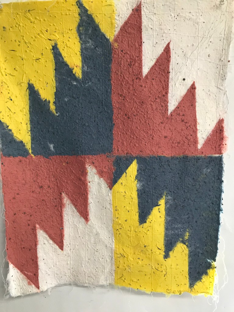 This artwork will be installed in April 2021 in a public park in Steckborn, Switzerland. I was invited to create this outdoor environmental art installation by Haus zur Glocke (https://www.hauszurglocke.ch/home/) Living Quilt for Steckborn is a handmade paper quilt that has seeds for wildflowers in the pulp to grow and change over time into a living flower bed. The quilt pattern I am using for this installation is based on a traditional American quilt pattern called “Delectable Mountains” or “Peaks and Valleys”. This design recalls the journey of American pioneers across the beautiful and sometimes dangerous mountains as they traveled West in wagon trains to settle in the West. The design with tall mountains also refers to the mountains of Switzerland visible from the town of Steckborn, on the shores of Lake Constance in the northeastern part of Switzerland.