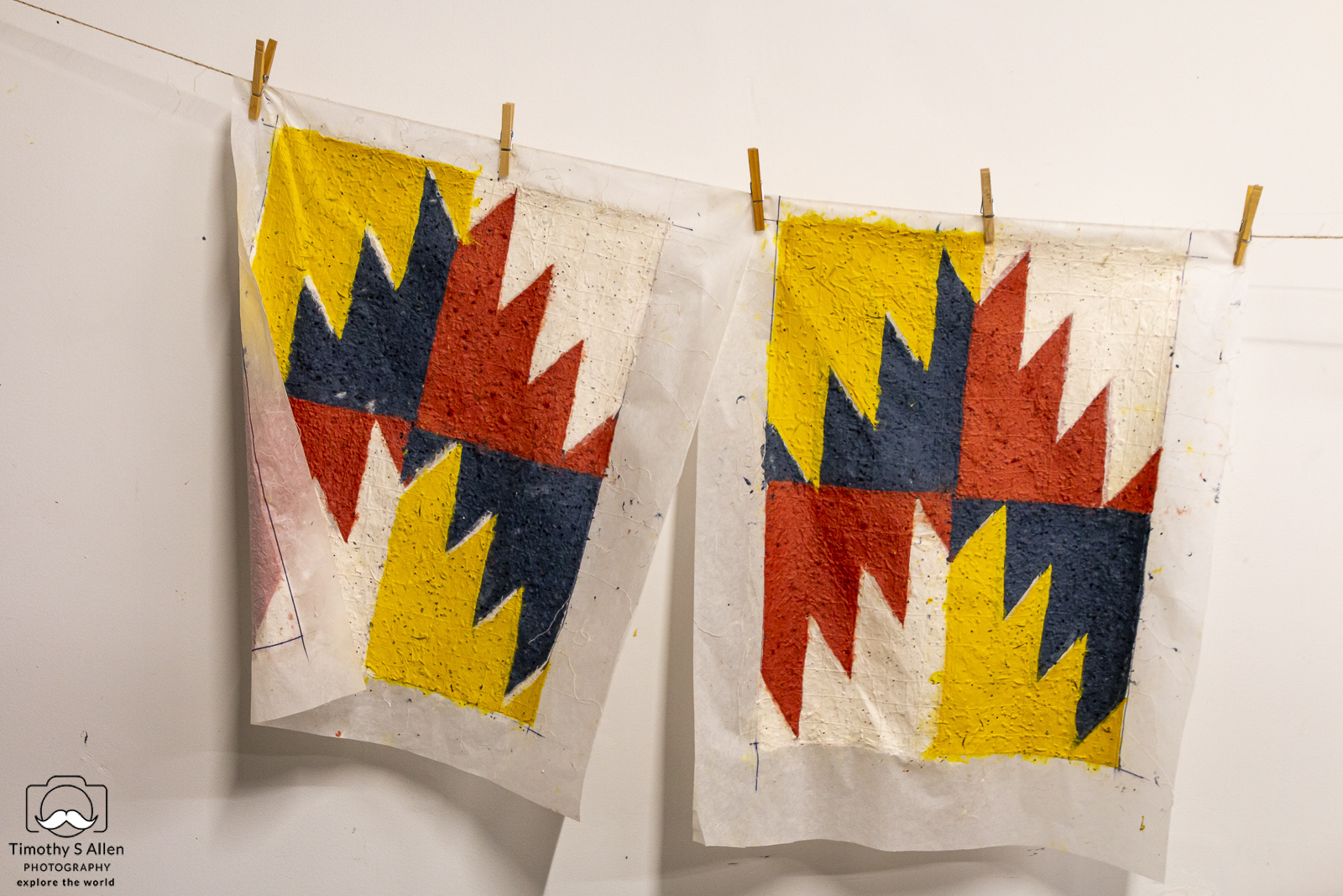 This photo shows me making the handmade paper quilt for Steckborn in my studio. Also, here is a photo of some of the completed blocks hanging on a clothesline to dry.