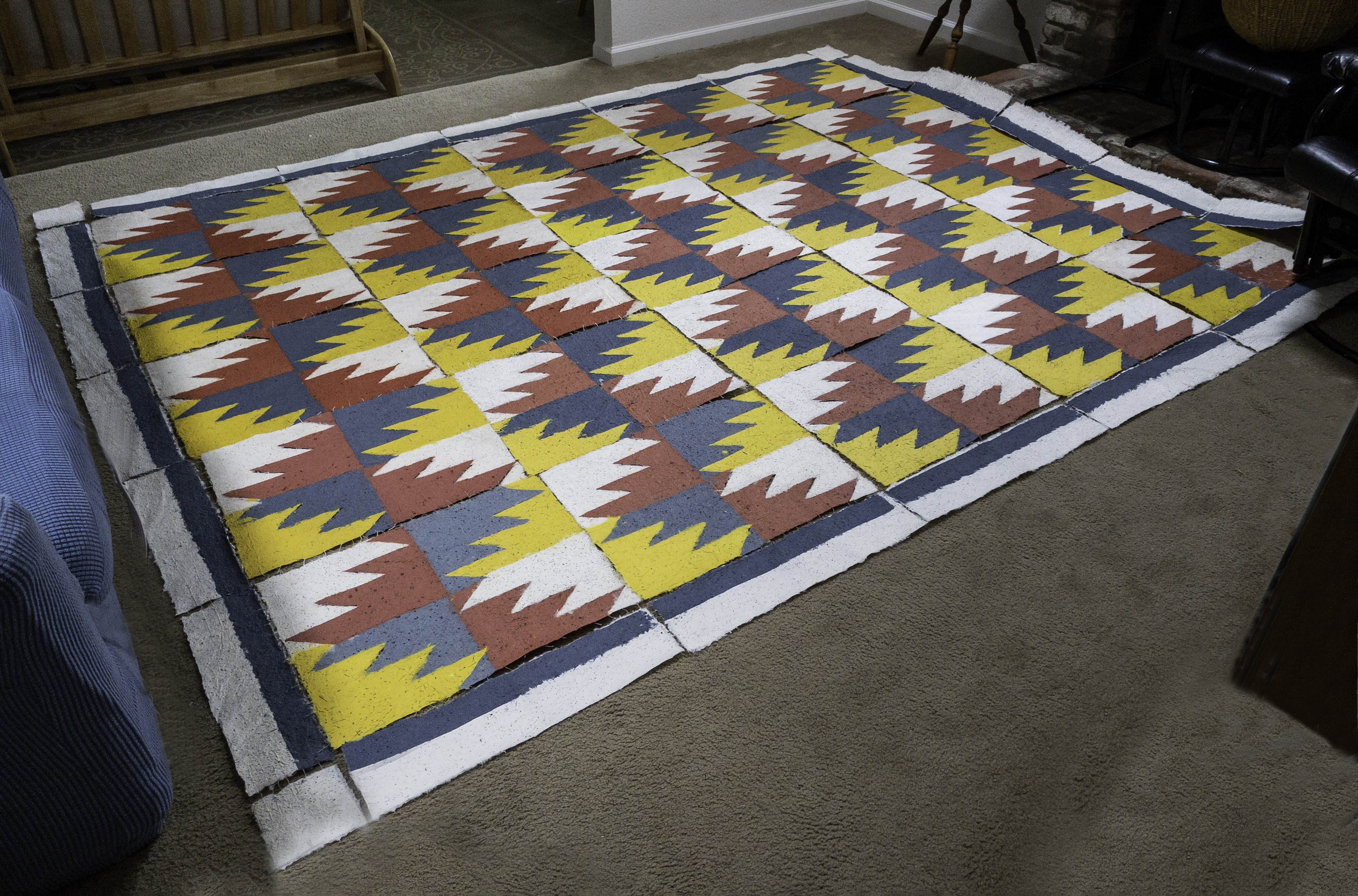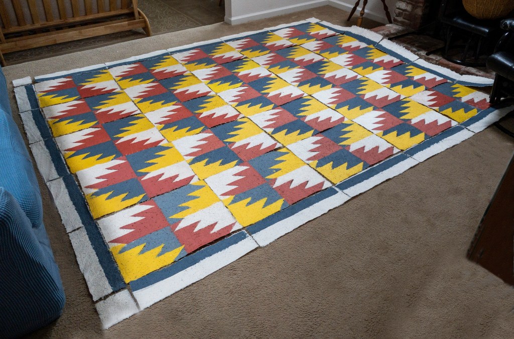 Since I am not able to travel to Switzerland due to pandemic restrictions, my outdoor public artwork “Living Quilt for Steckborn” will be installed by Haus zur Glocke in a pubic ceremony, and it will remain on view to transform into a living blooming bed of wildflowers after several months. The “quilt” is made with handmade paper pulp dyed with non-toxic dyes, and the pulp contains seeds for wildflowers in the same colors and pattern. Over time the paper pulp will dissolve into mulch, and the seeds will sprout and bloom producing a “living quilt”. The previous post on this Blog tells about how I made this artwork in my Santa Rosa studio. Here is a link to a video showing my process and telling more about my design for this “quilt”: https://www.youtube.com/watch?v=CdlRSswGpD0&t=67s