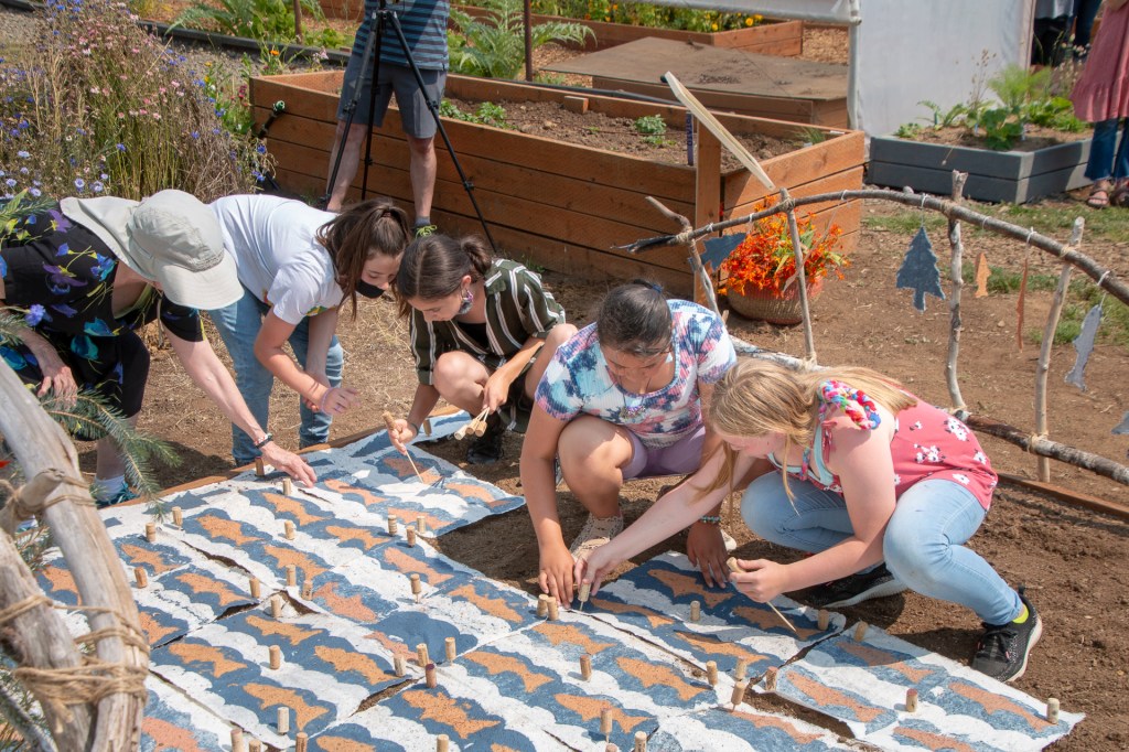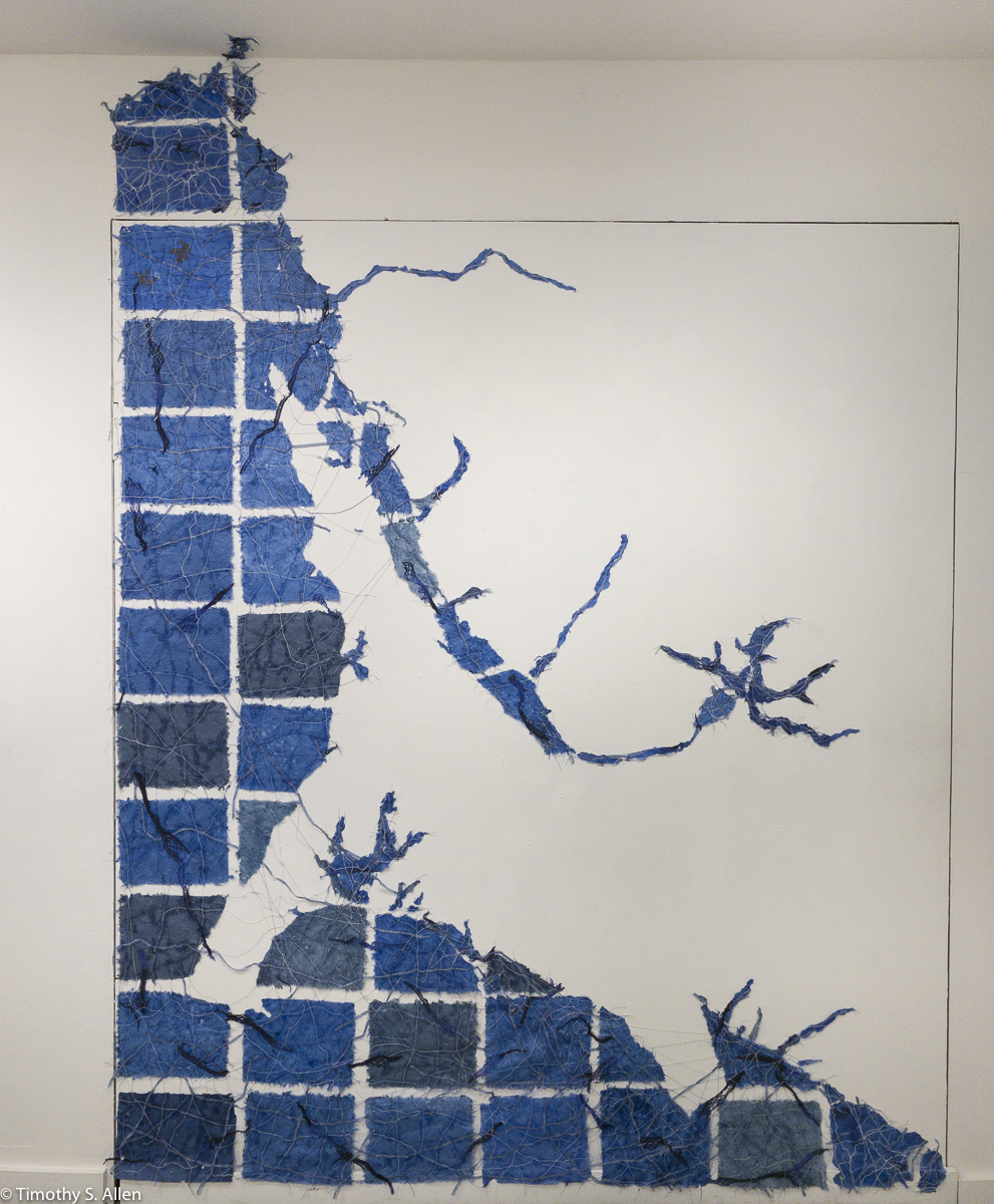 “Point Reyes Waterways” focuses on Extraction and Water. Extraction is a problem because of how we extract what we extract and how much we take without nature being able to replenish it. We almost have to extract something to make anything and to live. My focus is on over-extraction of water, a necessary element for life. Over-use and extraction of underground water causes land subsidence. Global warming and climate change are causing droughts, flooding, rising sea levels and other catastrophic events involving water. This site-specific wall installation of handmade paper, cotton thread and seeds for blue wildflowers highlights the waterways of Point Reyes, and by leaving the land as negative space makes us more aware of the water.