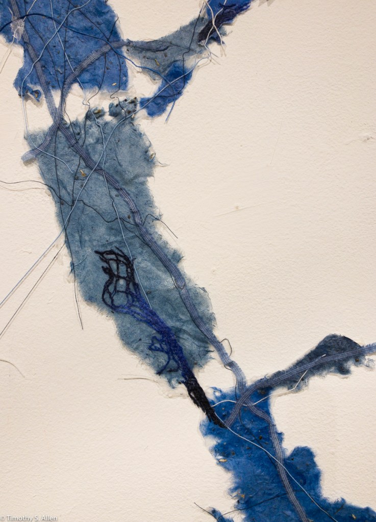 My new art installation titled “Point Reyes Waterways” is up now at Gallery Route One, Pt. Reyes Station, CA. This wall installation of handmade paper and thread is part of the Women Eco Artists Dialog (www.weadartists.org) Extraction Exhibition in the Project Space at Gallery Route One, a non-profit exhibition space with a focus on works connected to the environment. This show is organized by WEAD and part of the huge multi-country, multi-gallery project called Extraction: Art on the Edge of the Abyss (https://www.extractionart.org/home).