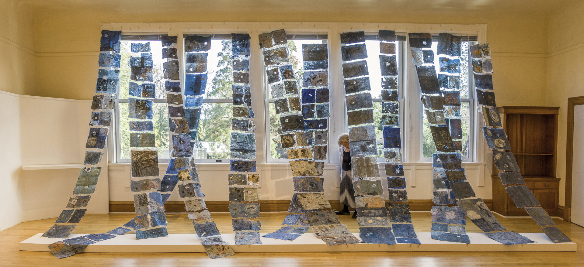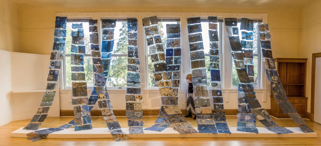 Here’s a photo of the “In Deep Water” installation at Sonoma Community Center Gallery, Sonoma, CA, during January and February 2022. For this installation we used 12 panels each about 15 feet long.