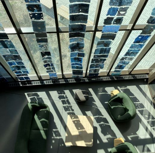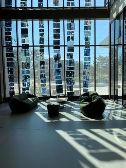 “In Deep Water,” an art installation by Jane Ingram Allen and Jami Taback, is now on public display in the lobby of Rowan University’s new Discovery Hall, home of the School of Earth and Environment. The installation focused on water and the climate crisis consists of 6 long panels each about 25-30 feet long hanging in front of a wall of windows and visible from inside and outside the building. Other smaller “In Deep Water” panels are also displayed in windows near the Dean’s office and Conference Room in Discovery Hall. This collaborative artwork by Allen and Taback incorporates hand papermaking and printmaking, and the transparent sheets of handmade paper are embellished with printmaking and joined with threads. For more information about the work of Allen and Taback, visit these sites: https://janeingramallen.wordpress.com and https://www.jamitaback.com
