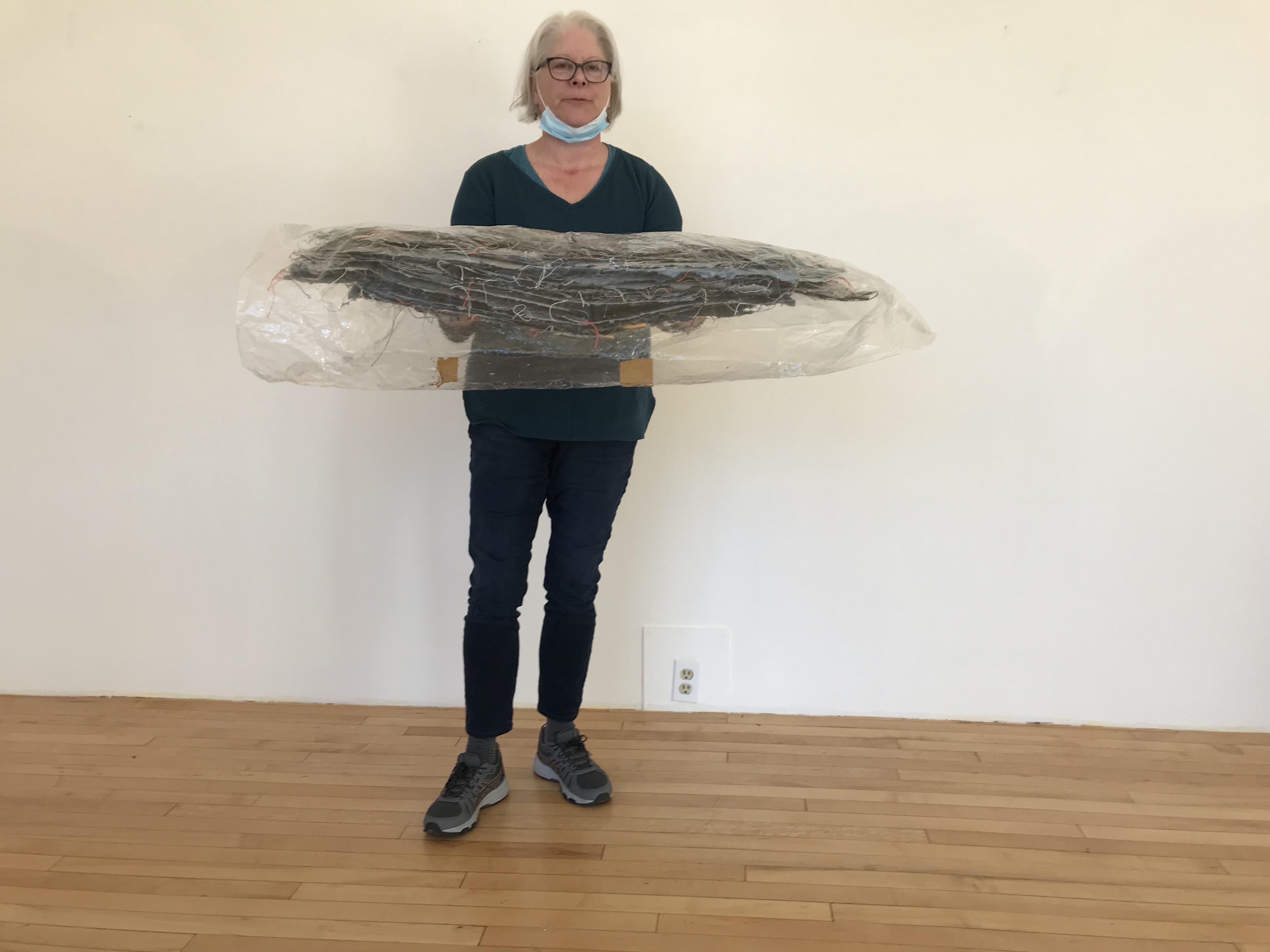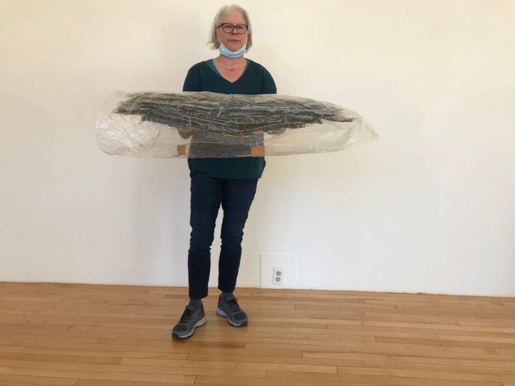 This artwork is designed to be very flexible and can pack and ship flat folded at the thread parts. Here is a photo of Jami holding all the artwork folded up to ship to Rowan University.