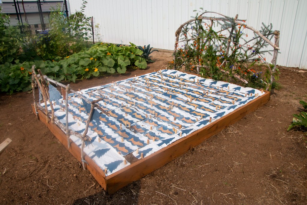 Jane Ingram Allen, Living Quilt for Nestucca Valley, Cloverdale, Oregon (in school garden of K-12 Nestucca Valley School) shown at installation on August 13, 2021, 8 feet x 10 feet x 5 feet, mixed media art installation of handmade paper, dye, thread, soil, boards, branches, created with participants in Summer Youth Art Program of Sitka Center for Art & Ecology, photo by Timothy S. Allen
