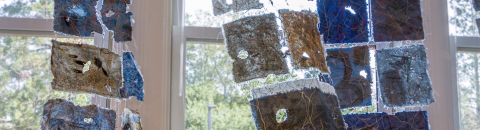 Jane Ingram Allen and Jami Taback, In Deep Water – Rising, 2022, Gallery Route One, view, mixed media installation, hand papermaking, printmaking, thread, burning, multiple suspended panels, each about 1-2 feet wide and 8-10 feet long.