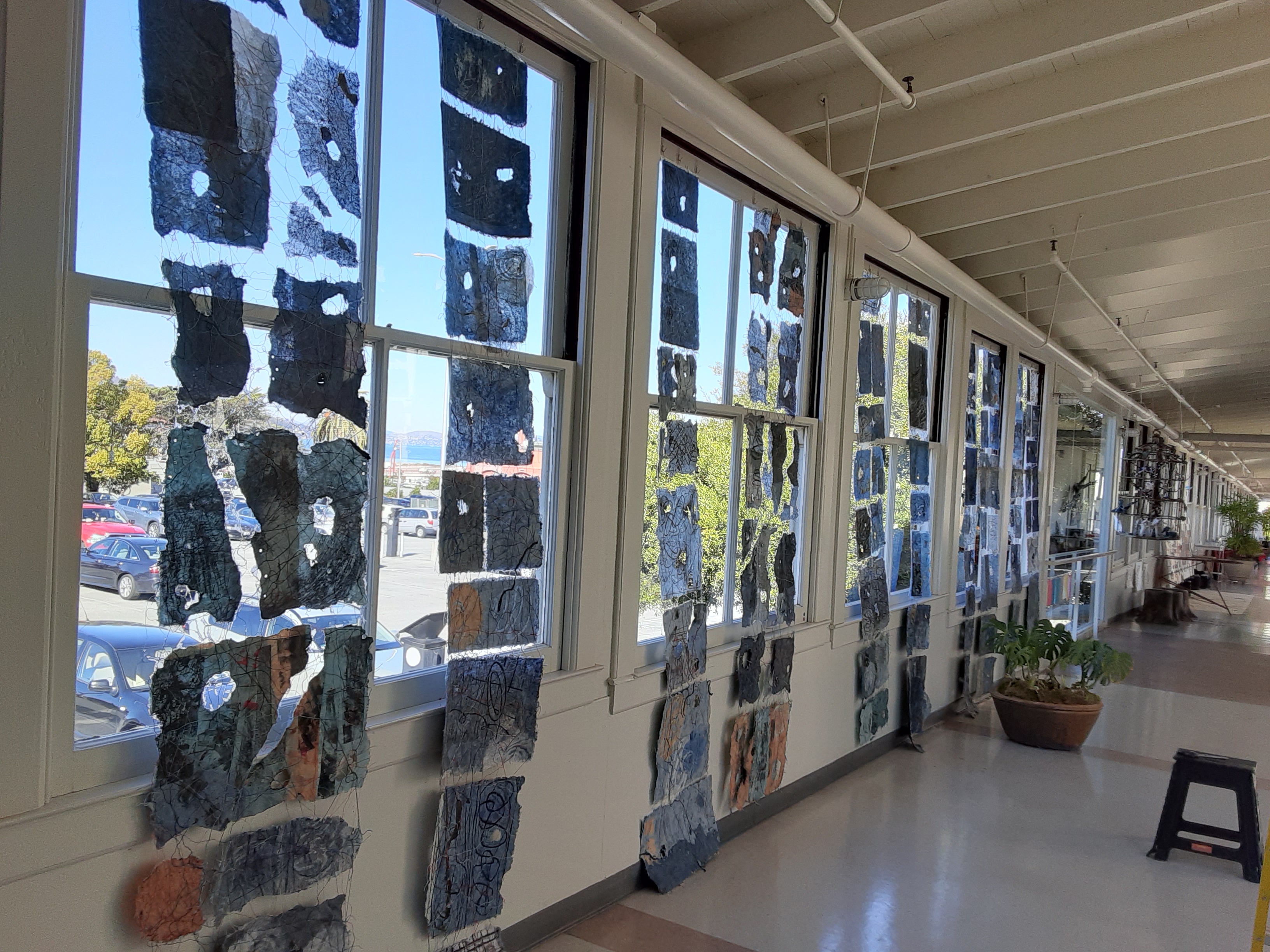 “In Deep Water – Turning the Tide”, by Jane Ingram Allen and Jami Taback, installed Nov. 13, 2022, at Tides Converge Gallery, the Presidio, San Francisco, 30 panels of handmade paper, thread, printmaking and collage, each panel, 2 feet x 10 feet, on view through March 2023 during gallery hours, M-F, 9am to 5pm.