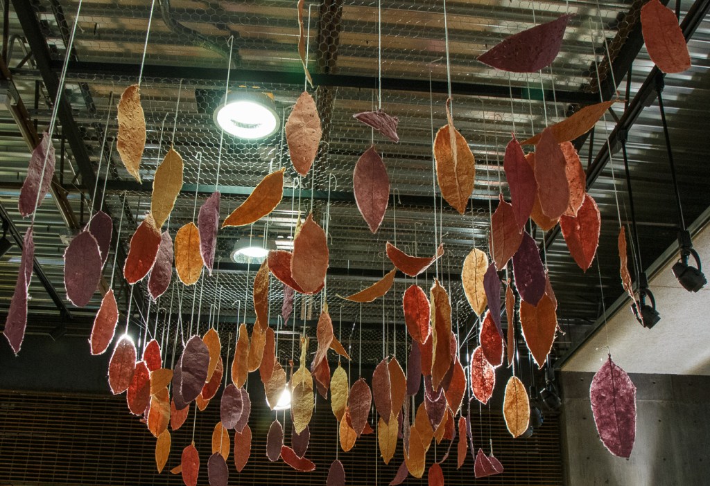 “Living Leaves” by Jane Ingram Allen, installed Nov. 29, 2022, at Pepperwood Preserve Art Gallery, Dwight Center, Santa Rosa, CA. 100 units each 12″ x 4″, handmade paper pulp, dye, thread, seeds for native grasses and wildflowers, to be planted outdoors after the indoor installation. Photo by Timothy S. Allenandmad