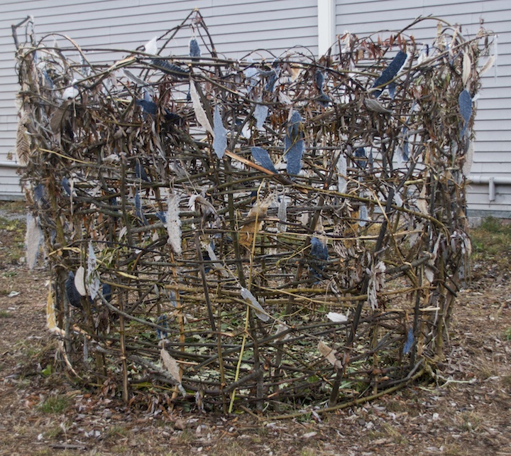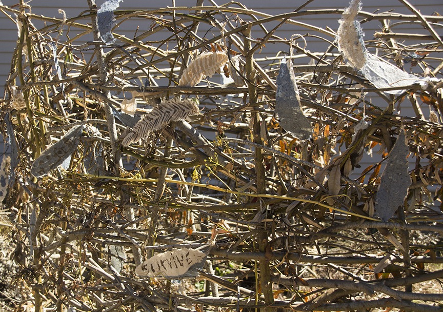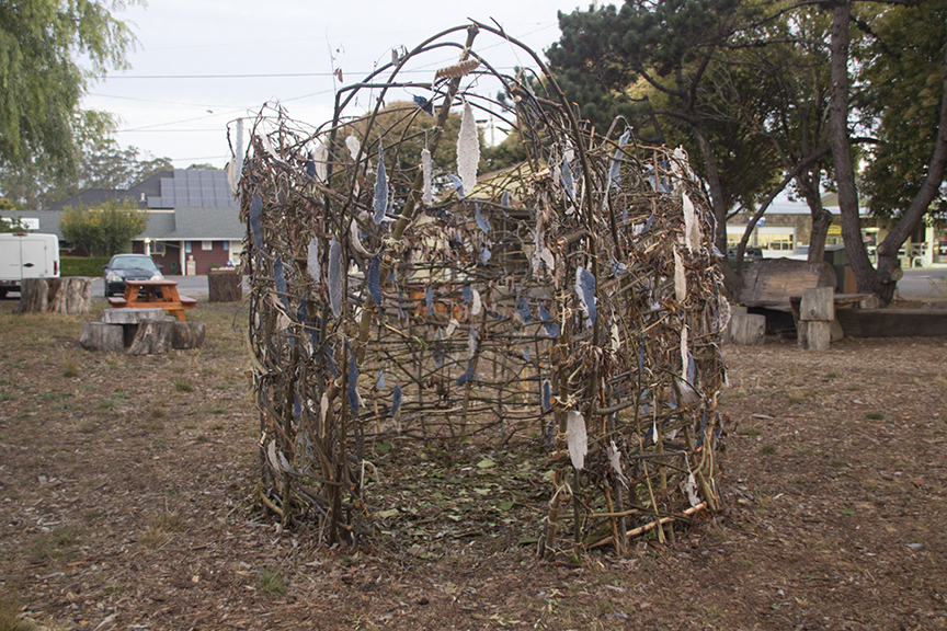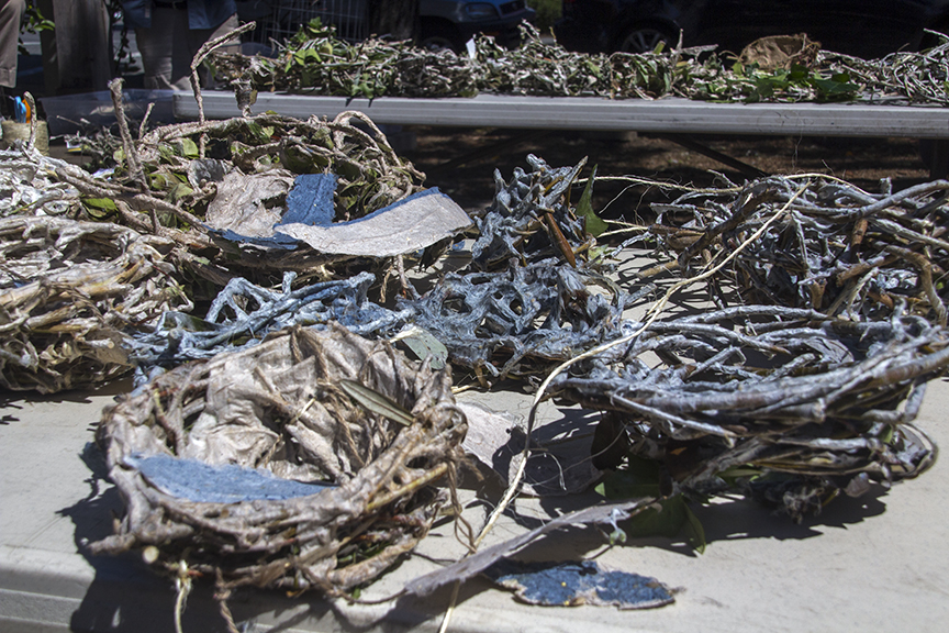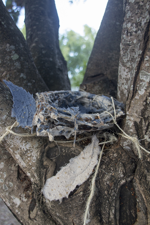 This artist-in-residency and public art project included the creation of a large bio-degradable nest sculpture of branches and handmade paper feathers in the Commons and the making of many small nests installed in trees along the main street in Point Reyes Station, CA. The artworks were created with the participation of students at West Marin Elementary School and community volunteers during Jane Ingram Allen’s artist-in-residency project in Point Reyes September 5 – 25, 2013. The children and volunteers worked with the artist to construct the large nest in the Commons and make many handmade paper feathers to line this nest as well as constructing smaller nests also lined with the handmade paper feathers. The handmade paper feathers are made from pulp created with local plant waste materials (leaves and bark) and have seeds to feed the birds in the pulp. 7 local plants were used to make the handmade paper for this project, and the birdseeds are the blend called “No Mess” because the seeds do not sprout. The children and adults wrote wishes for the earth and made drawings on the handmade paper feathers they created to hang on the “Nest” at the opening celebration on September 22. This art project was completed on September 22, and the handmade paper feathers tied onto the “Nests” for the birds to eat. The public art installation will be on view until December 1, 2013, or until it disappears as compost. It is hoped that this public art installation will raise more public awareness about birds in Point Reyes and the importance of preserving habitat and a clean environment “for the birds” as well as humans.