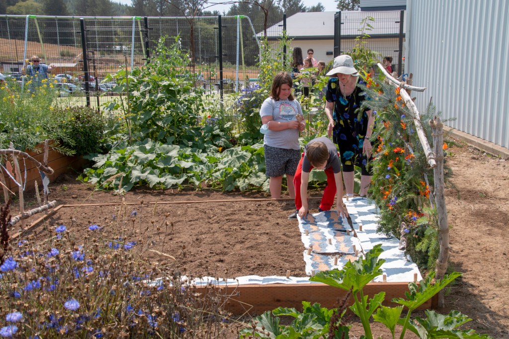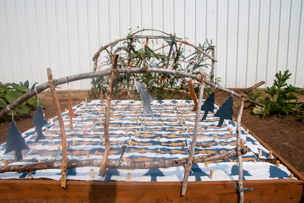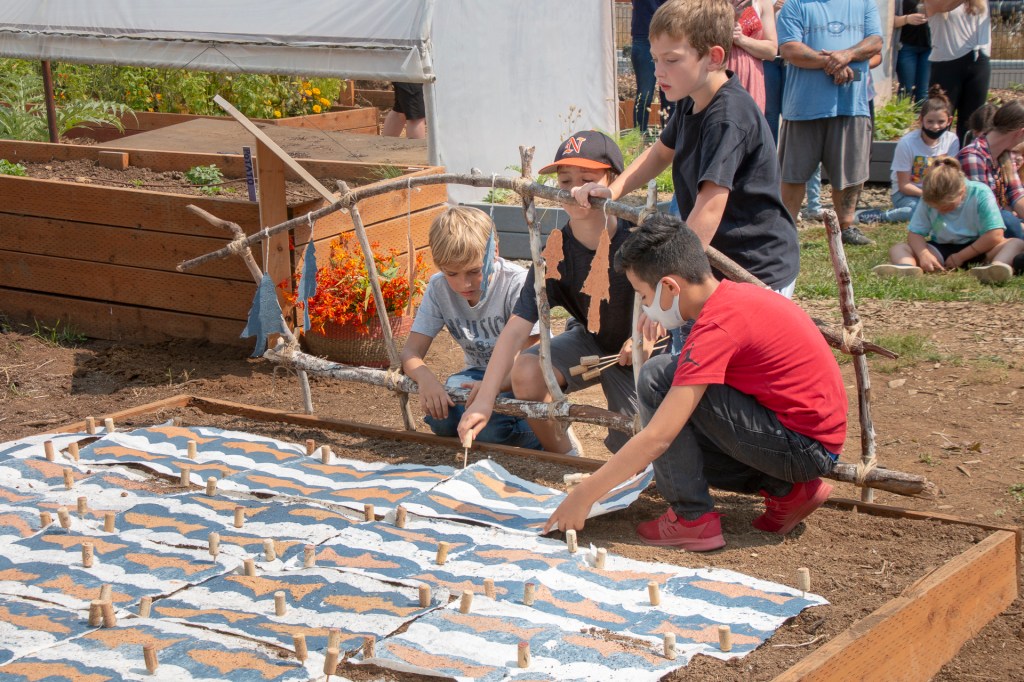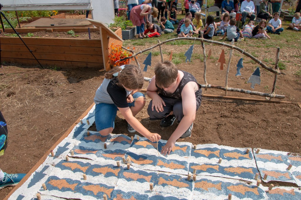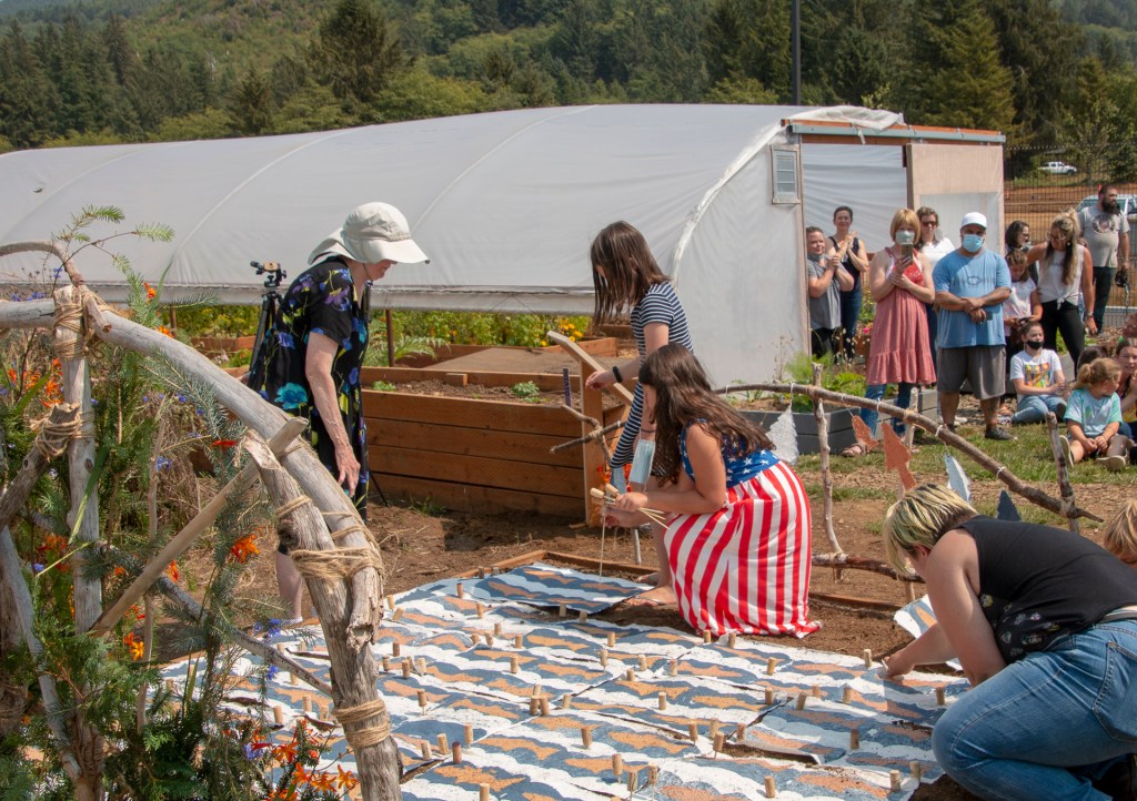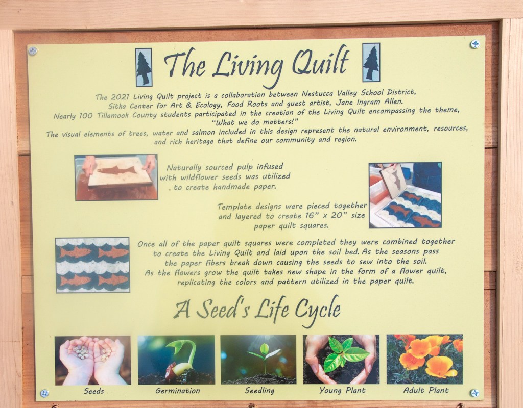 The “Living Quilt for Nestucca Valley” with its theme of environmental issues focused on forests, salmon and water was installed by the students at Nestucca K-8 School in Cloverdale, Oregon, on August 12, 2021. The “living quilt” project was part of the Summer Youth Program of Sitka Center for Art & Ecology (www.sitkacenter.org), and Jane Ingram Allen was a guest artist working with the students from August 1 – 12, 2021. The “living quilt” will transform over time into a living blooming bed of wildflowers in the same colors and patterns.