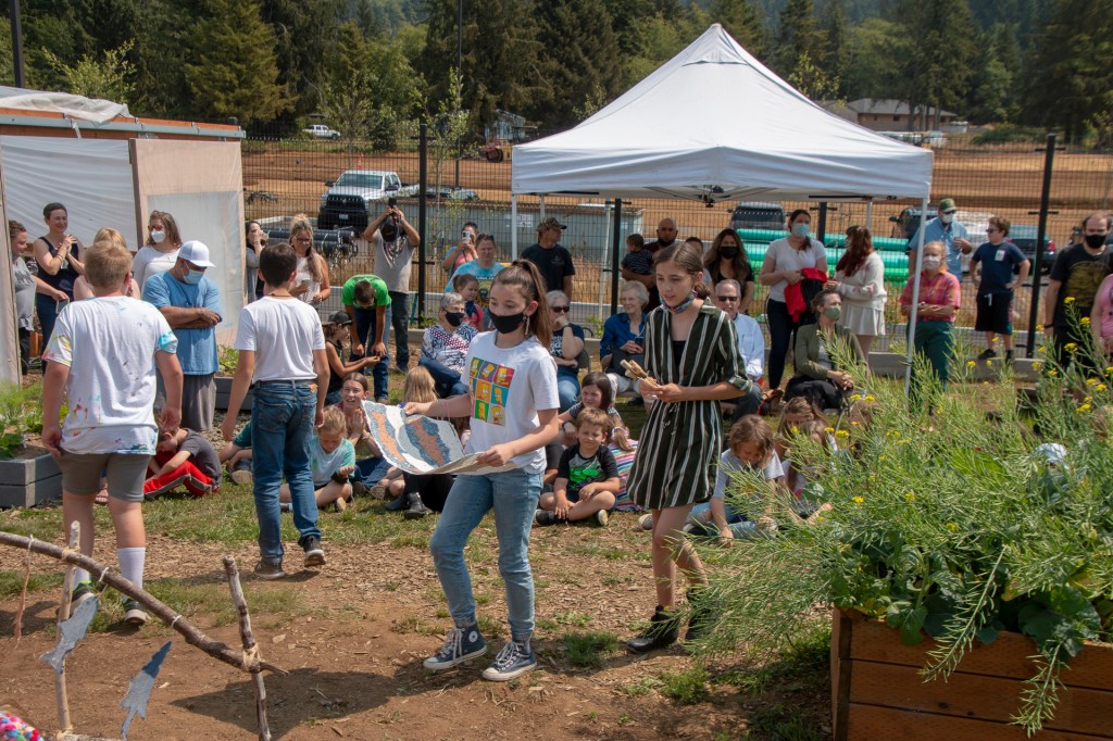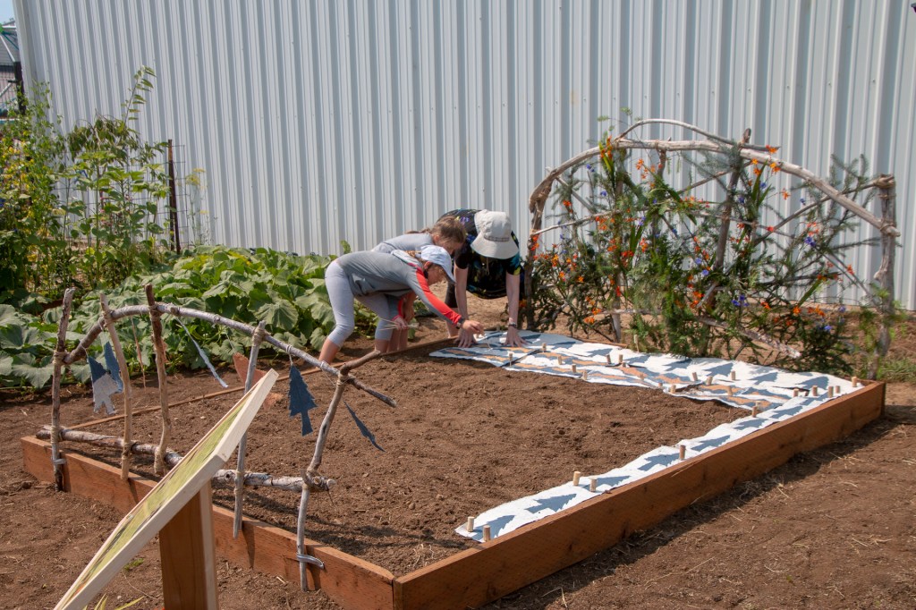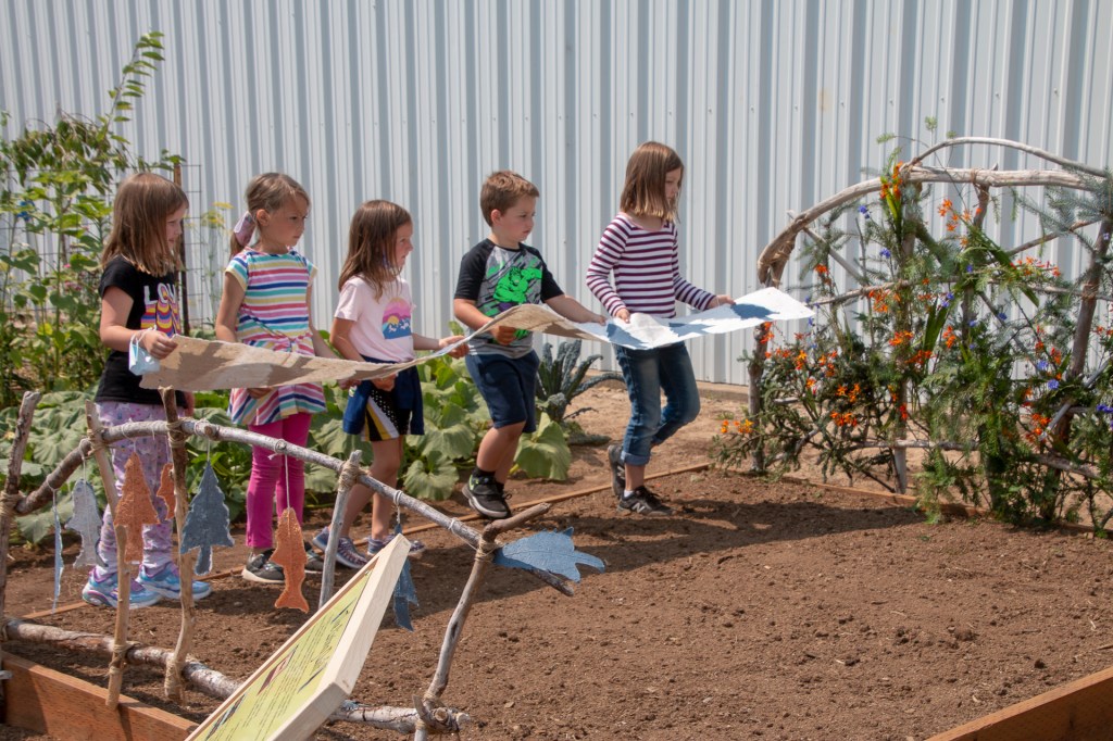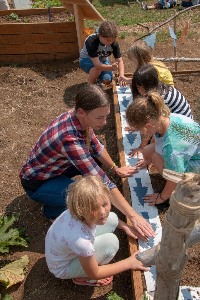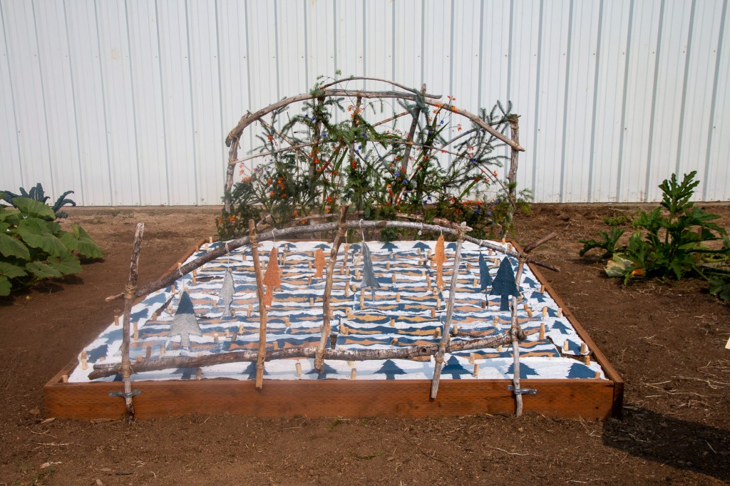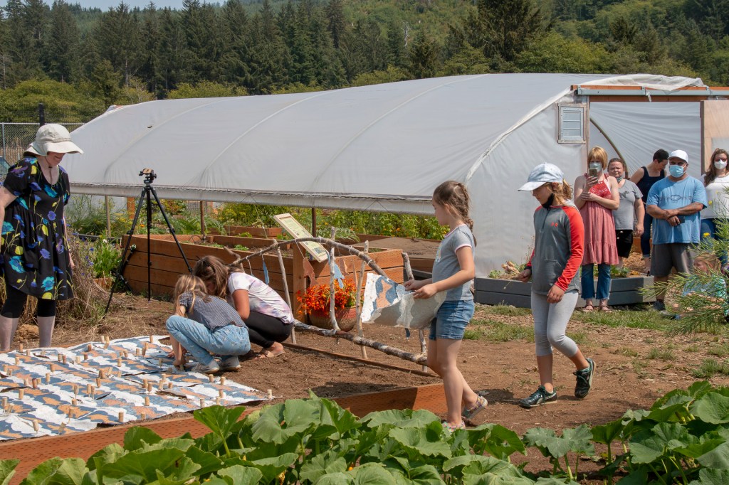 The “Living Quilt for Nestucca Valley” with its theme of environmental issues focused on forests, salmon and water was installed by the students at Nestucca K-8 School in Cloverdale, Oregon, on August 12, 2021. The “living quilt” project was part of the Summer Youth Program of Sitka Center for Art & Ecology (www.sitkacenter.org), and Jane Ingram Allen was a guest artist working with the students from August 1 – 12, 2021. The “living quilt” will transform over time into a living blooming bed of wildflowers in the same colors and patterns.