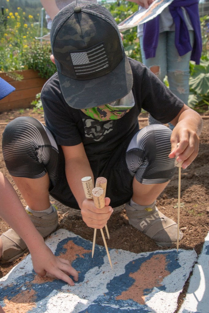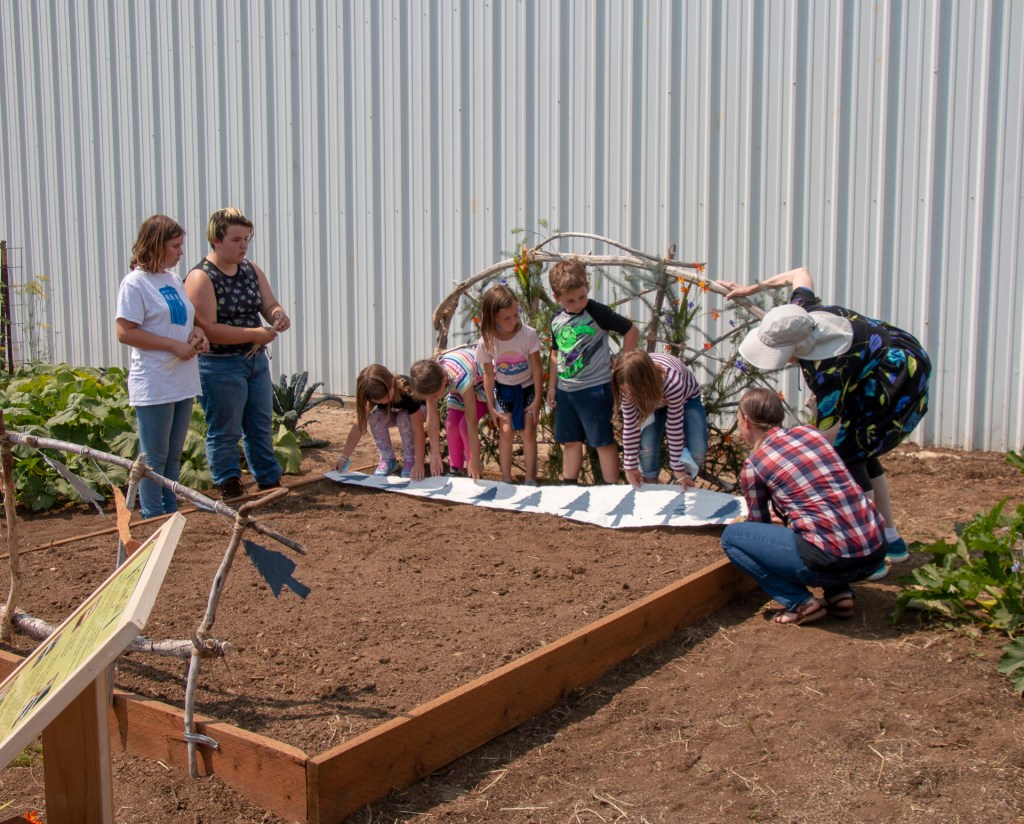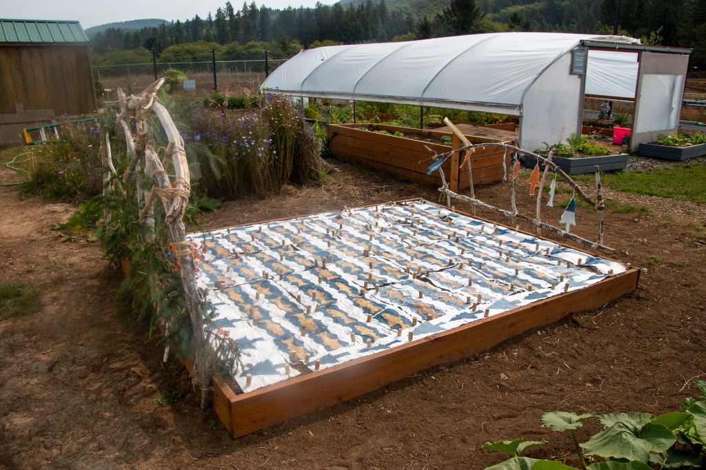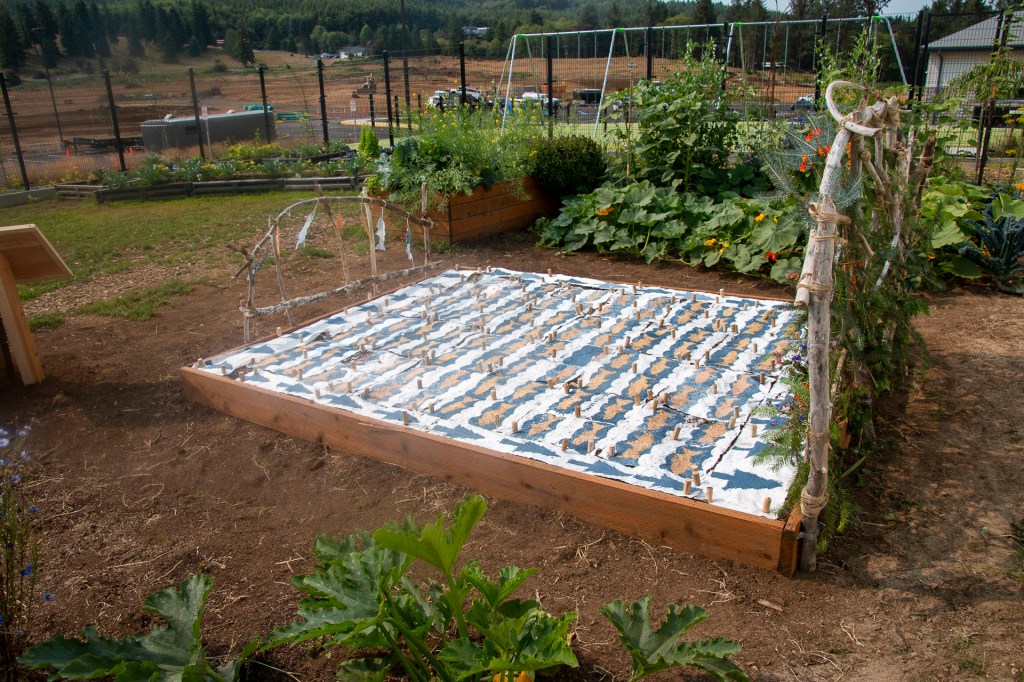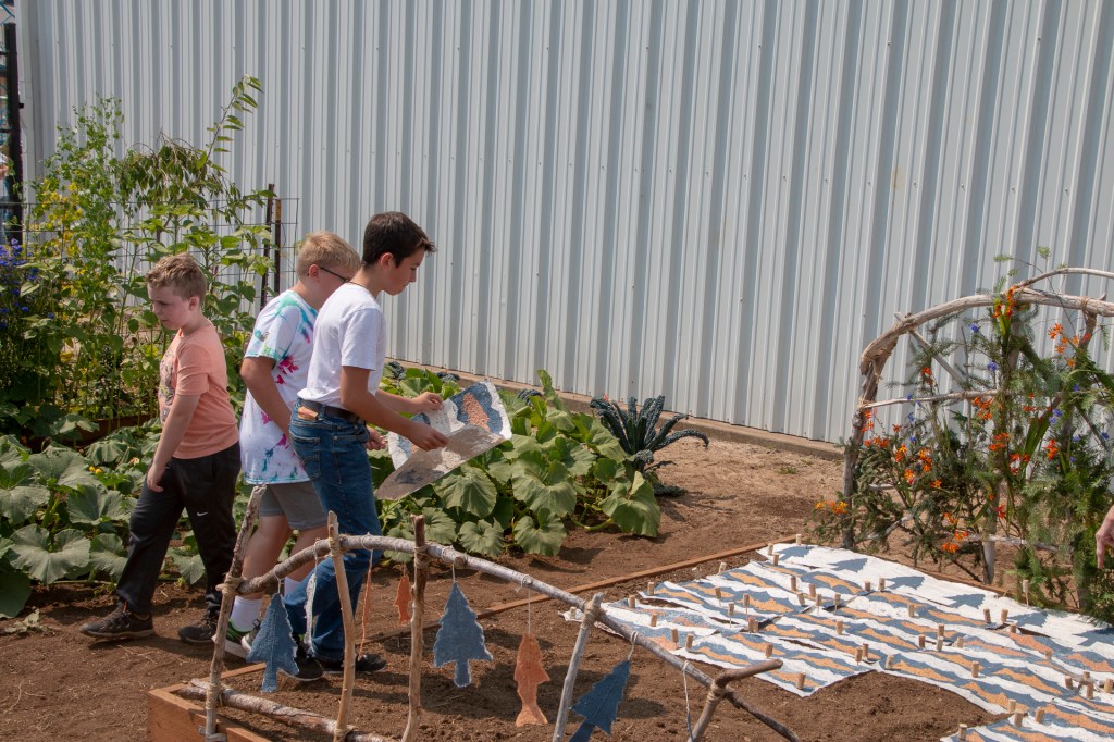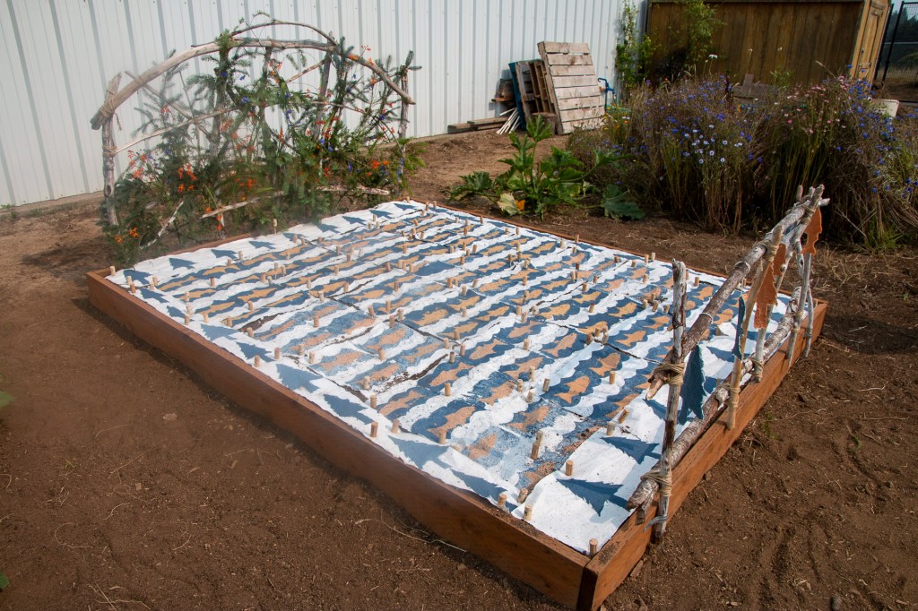 Kids in the summer youth program learned hand papermaking and created 24 blocks plus the 4 borders to make the “quilt”. Seeds for wildflowers in the pulp will sprout and grow and bloom in a few months in the same colors and pattern. Thank you to the Sitka Center for Art & Ecology for sponsoring the project and the Nestucca K-12 school for providing the site in the school’s garden area for this art installation.