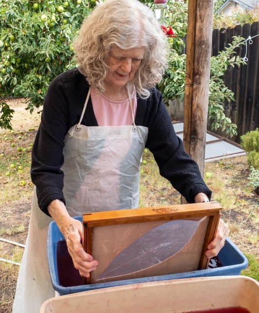 Jane Ingram Allen making handmade paper leaves in Spring 2023 at her Santa Rosa studio. All photos in this post by Timothy S. Allen, allentimphotos2.wordpress.com