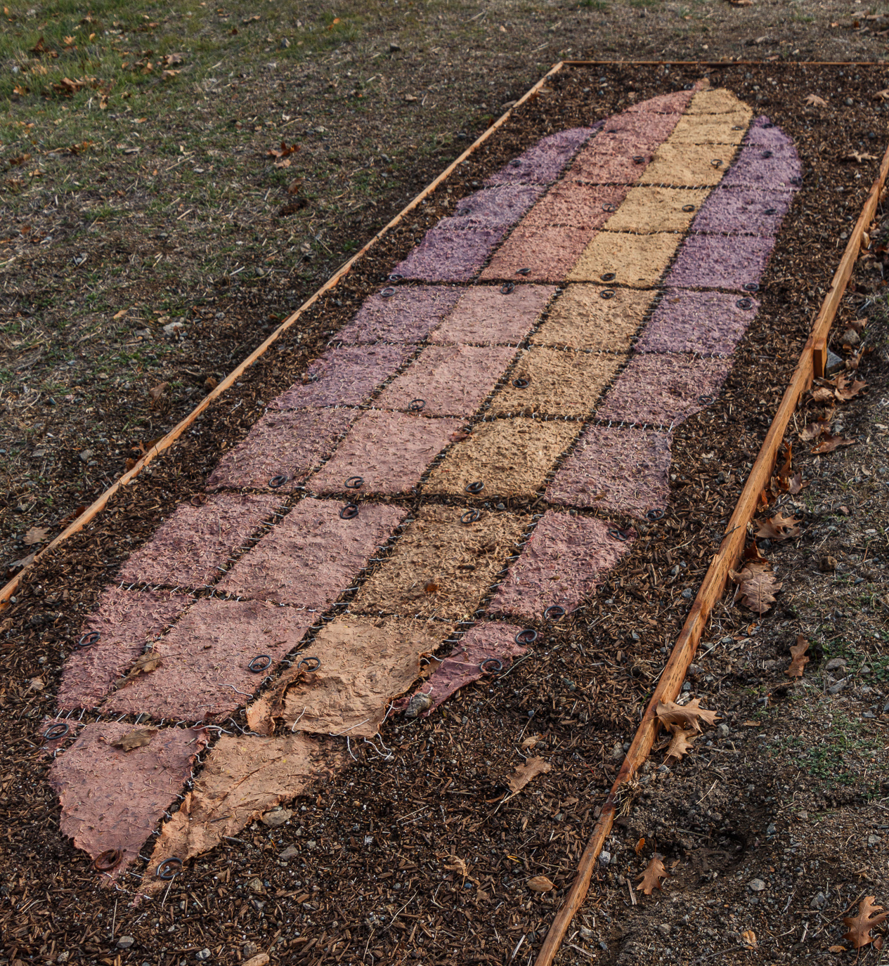 Jane Ingram Allen, Living Leaf for Pepperwood Preserve, 3 x 10 x 1 feet, handmade paper, dye, soil, seeds for native grasses, wood boards, 2023-24, installed at Pepperwood Preserve, Santa Rosa, CA
