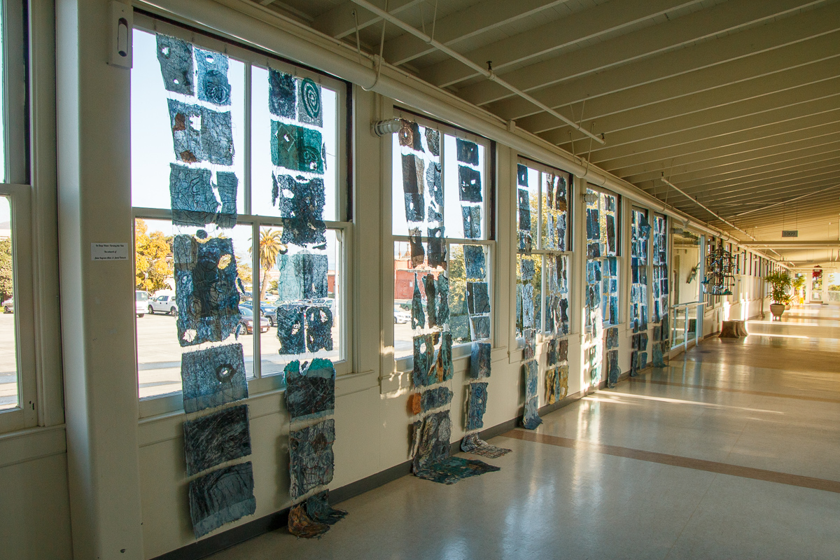 “In Deep Water” by Jane Ingram Allen and Jami Taback, kozo fiber handmade paper, thread, printmaking, dye, installed here at The Tides Gallery, San Francisco, CA